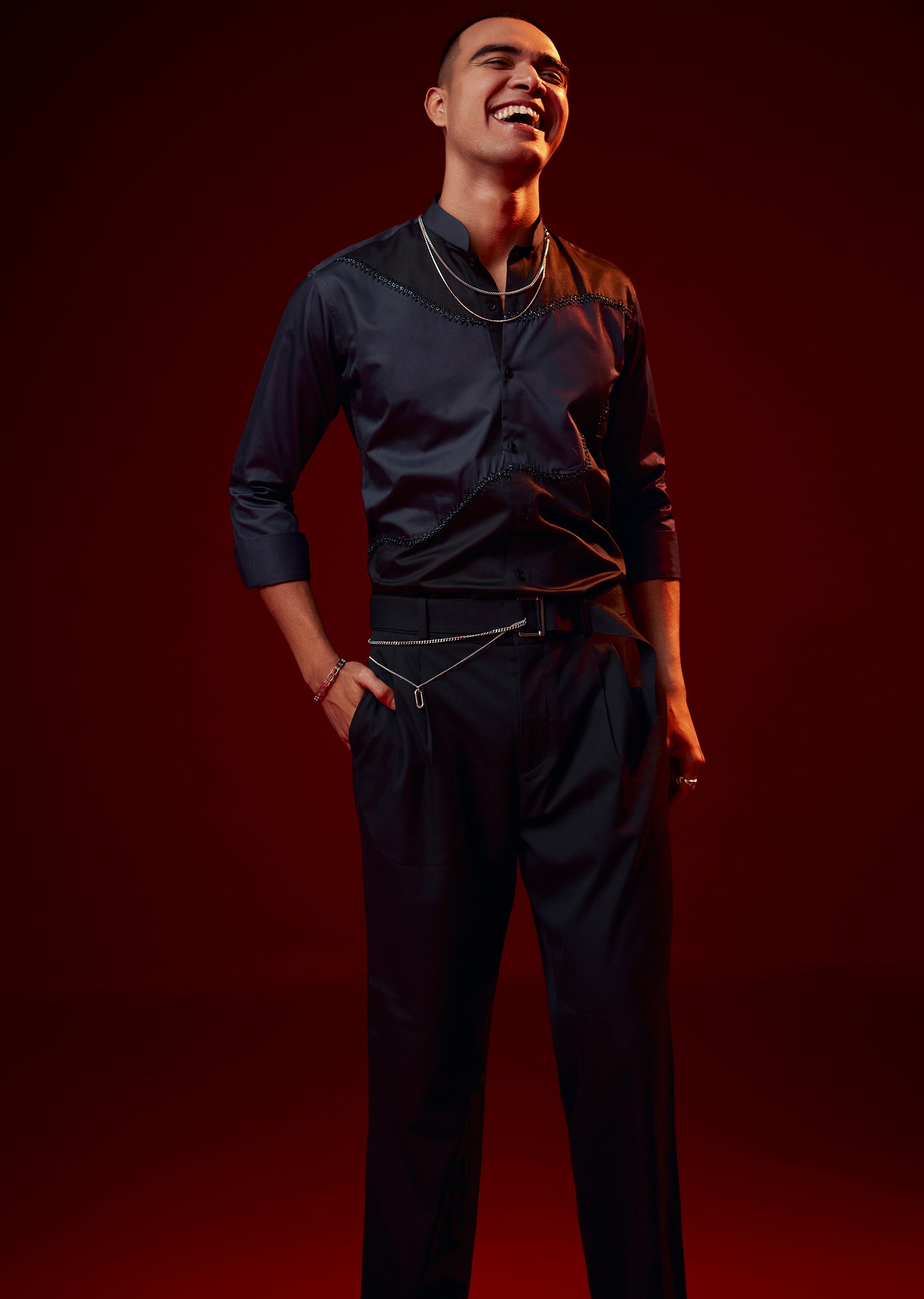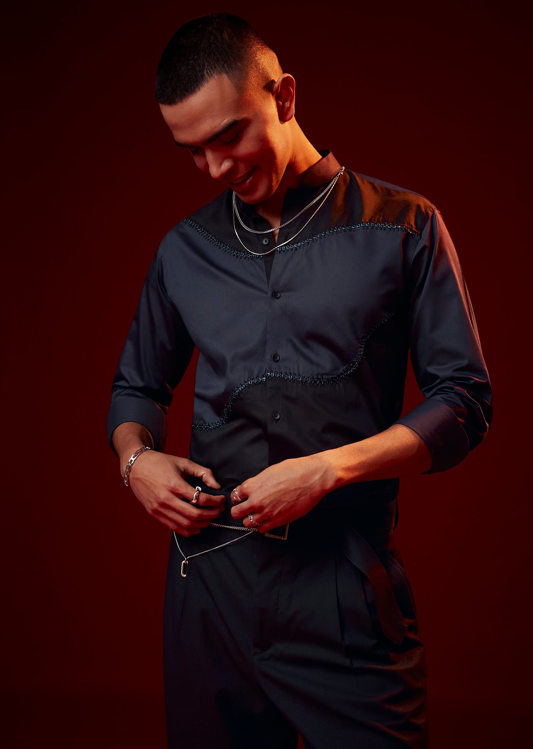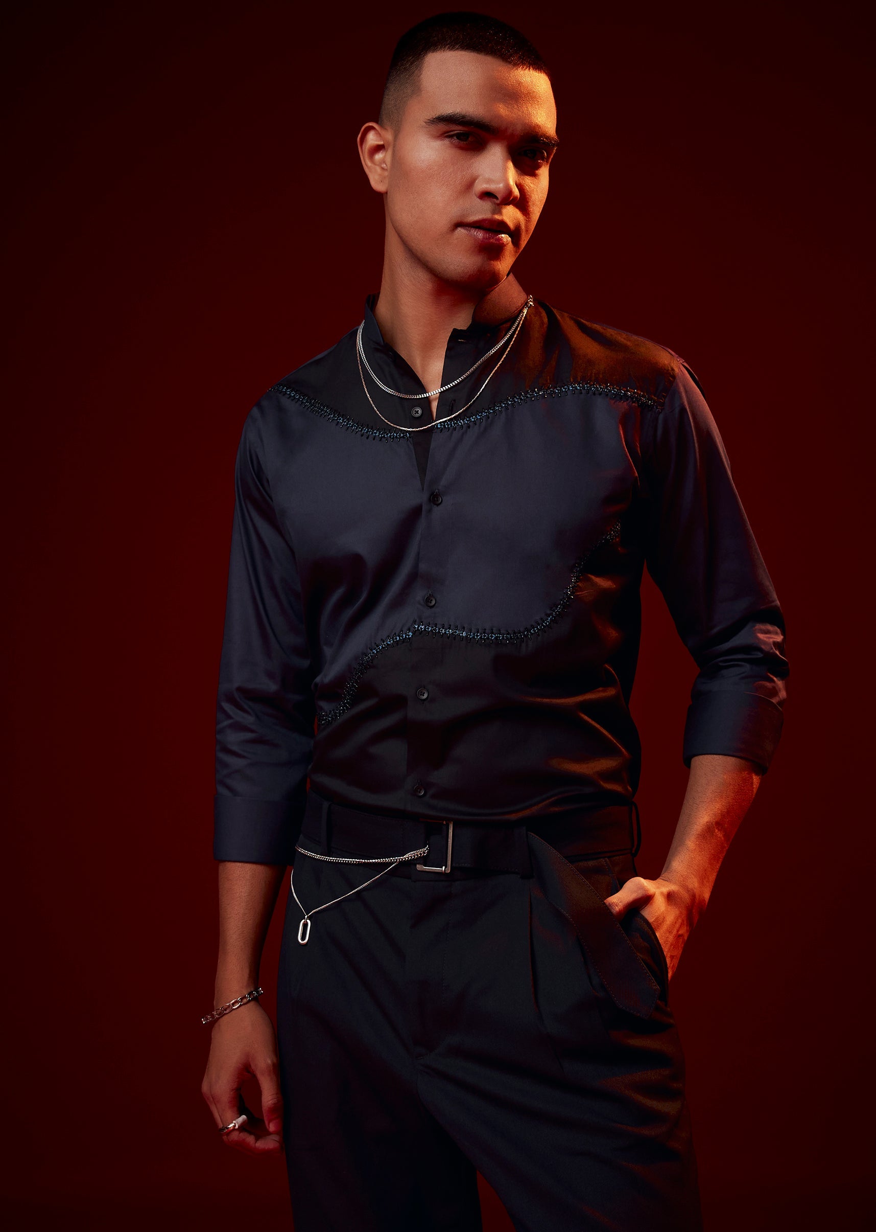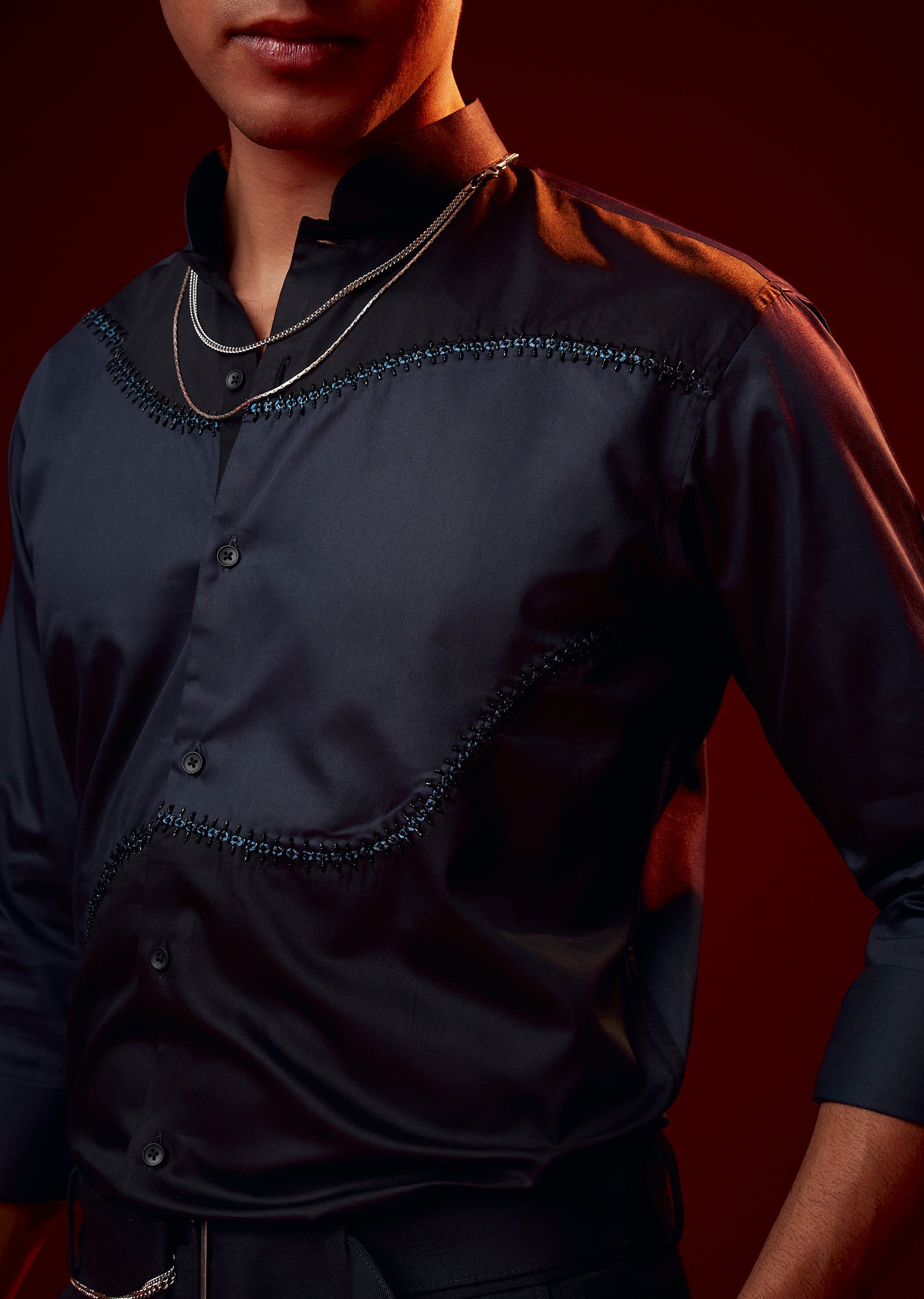 This blue festive shirt stands out with its thoughtful blend of patch work, bead accents, and thread detailing. Crafted in a silk blend with cotton, it balances texture, detail, and comfort in a way that feels polished yet wearable. The mandarin collar sharpens the overall silhouette, while the full sleeves complete its refined appearance, making it an excellent choice for festive evenings and special celebrations.