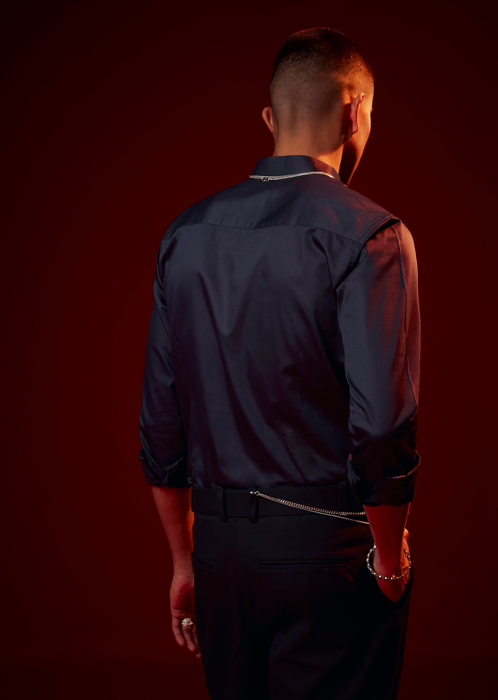 Pair with solid tailored trousers to let the shirt’s detailing stand out.
