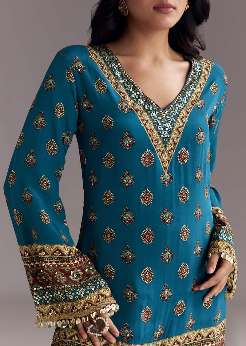A vibrant crepe kurta and dhoti set in blue featuring bold Ajrakh prints for a festive look with an edge. The kurta features flared sleeves and a flattering V-neckline, adding... More Product Details