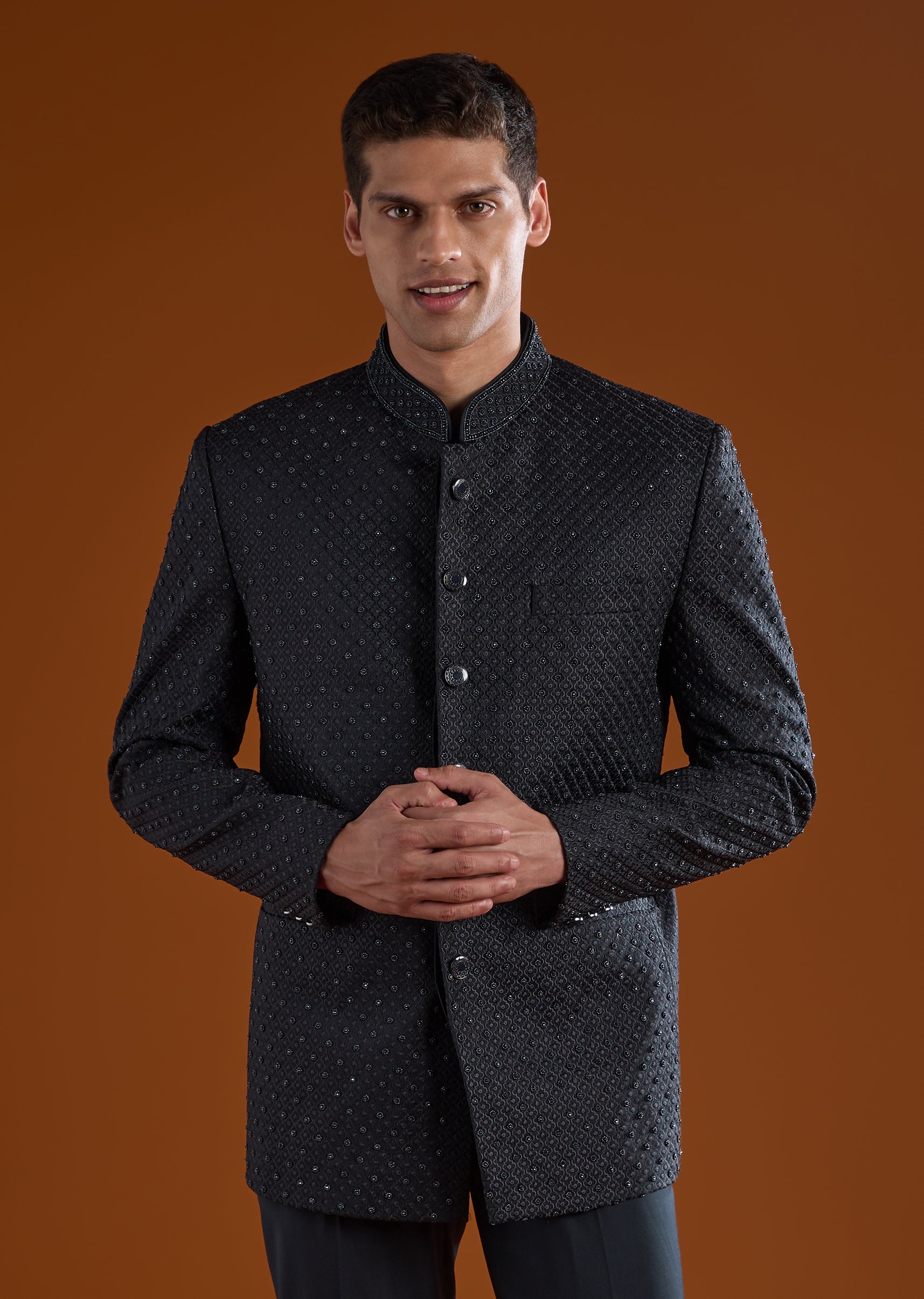 Designed for sangeet and reception celebrations, this blue jodhpuri brings together festive elegance and structured tailoring. Crafted in rayon and elevated with refined bead and thread work, it delivers a rich yet balanced aesthetic. The full sleeves and mandarin collar create a sharp silhouette, making it a confident choice for groomsmen during evening wedding functions. Awarded as the Most Trusted Brand, we're delivering styles you love, just as promised.