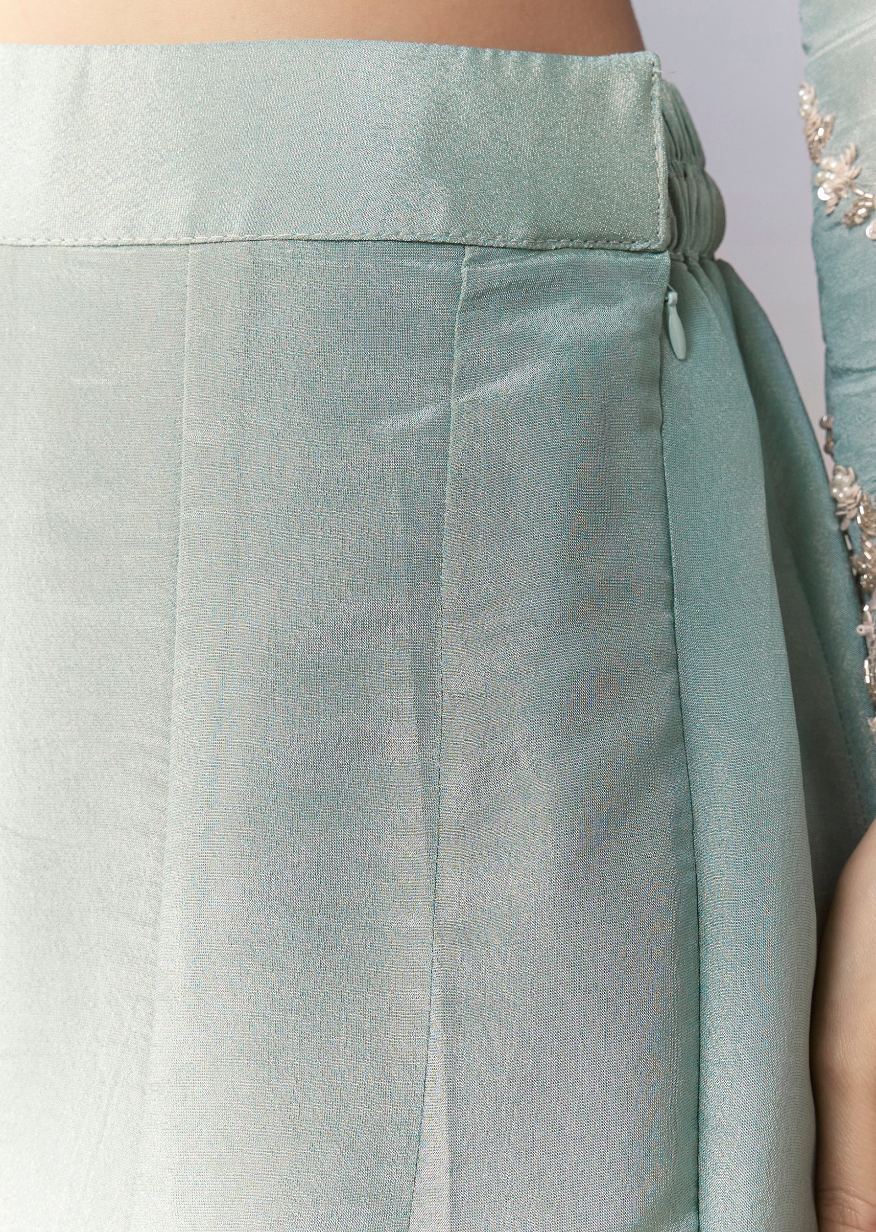 Ensure the anarkali fits smoothly at the bust and waist so the front slit drapes cleanly over the palazzo for an elegant, elongated shape.