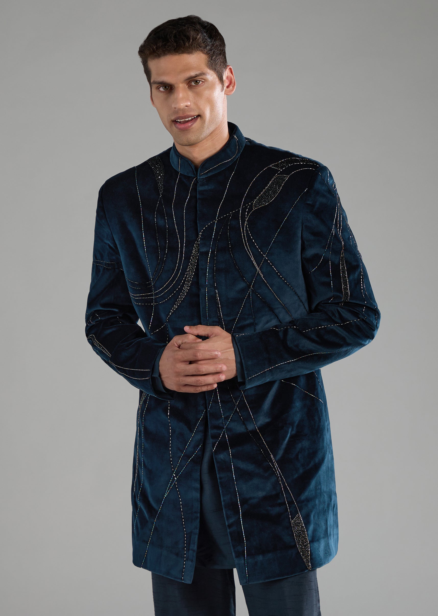Make a statement in this velvet indowestern set that catches the eye with its luxe sheen and dazzling sequin and cut dana detailing. The full sleeve mandarin collar design brings... More Product Details
