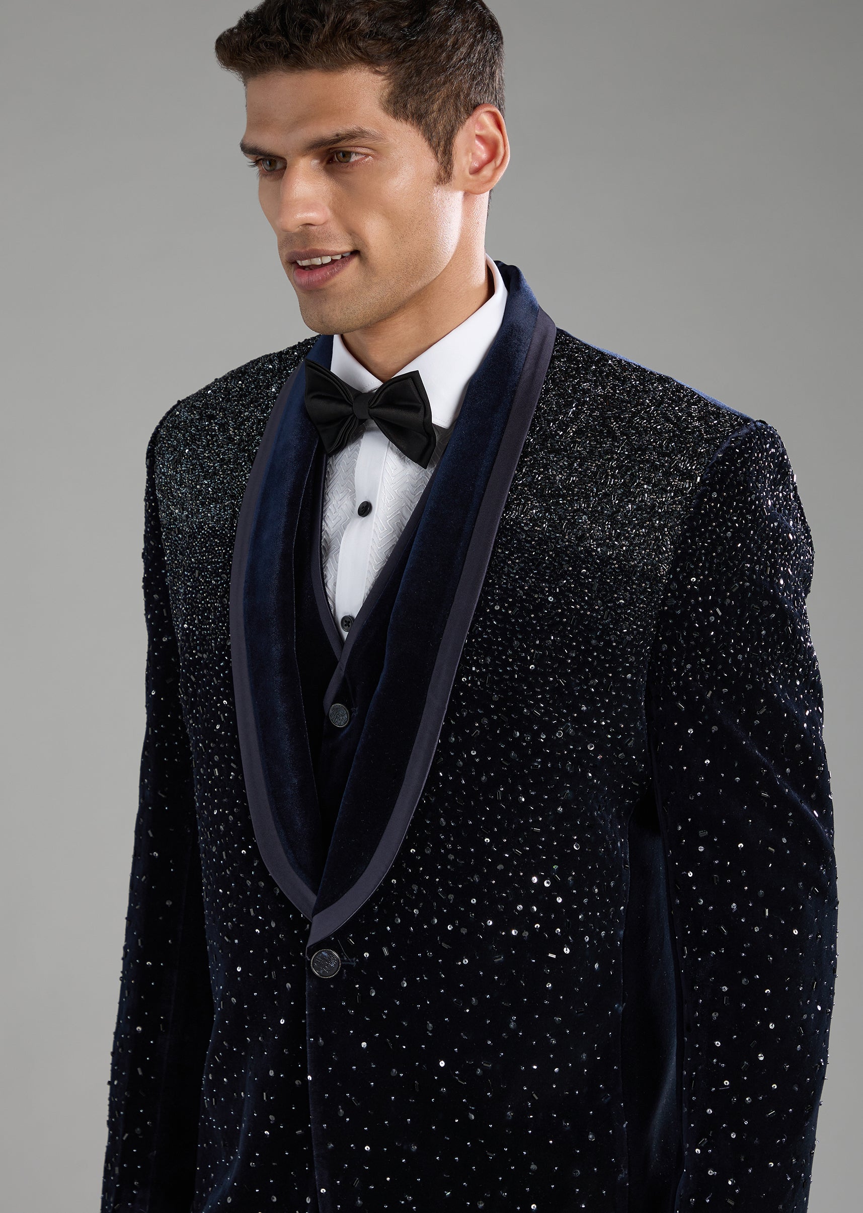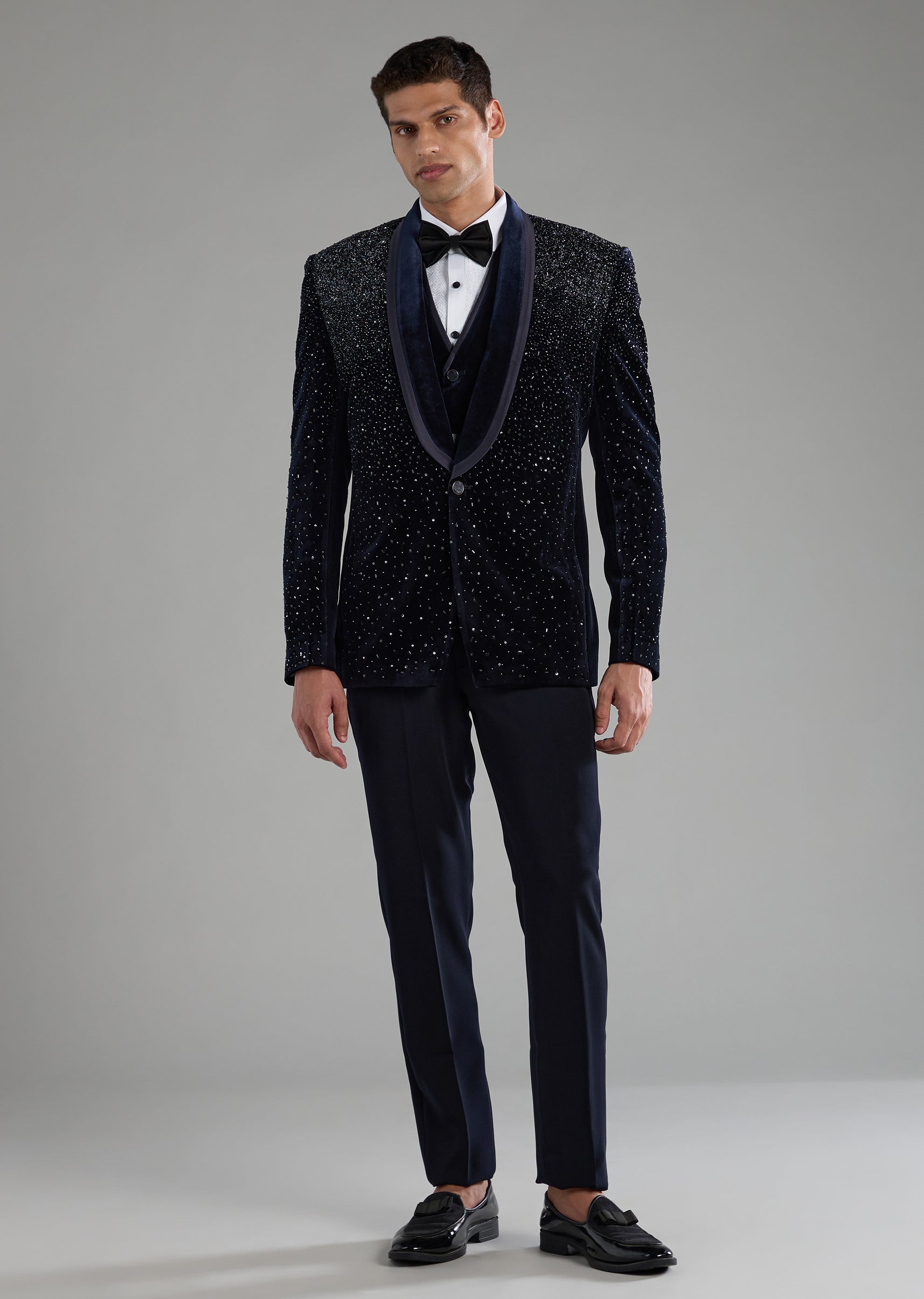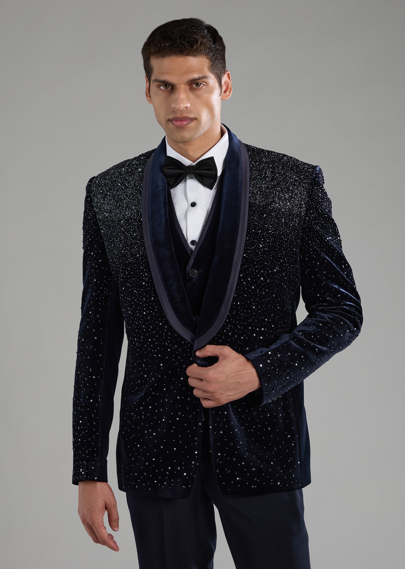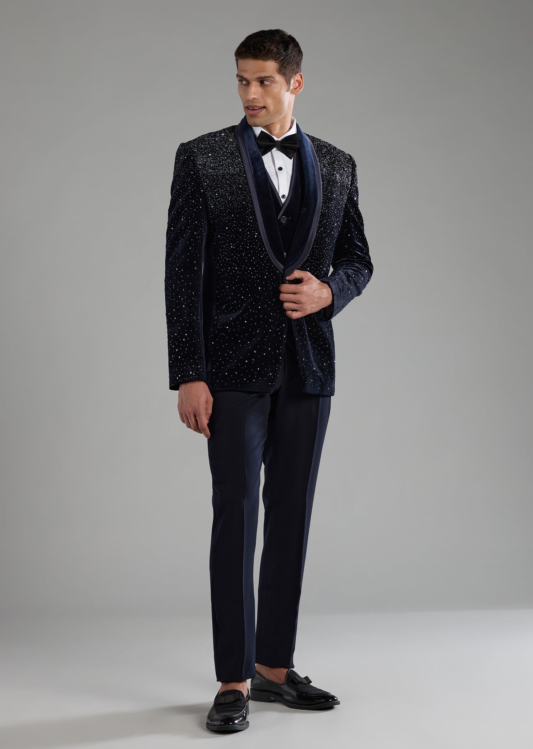 Blue Zardozi Embellished Tuxedo Set with Bow Tie
