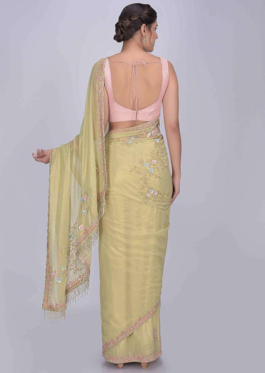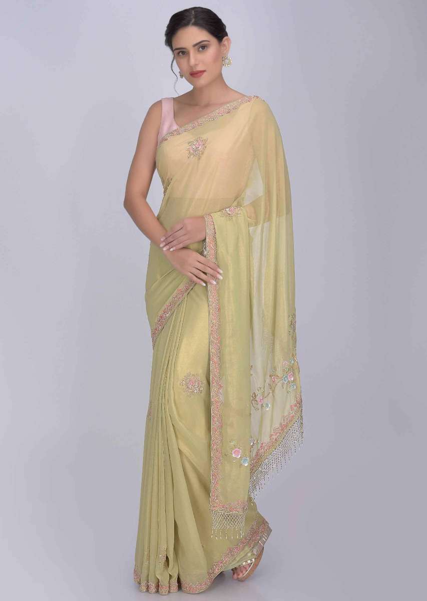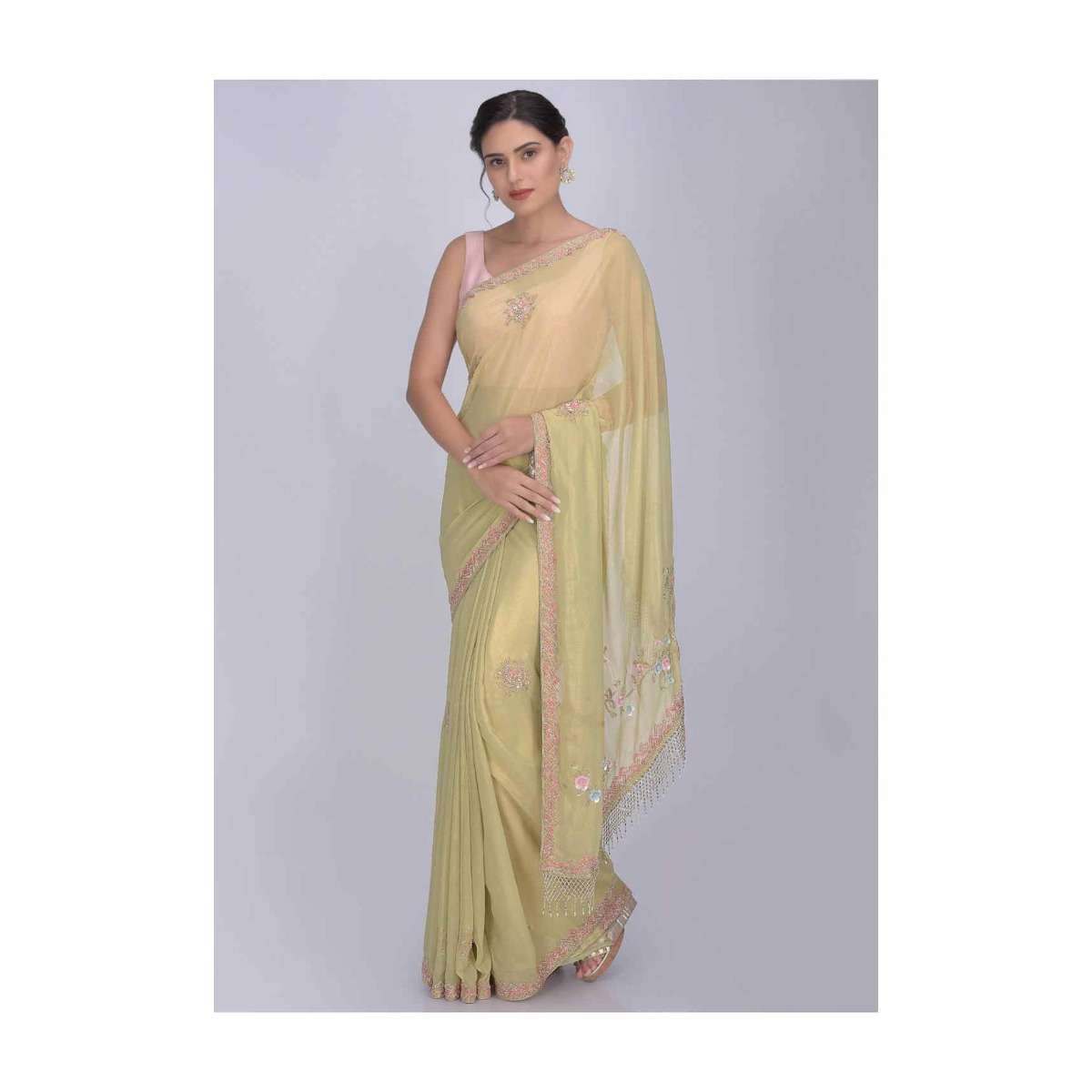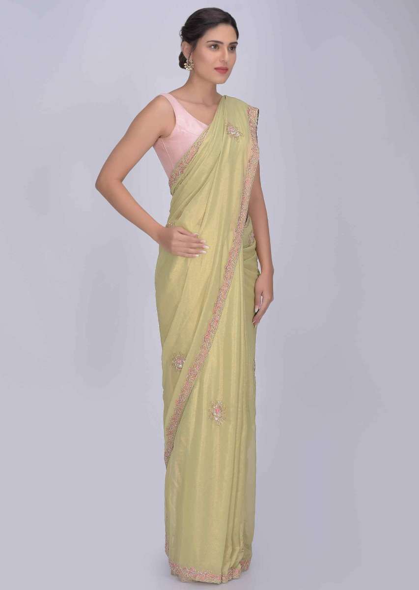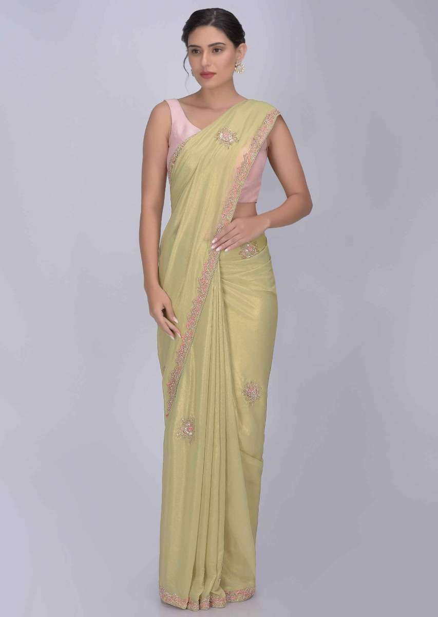 Bok Choy Green Saree In Shimmer Georgette With Matching Blouse Piece Online - Kalki Fashion