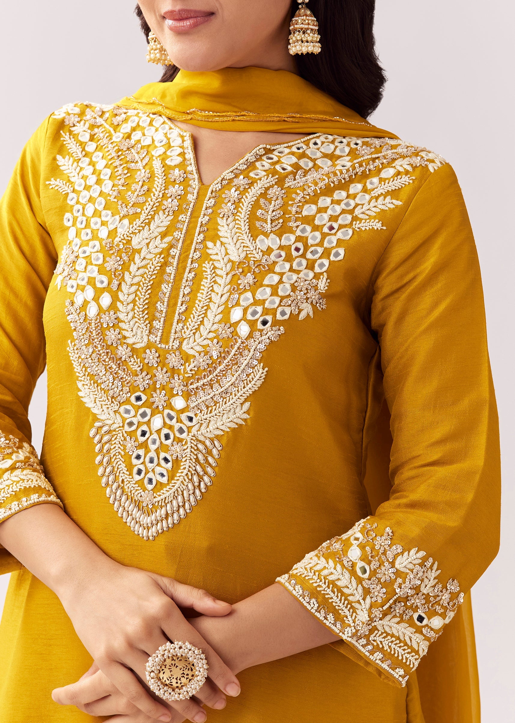 If childlike petite build, avoid oversizing—mirror work looks best when kurta sits neat. Style Tips: