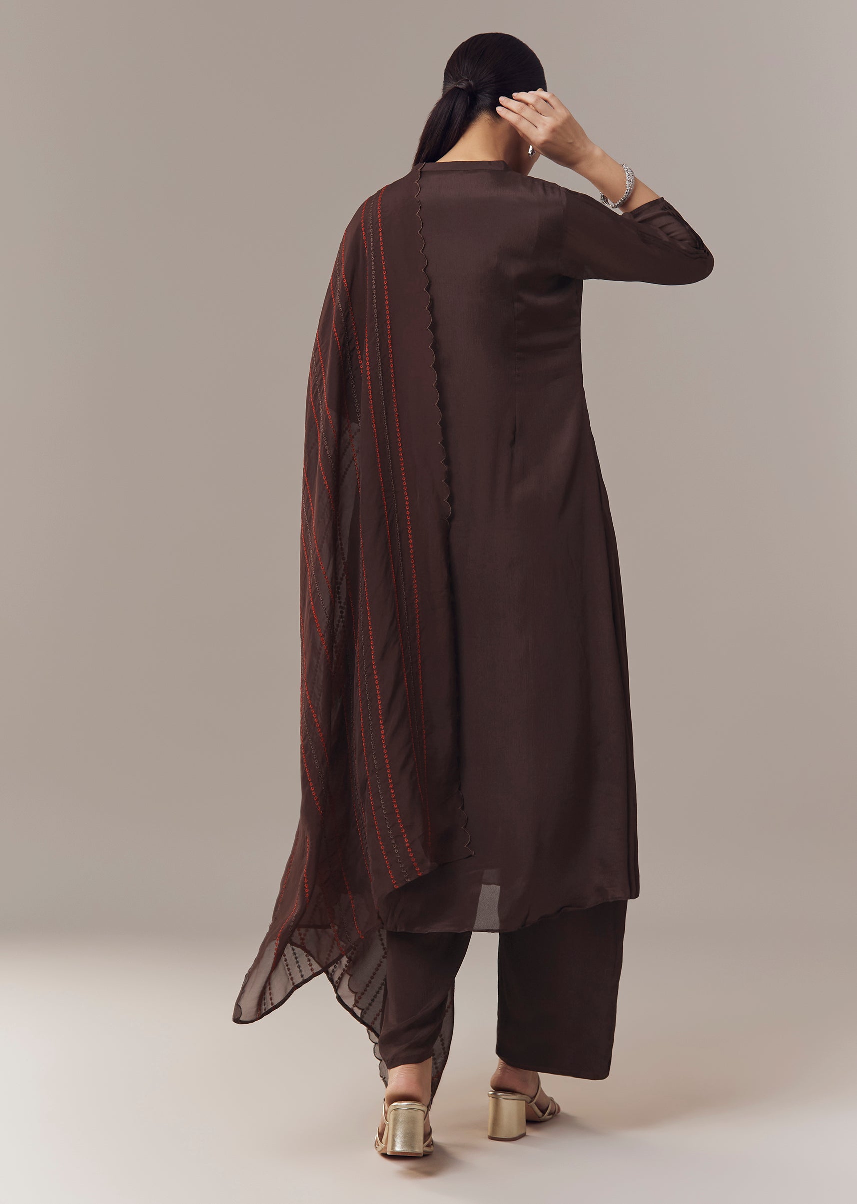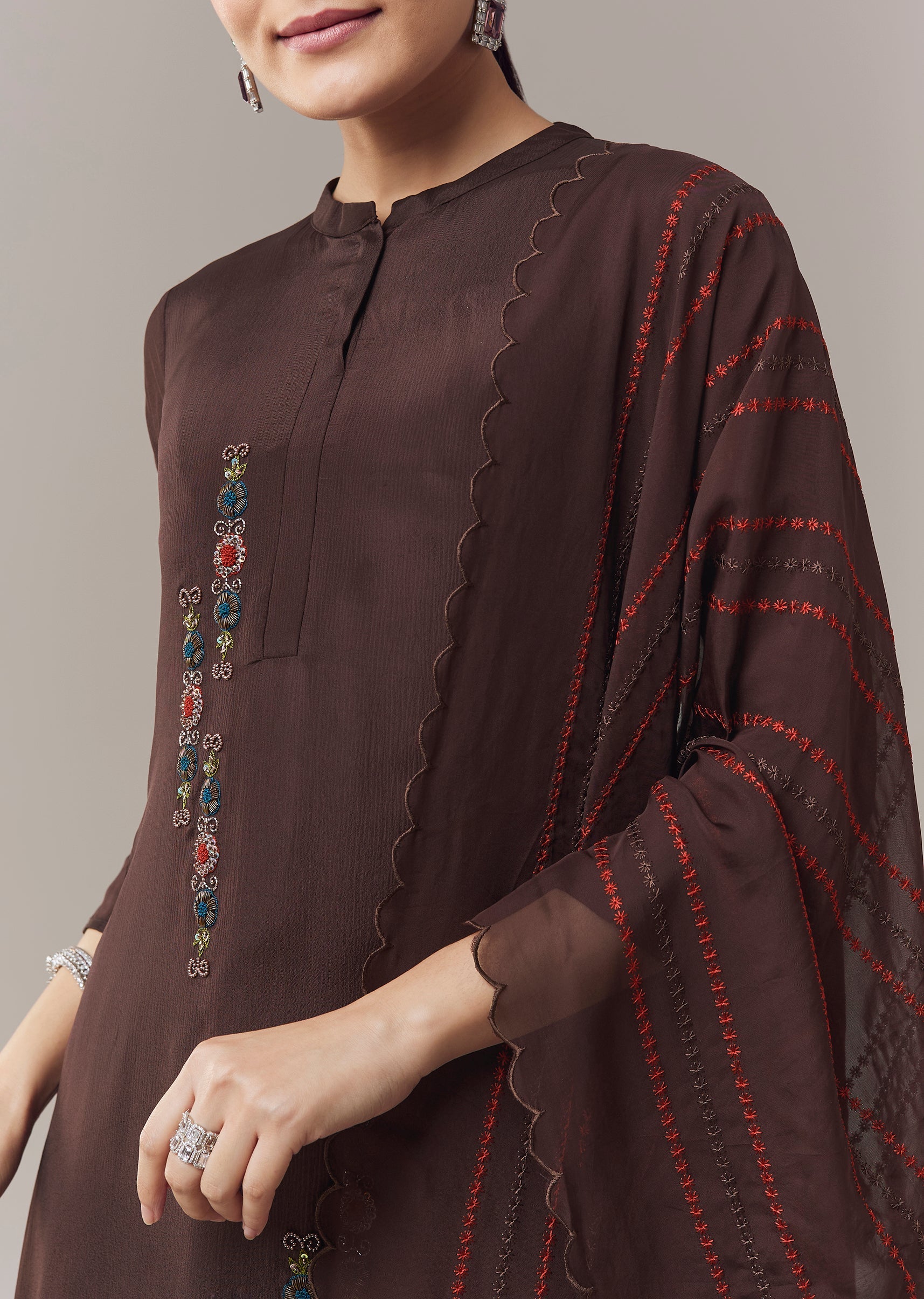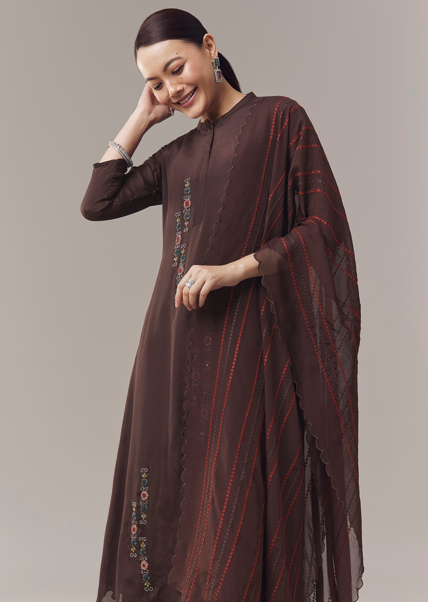 Elegant and casual, this brown anarkali suit is crafted in soft chinon fabric for a lightweight and comfortable feel. The anarkali is adorned with intricate beads, cut dana, and resham... More Product Details
