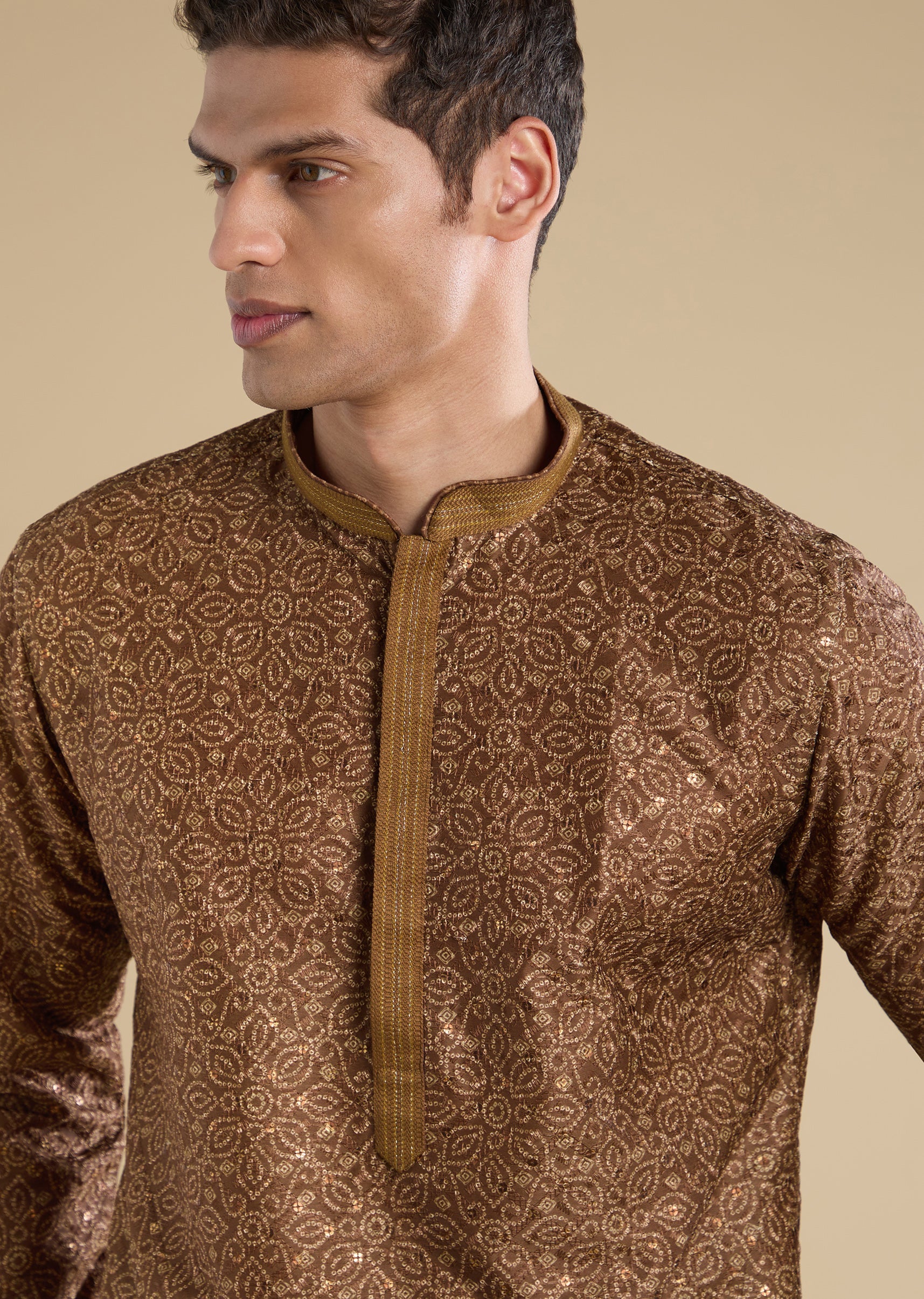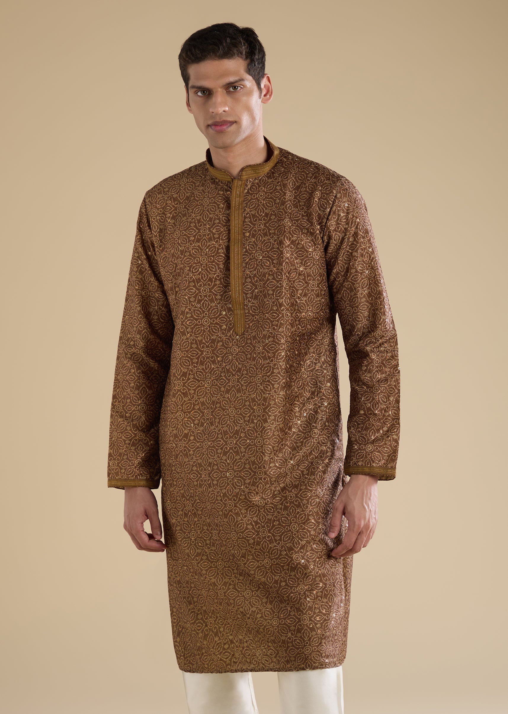 Warm and understated, this brown kurta set is designed for relaxed everyday wear. Crafted in a soft silk base, it features a mandarin collar, full sleeves, and subtle resham thread... More Product Details