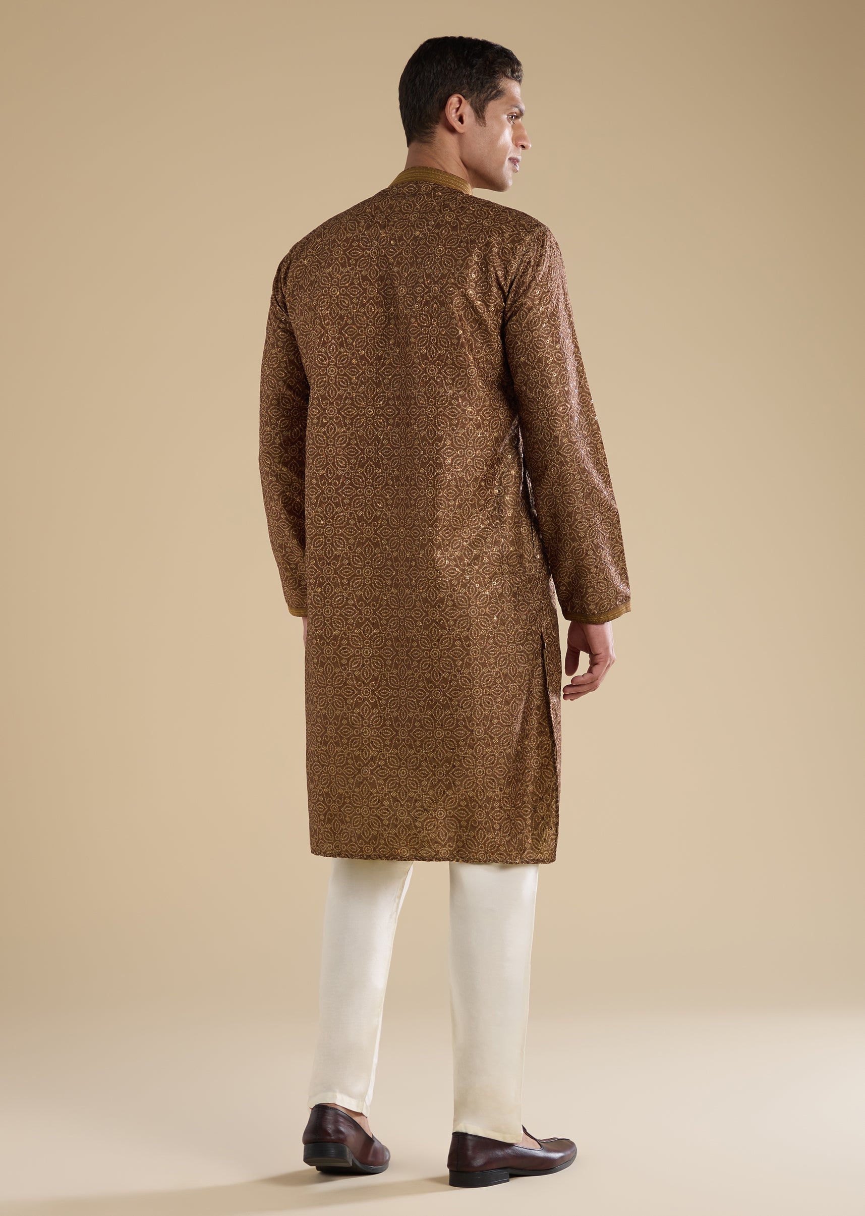 Warm and understated, this brown kurta set is designed for relaxed everyday wear. Crafted in a soft silk base, it features a mandarin collar, full sleeves, and subtle resham thread detailing for a clean, classic look. Paired with straight-fit trousers with an elasticated drawstring waist, this set ensures ease and comfort throughout the day. Awarded as the Most Trusted Brand, we're delivering styles you love, just as promised.