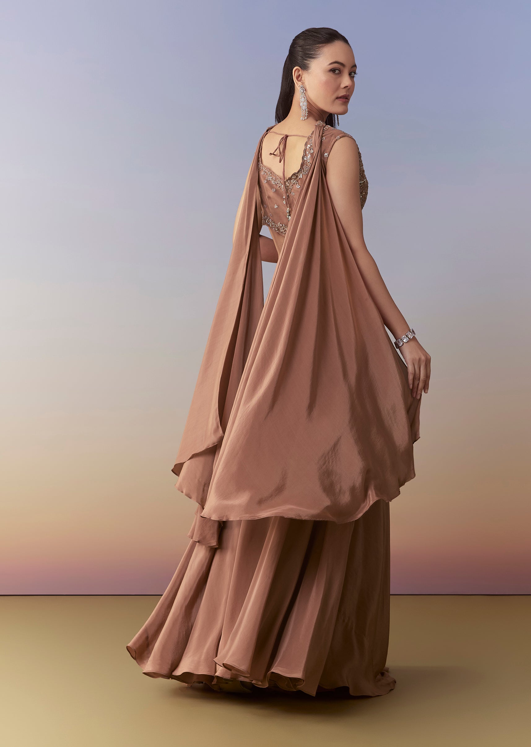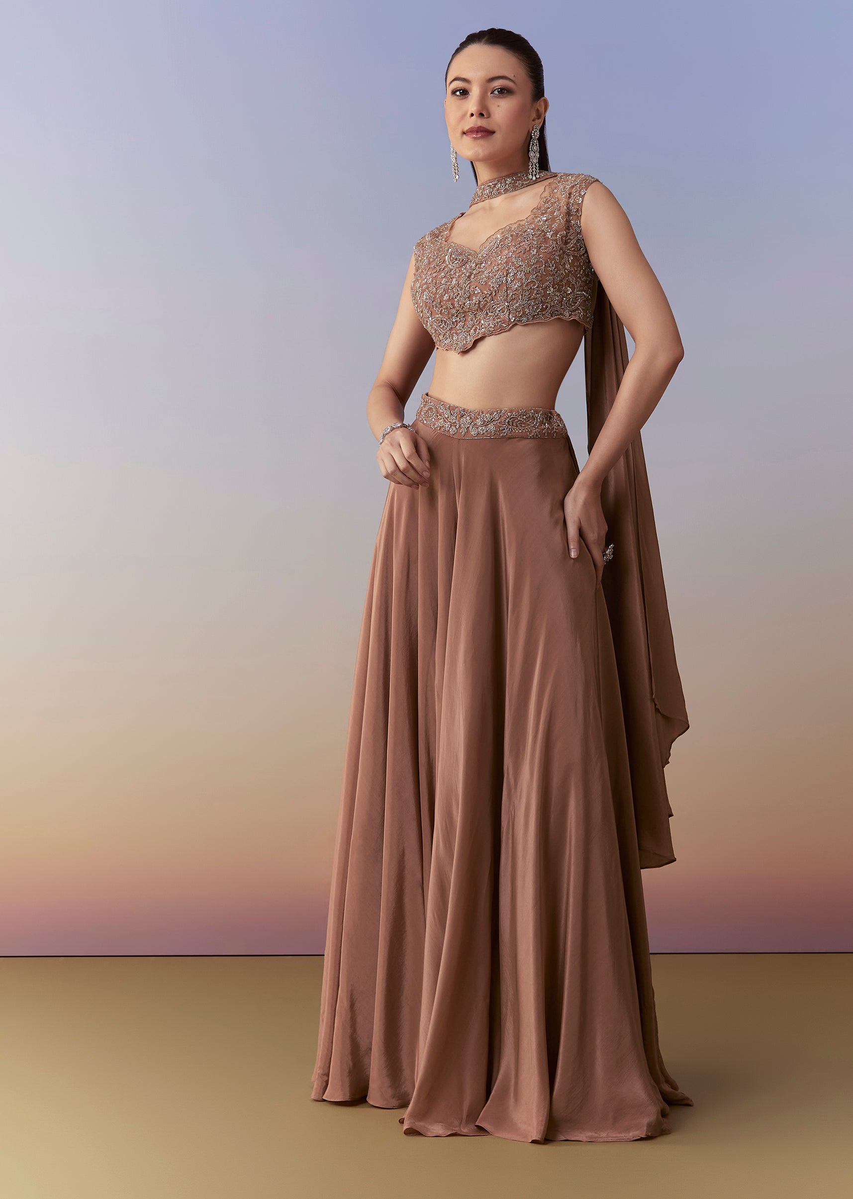Turn heads with this brown palazzo set, featuring a beautifully embellished crop top adorned with cutdana and bead work for a striking festive shimmer. The crop top’s stylish front fancy cut adds a modern edge, while the flowy palazzo and matching dupatta create an elegant, well-balanced silhouette. Perfect for weddings, sangeet nights, or special celebrations, this ensemble blends contemporary flair with refined detailing. Awarded as the Most Trusted Brand, we're delivering styles you love, just as promised.