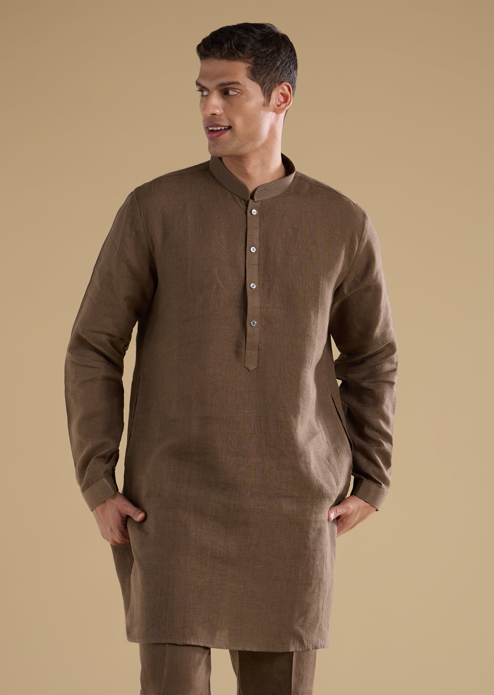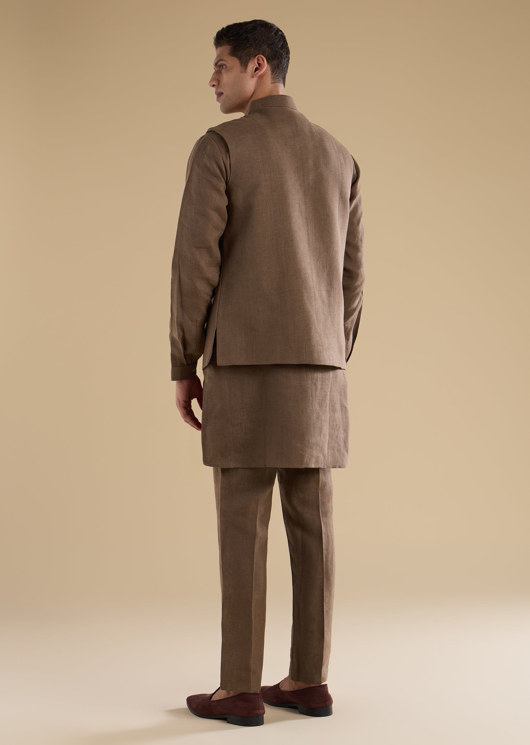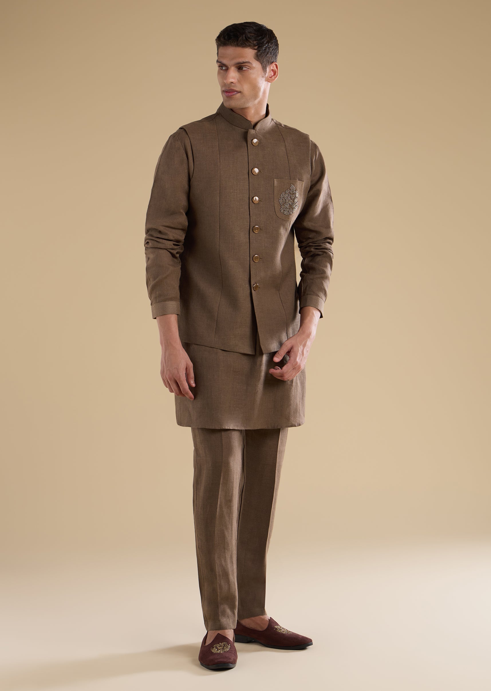 Warm and festive with refined detailing, this brown kurta jacket set is crafted in smooth art silk for a rich, traditional appeal. The kurta features a mandarin collar, full sleeves, and side slits, paired with an embellished jacket accented with bead detailing for subtle sparkle. Finished with straight-fit trousers and a partially elasticated waist, this ensemble is ideal for festive occasions, wedding gatherings, and groom-family celebrations. Awarded as the Most Trusted Brand, we're delivering styles you love, just as promised.
