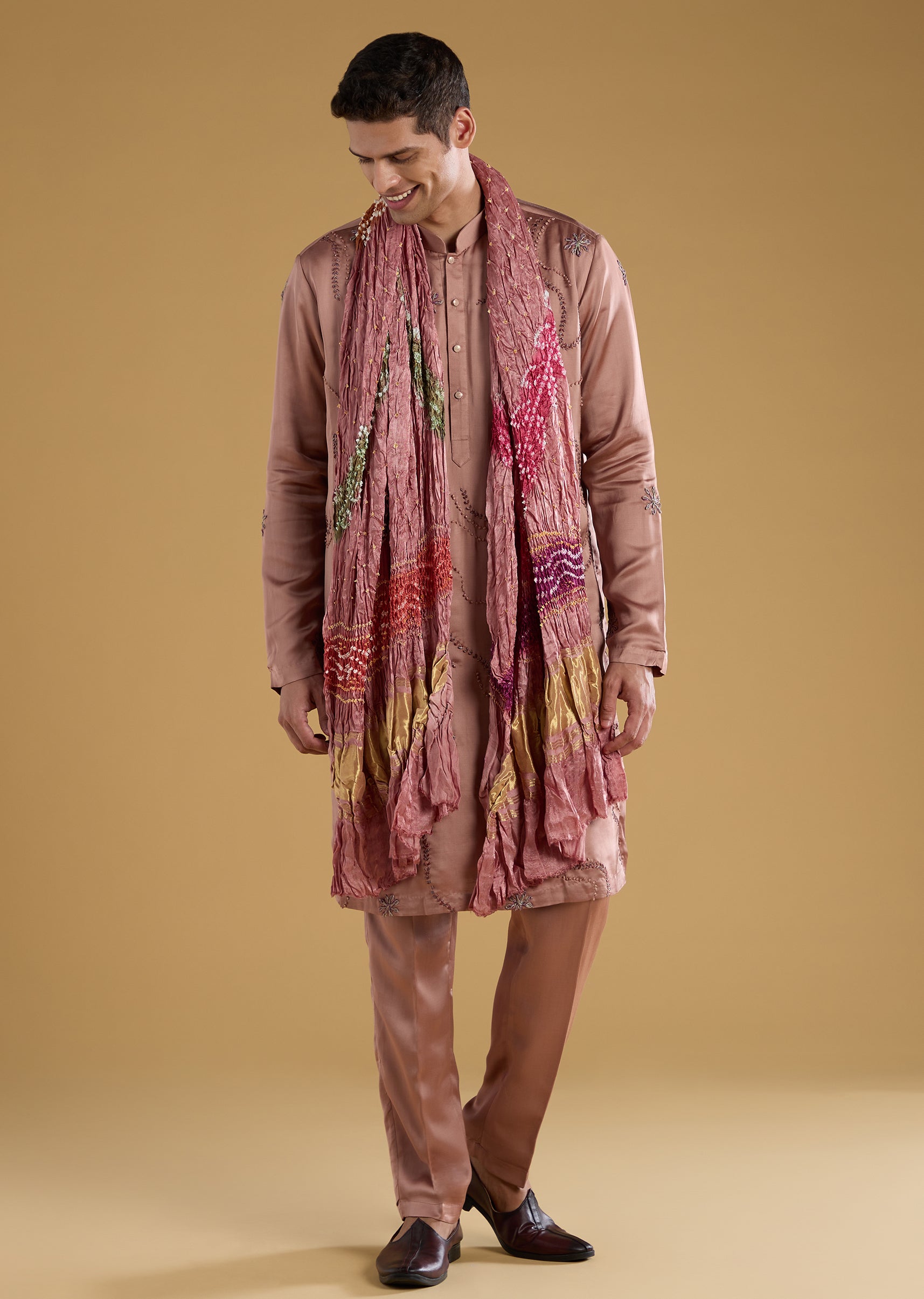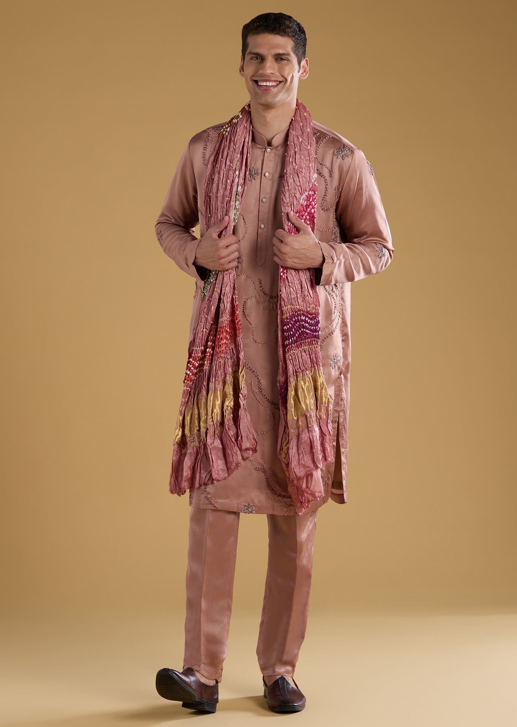 Brown Embroidered Men's Kurta Set with Dupatta in Silk