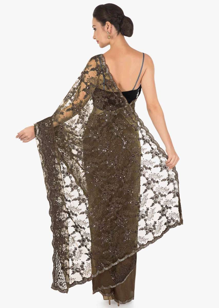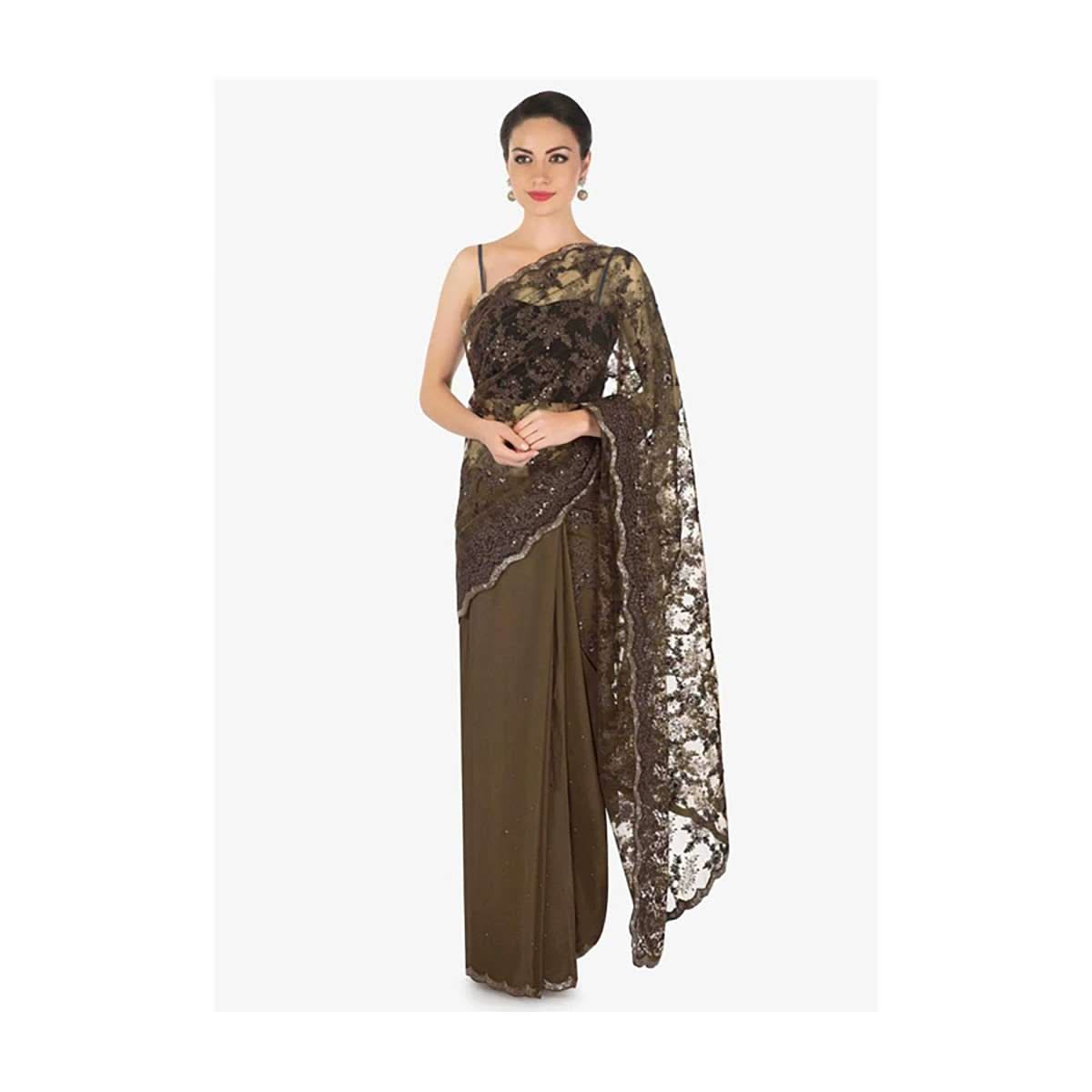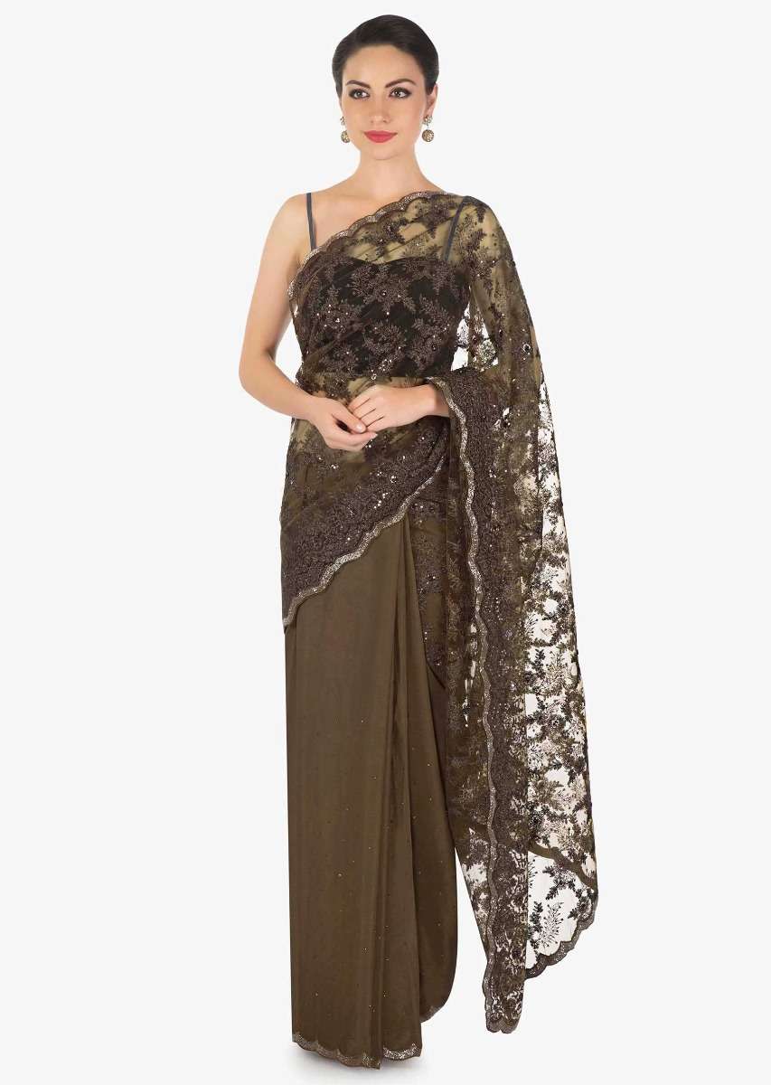 Brown Half And Half Saree In Zari Embroidered Net And Chiffon Online - Kalki Fashion