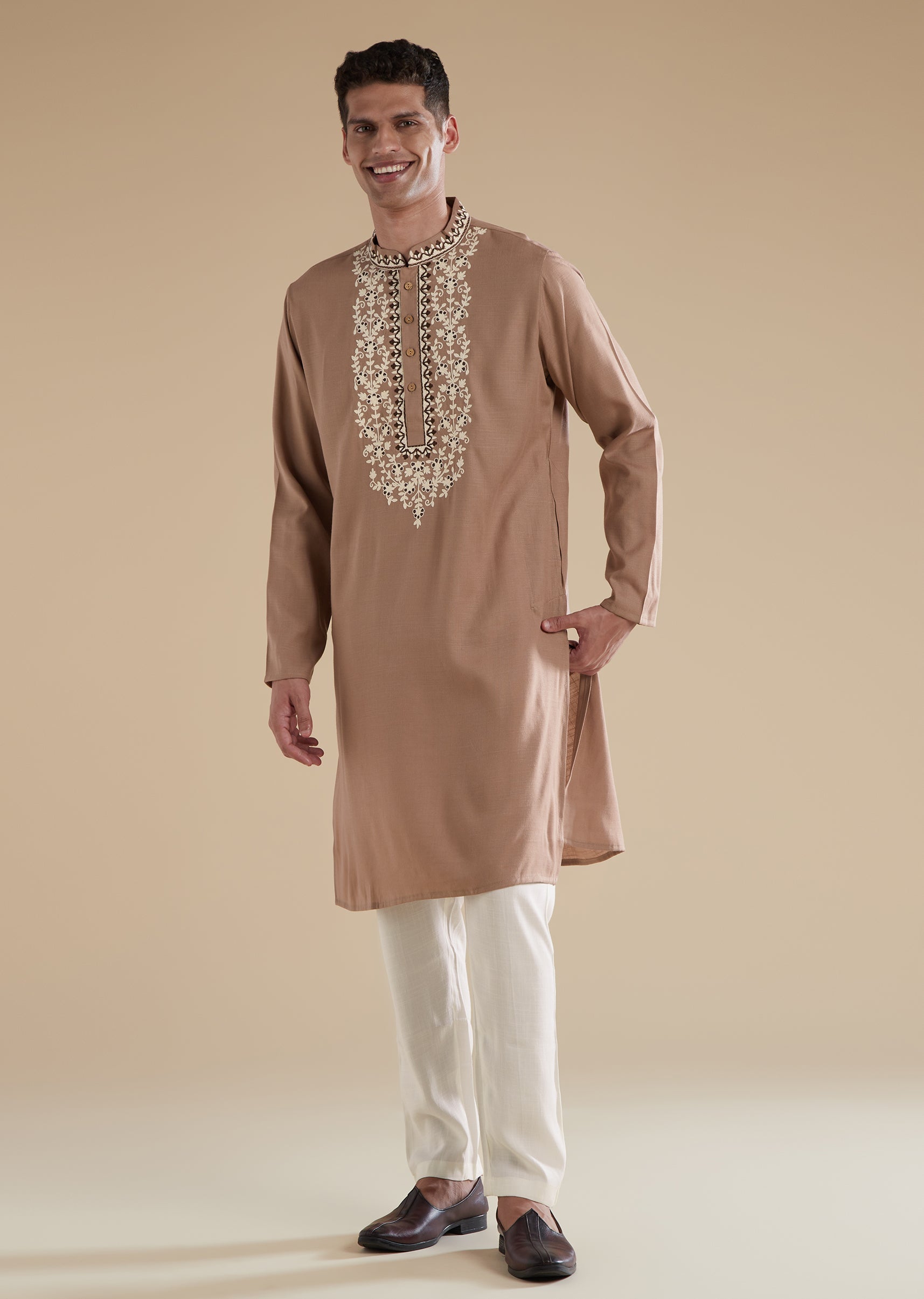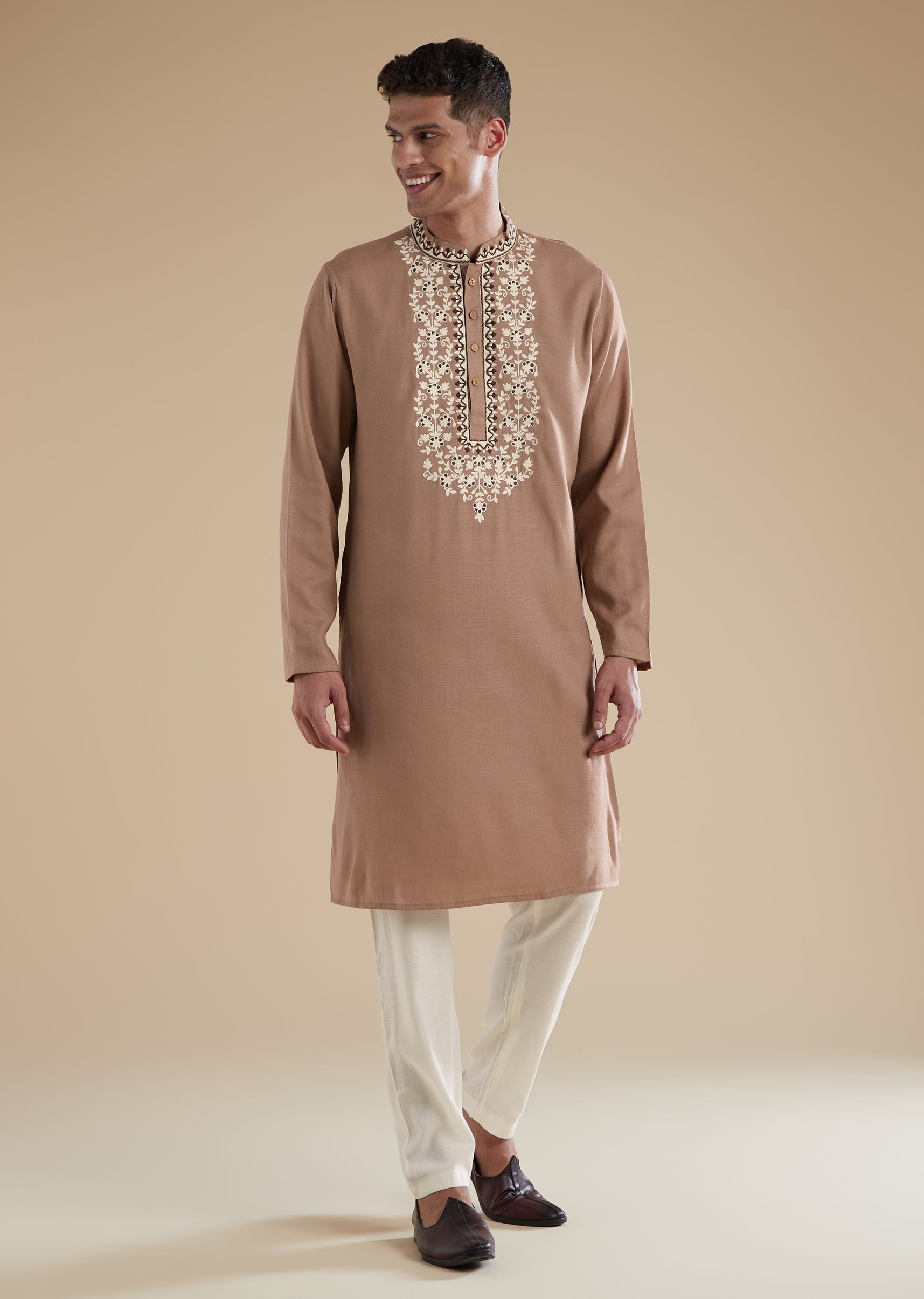 This brown mens kurta set is crafted in soft viscose, offering a smooth and relaxed fall perfect for casual pastel toned dressing. The kurta features subtle thread detail work, a... More Product Details