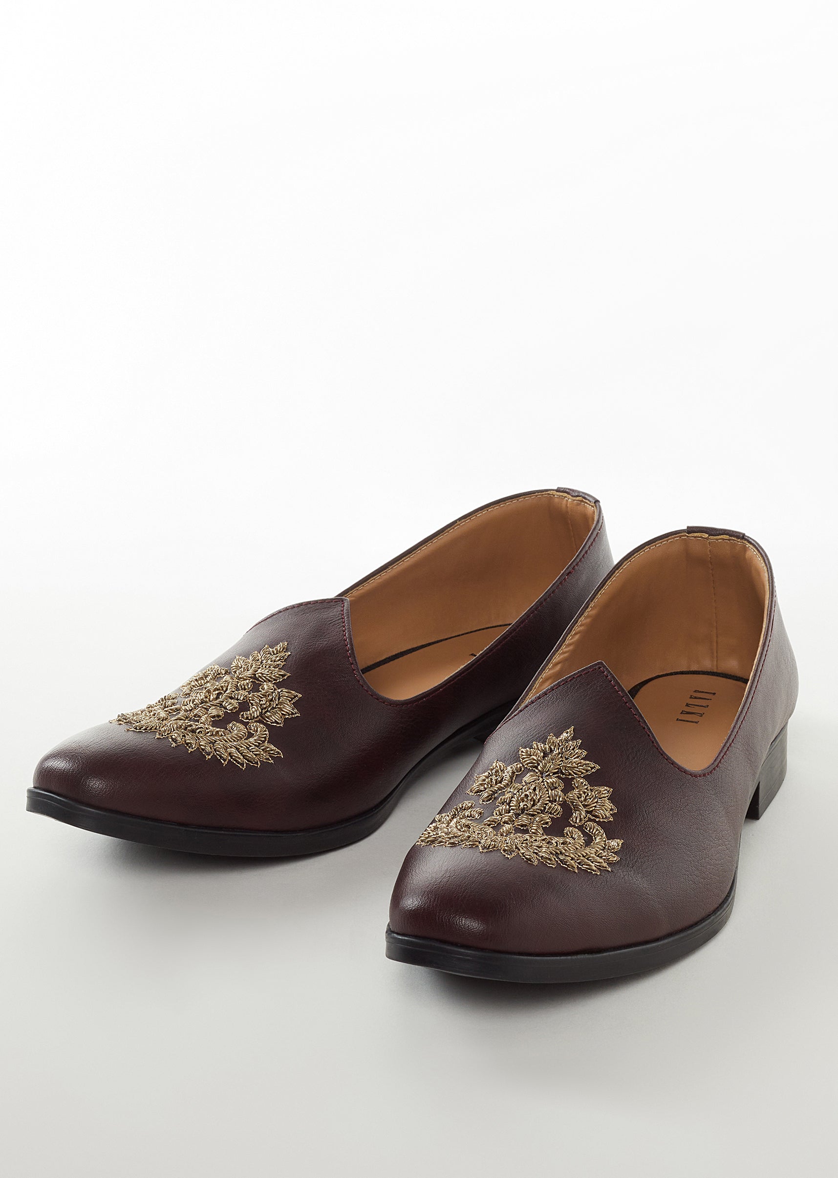 Refined and elegant, these brown mens footwear pieces are crafted in smooth faux leather with subtle embroidery detailing that adds a touch of festive charm. The tabletop face silhouette allows easy slip on comfort while maintaining a polished traditional appeal. Perfect for engagement ceremonies, pooja functions, or as a wedding guest, they pair seamlessly with kurtas, sherwanis, or ethnic ensembles. Awarded as the Most Trusted Brand, we're delivering styles you love, just as promised.