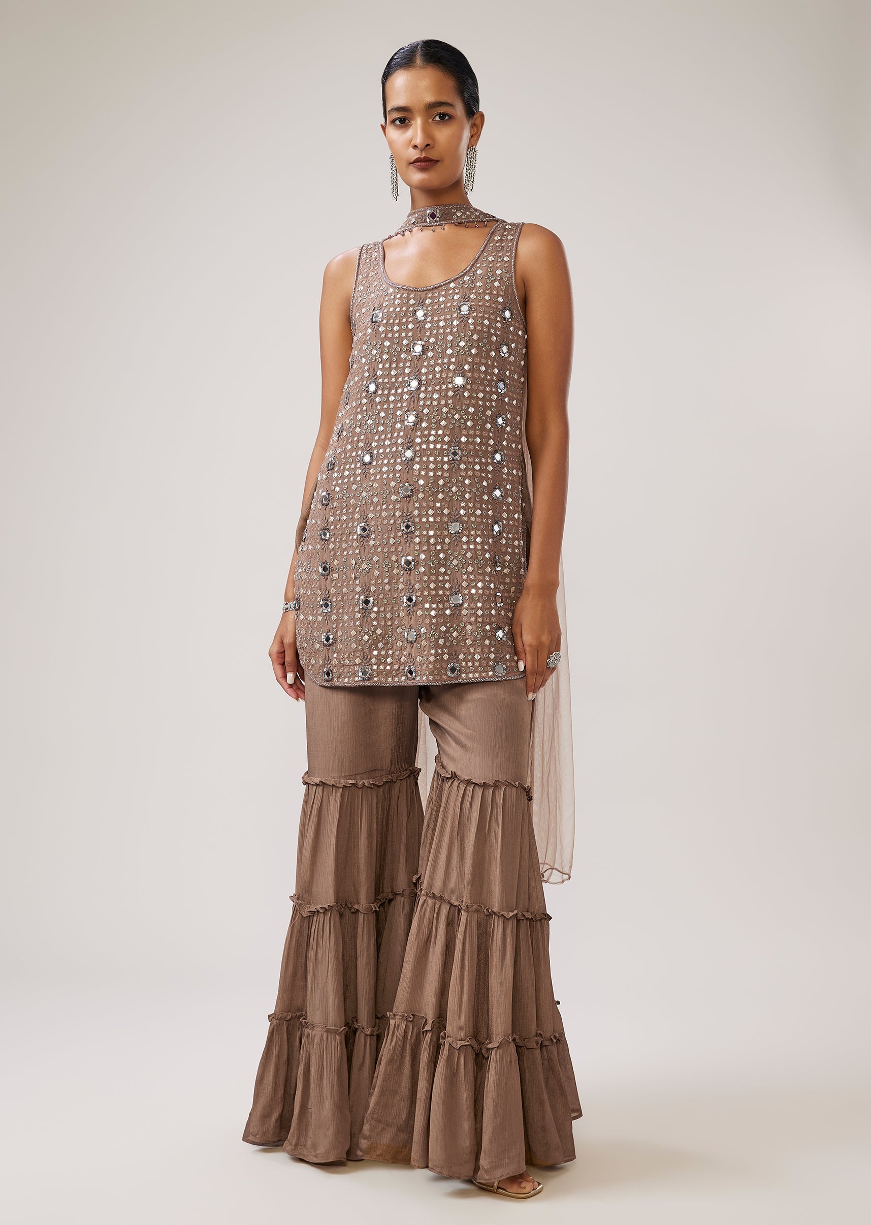 Brown Mirror Work Chinon Sharara Set With Dupatta