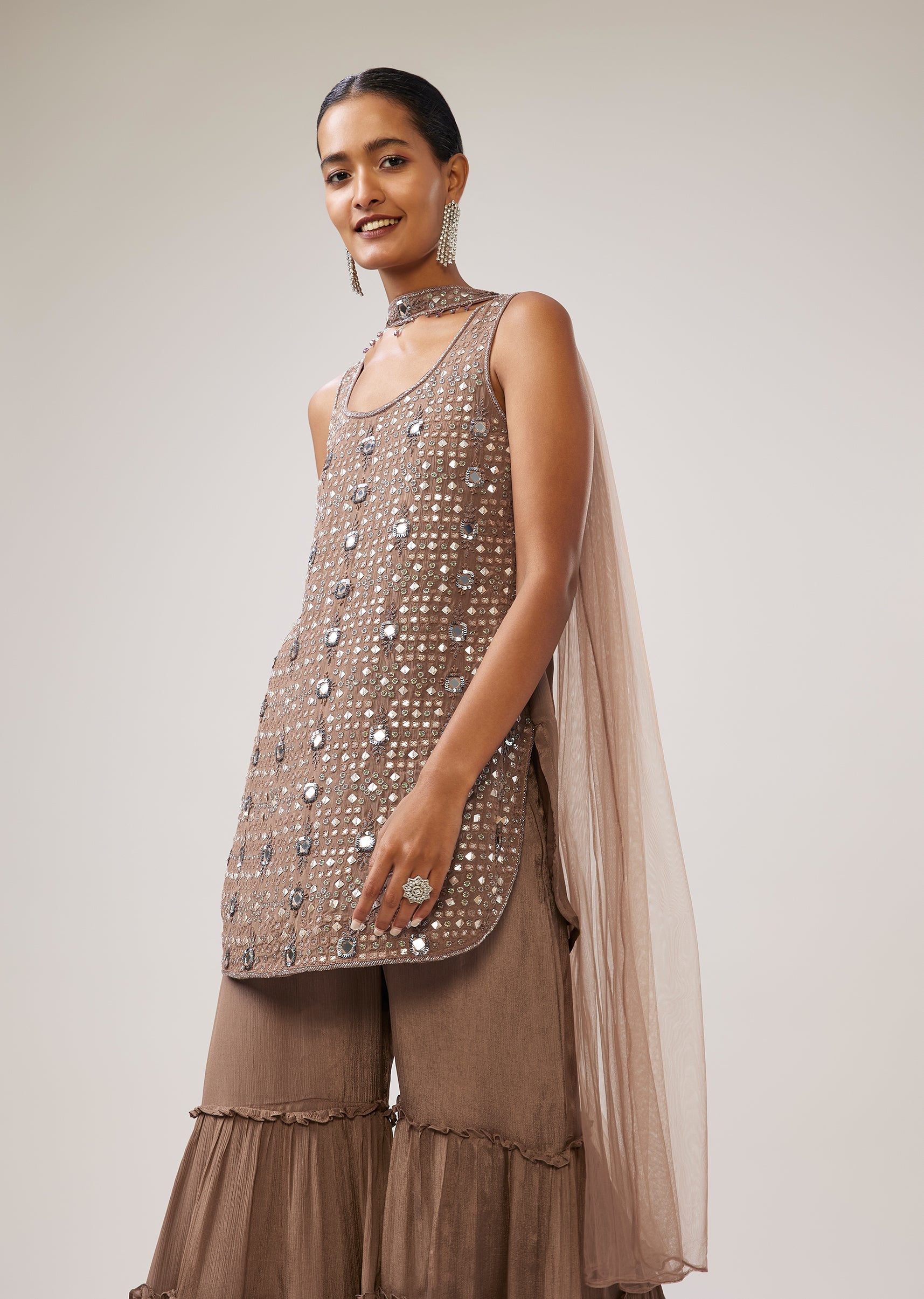 Rich and elegant, this brown chinon sharara set features mirror, sequin and cut dana work for a glamorous festive finish. Designed with a sleeveless straight kurta and round neckline, it... More Product Details