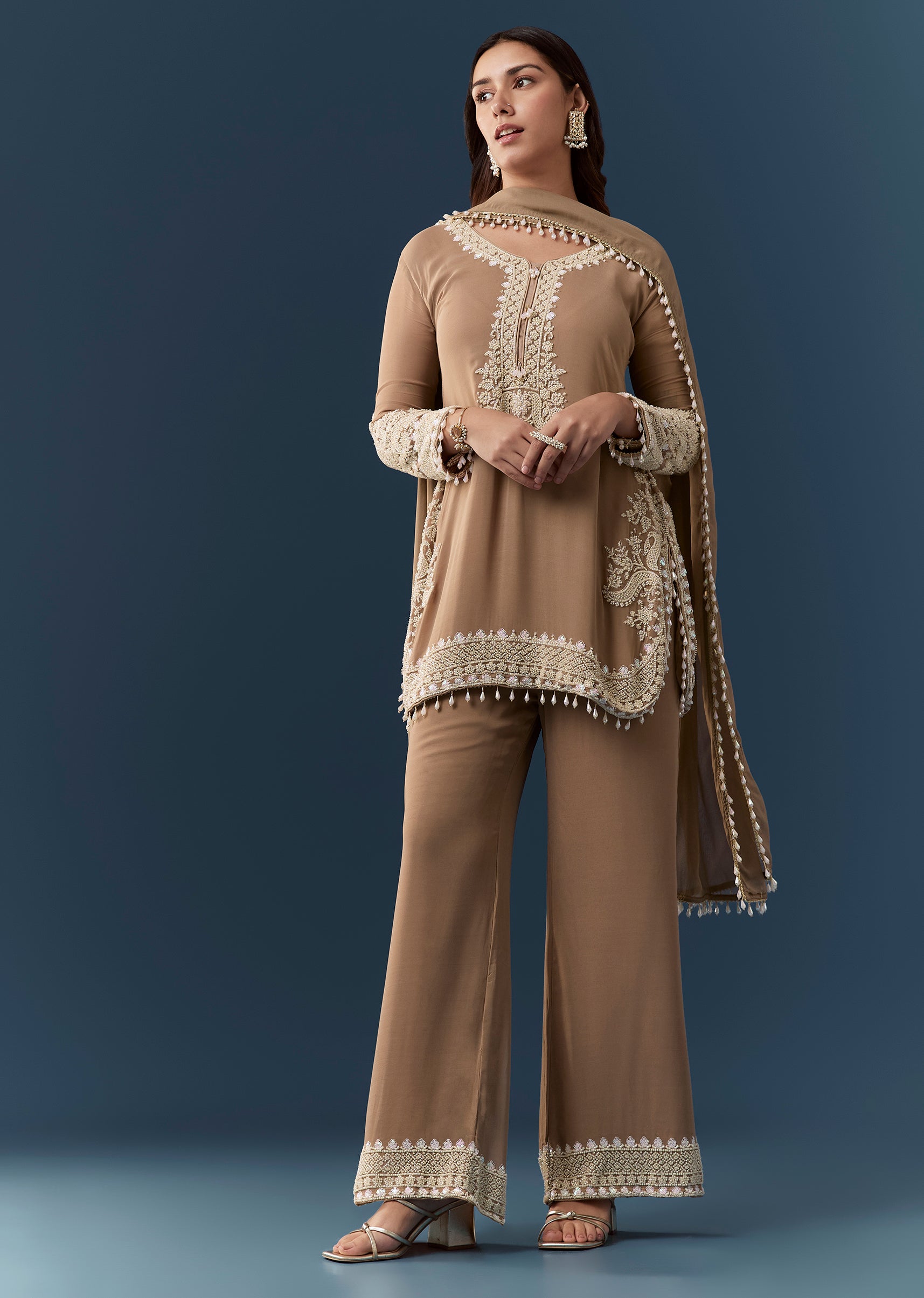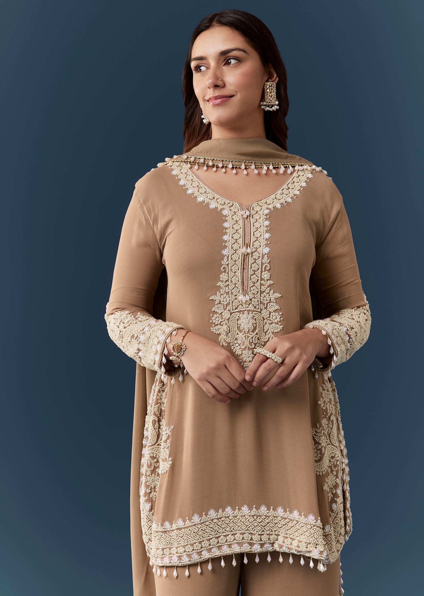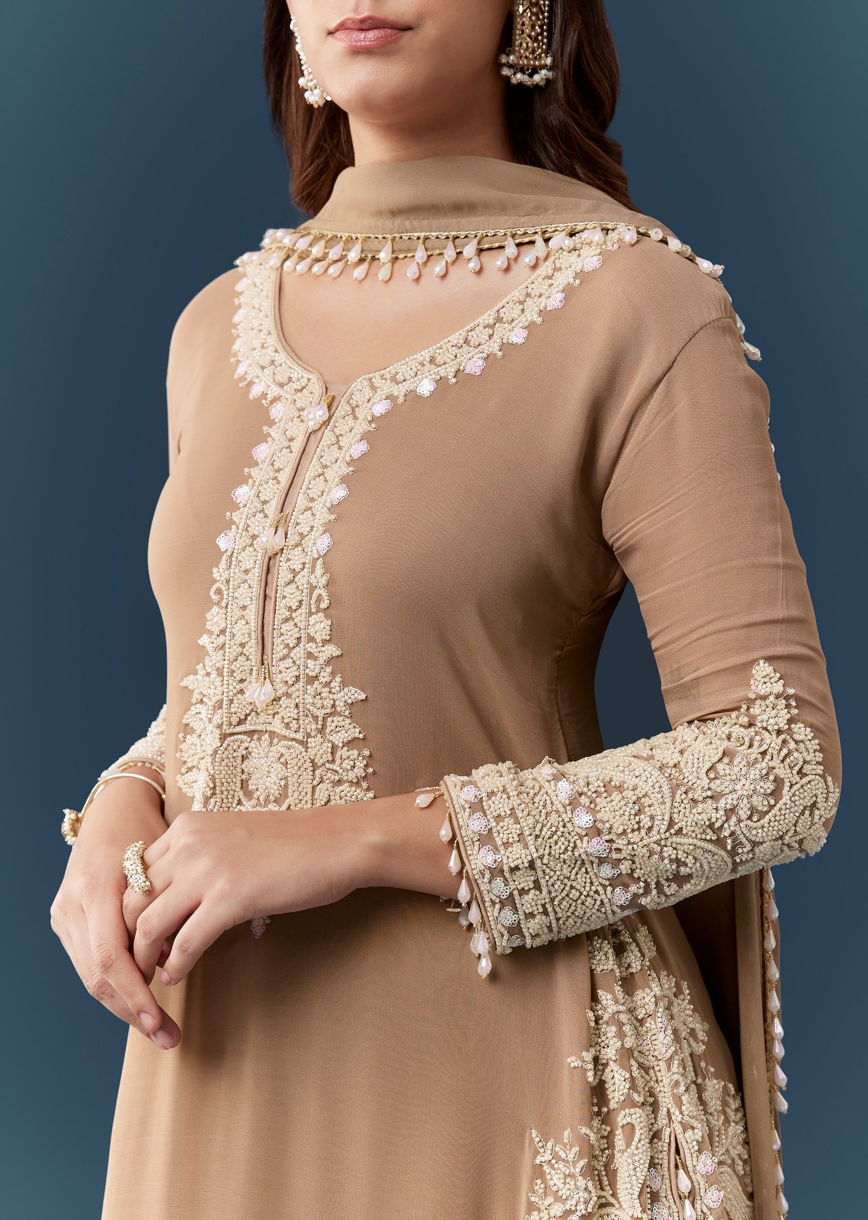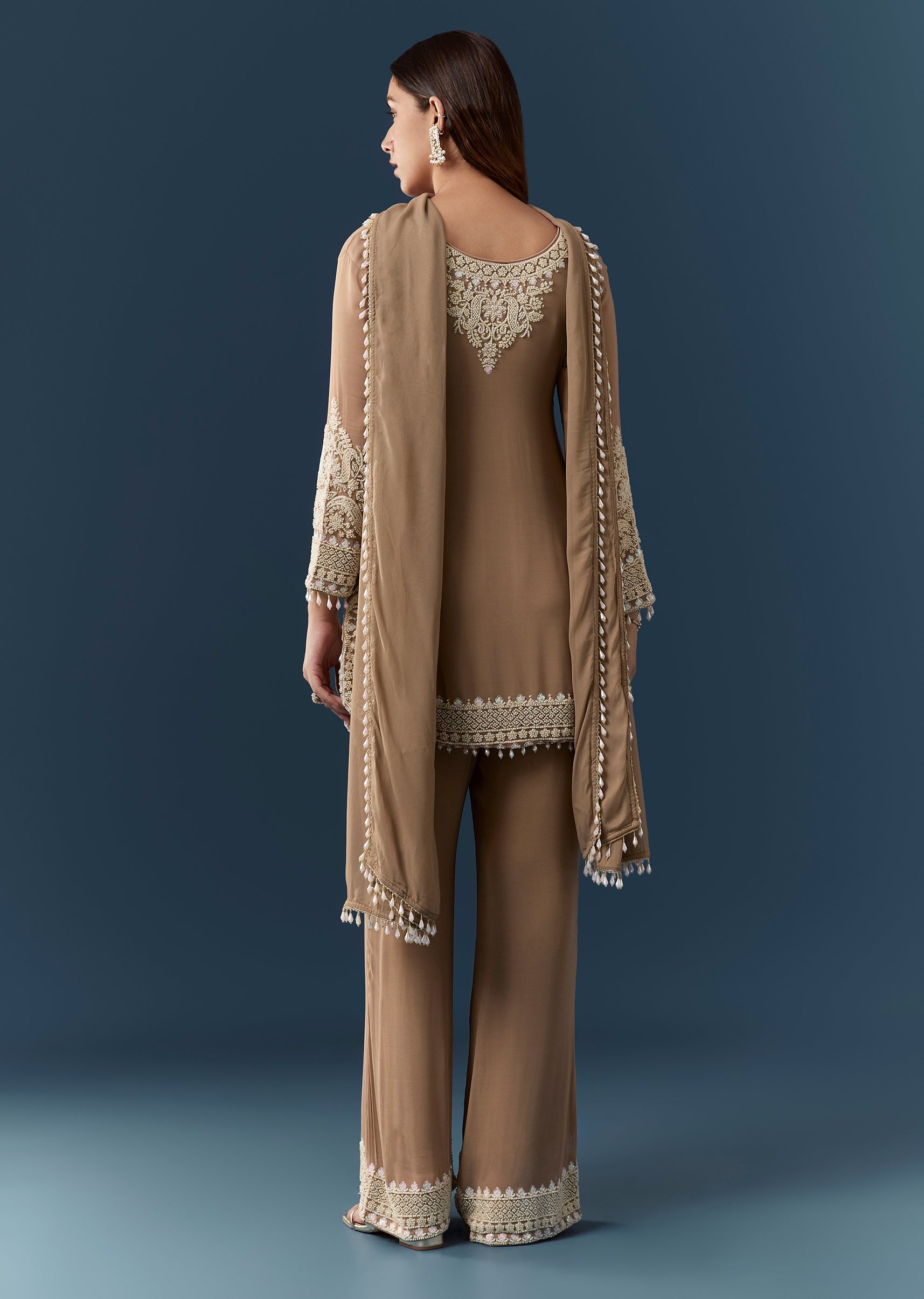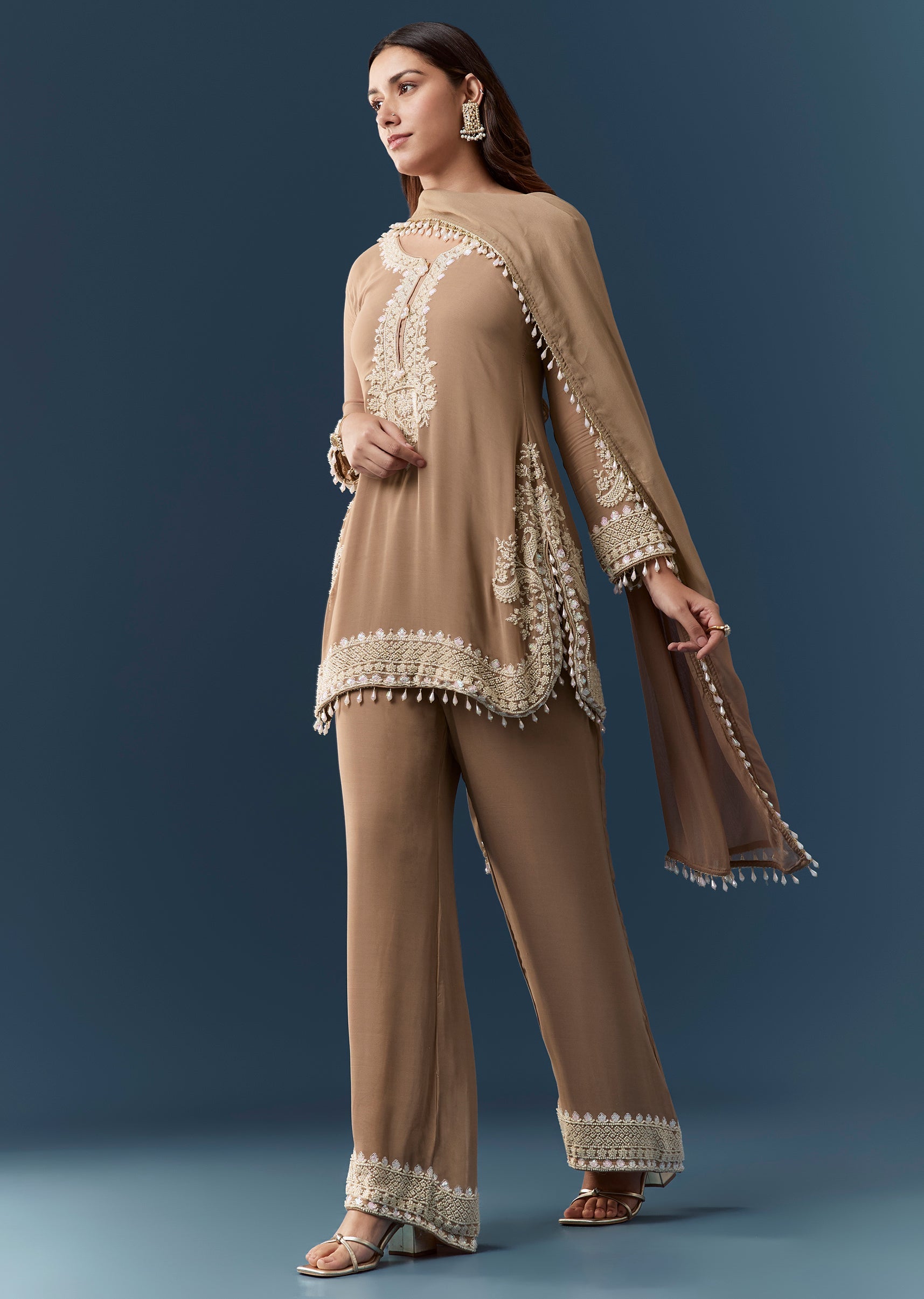 Embrace understated elegance with this brown georgette kurta set adorned with delicate moti work that adds a soft refined shimmer. The full sleeve round neckline kurta offers a classic and... More Product Details