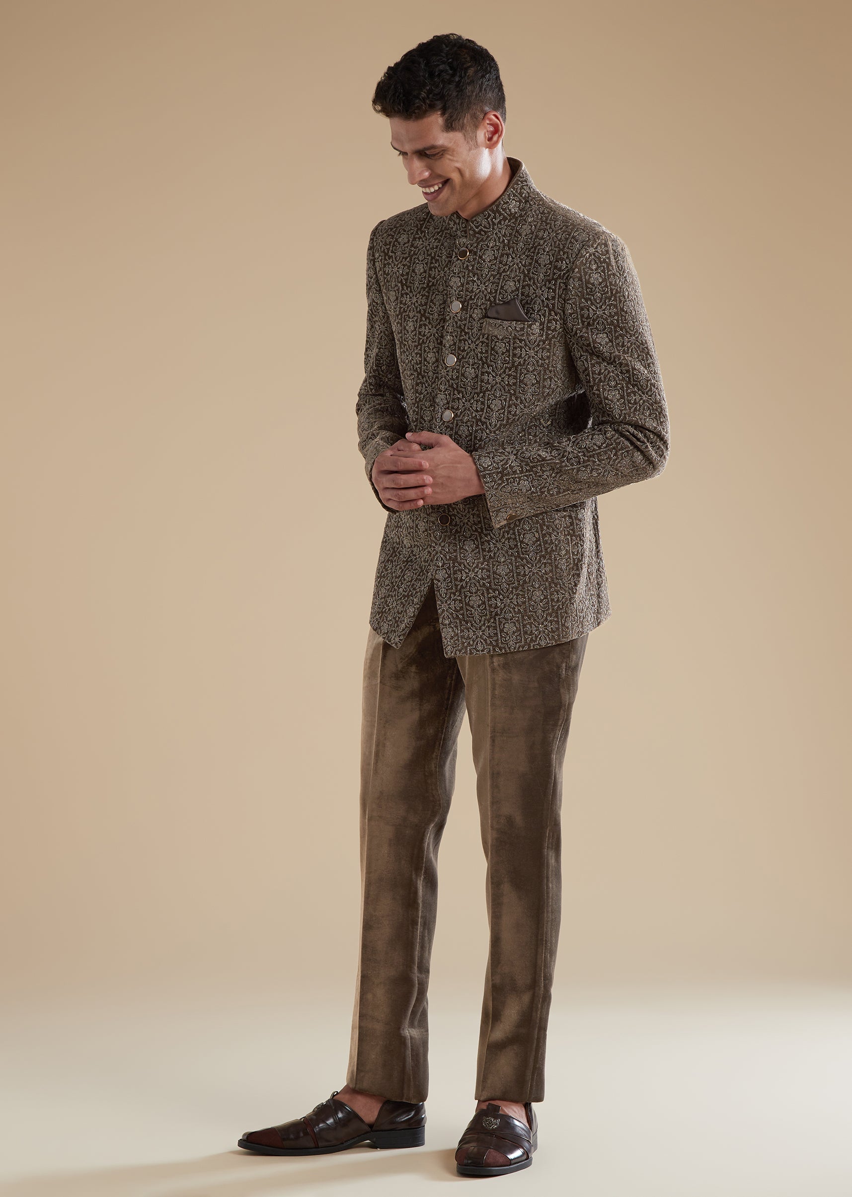 This brown jodhpuris set is crafted in plush velvet making it a refined choice for sangeet and reception evenings. The detailed thread resham work adds depth and festive richness perfect for a groomsman or a grooms father. The silhouette is completed with a mandarin collar and full sleeves while front buttons finish both the top and bottom closure. Paired with coordinated pants this set delivers a regal and sophisticated look for celebratory nights.