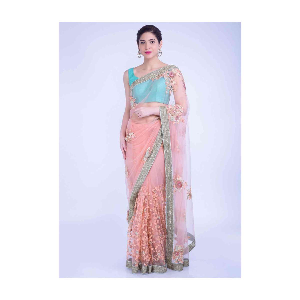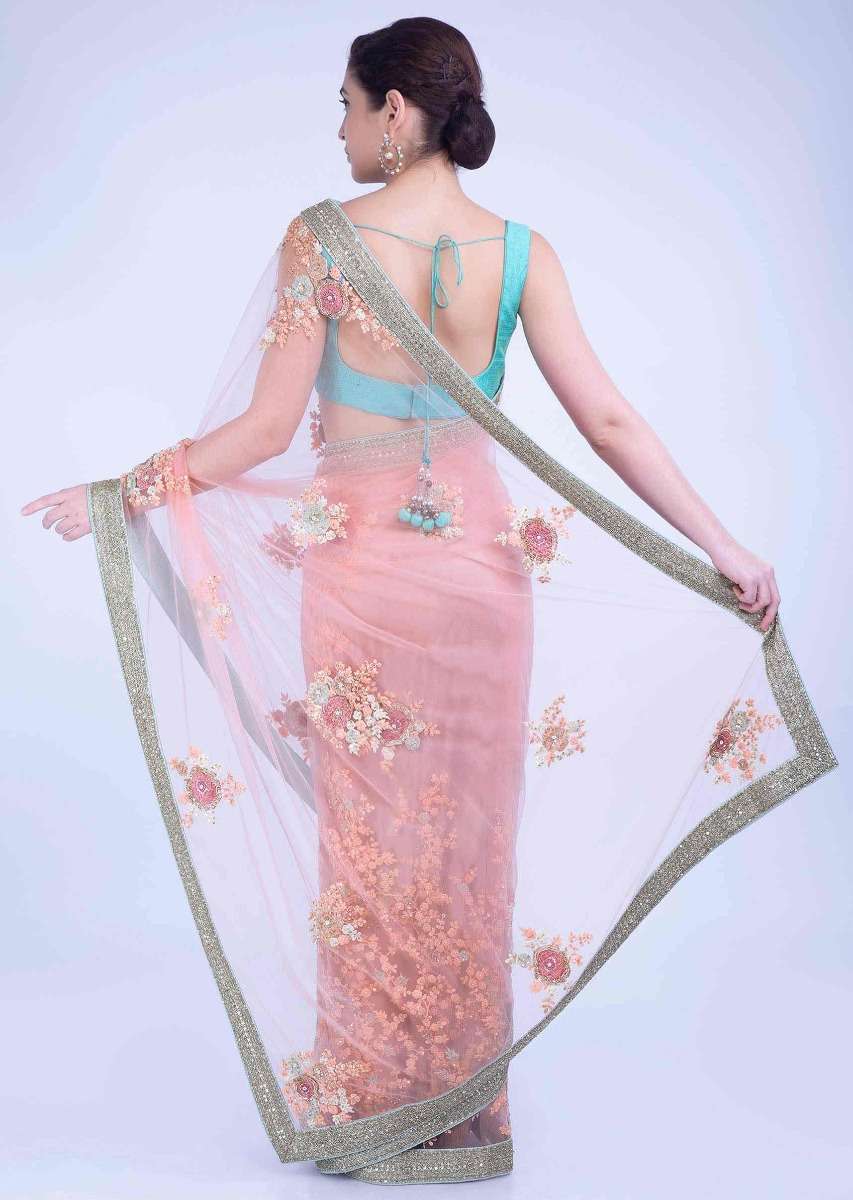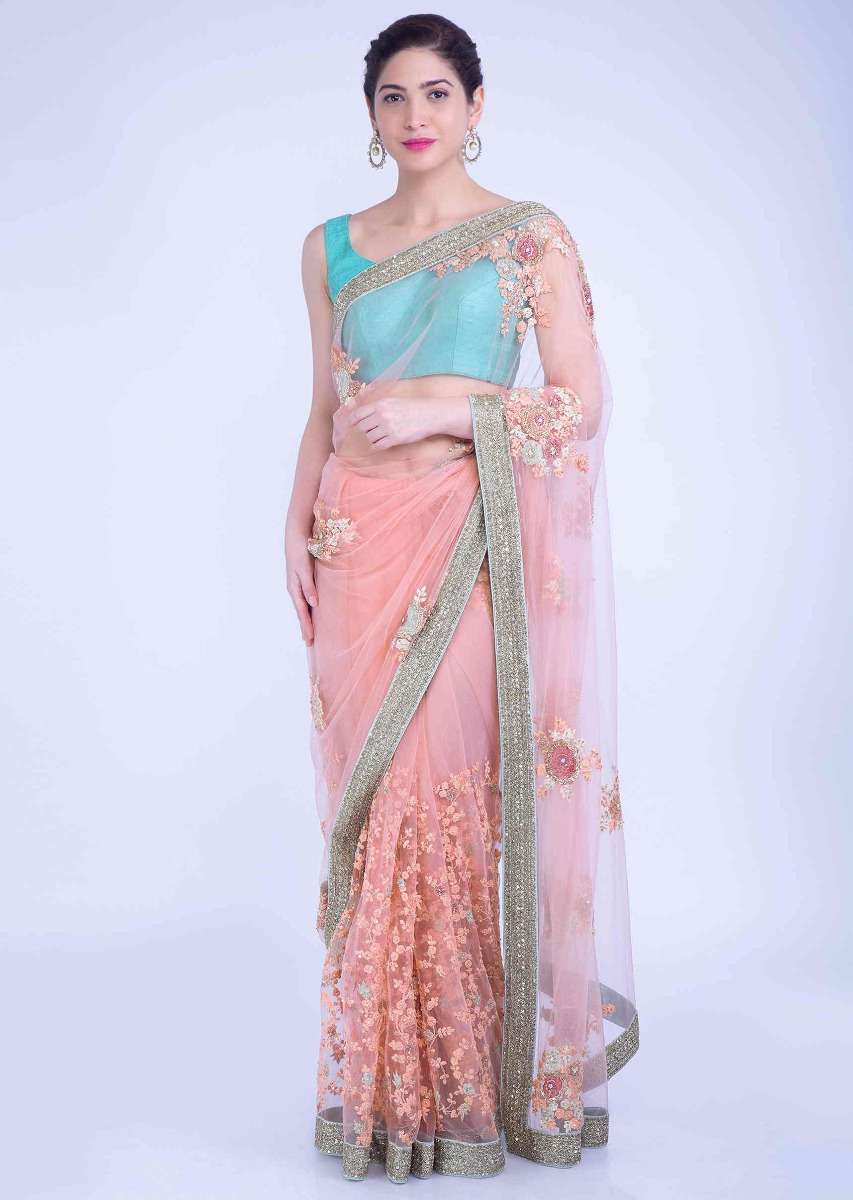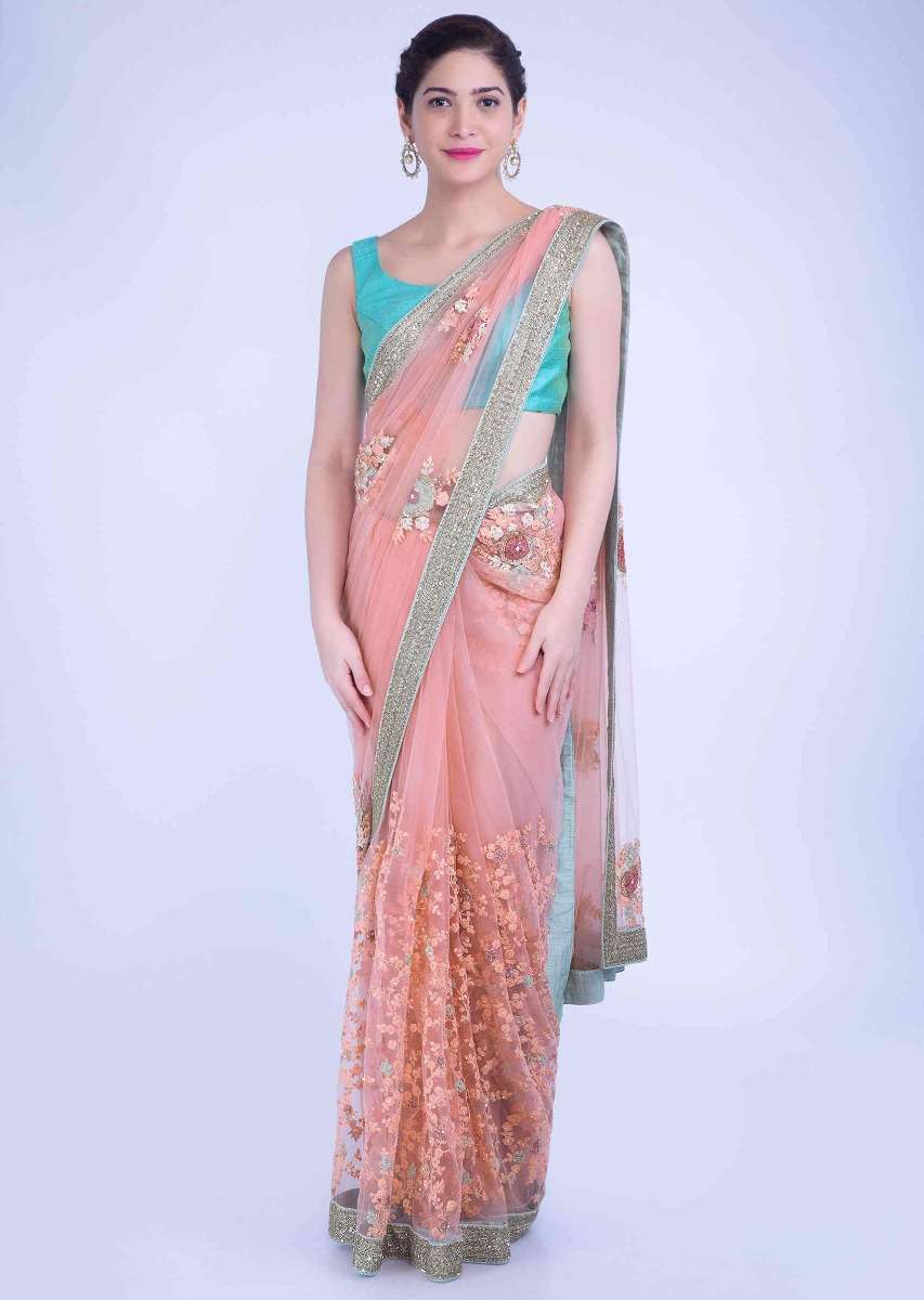 Charisma Peach Saree In Net With Mint Green Border Online - Kalki Fashion