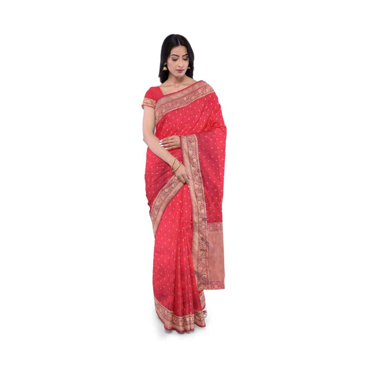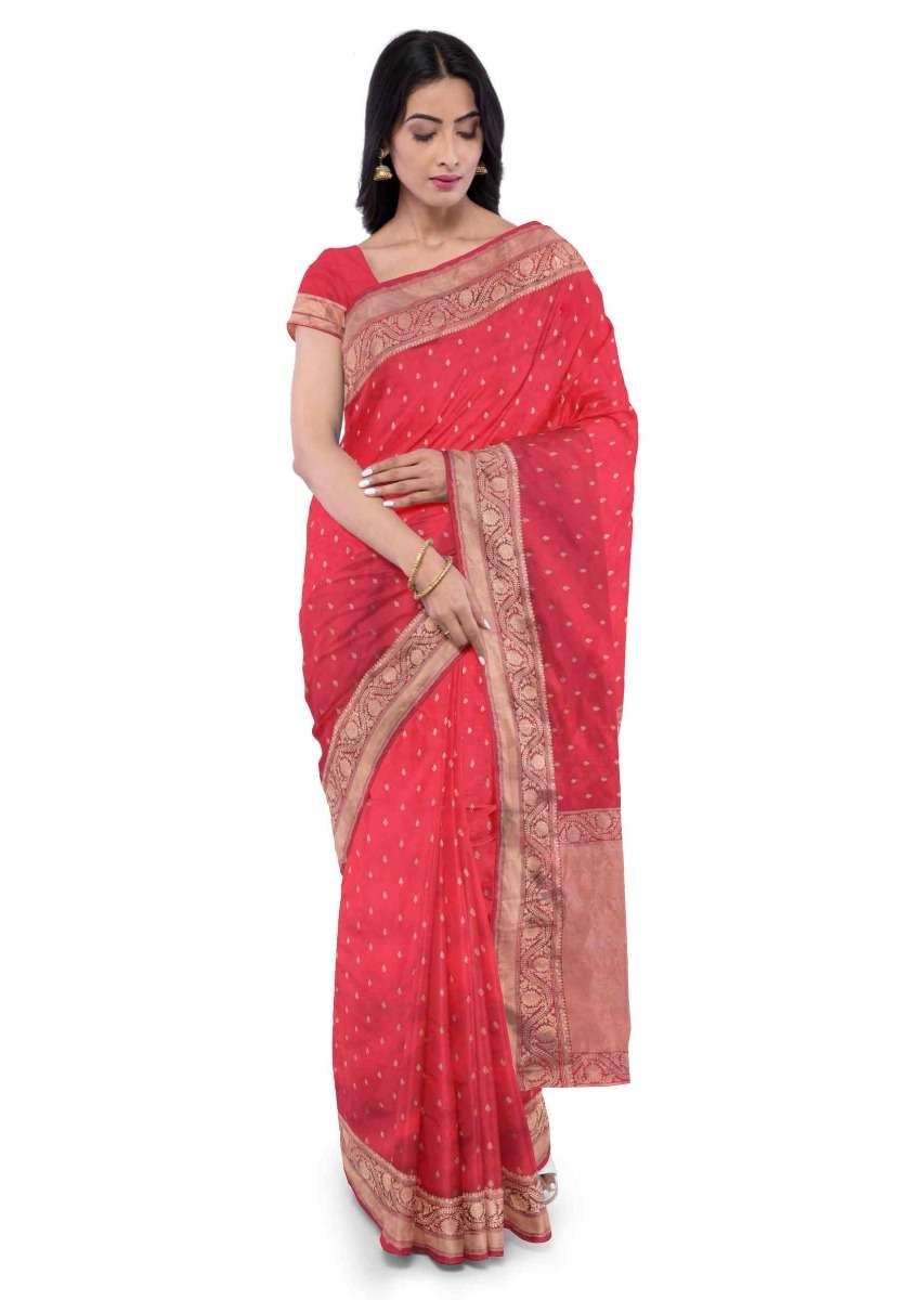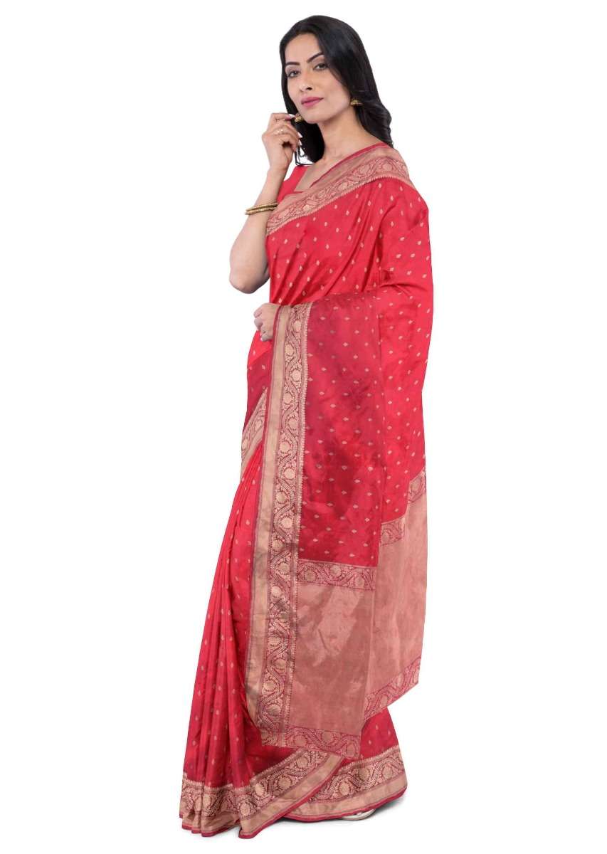 Cherry Red Banarasi Saree With Weaved Leaf Buttis Online - Kalki Fashion