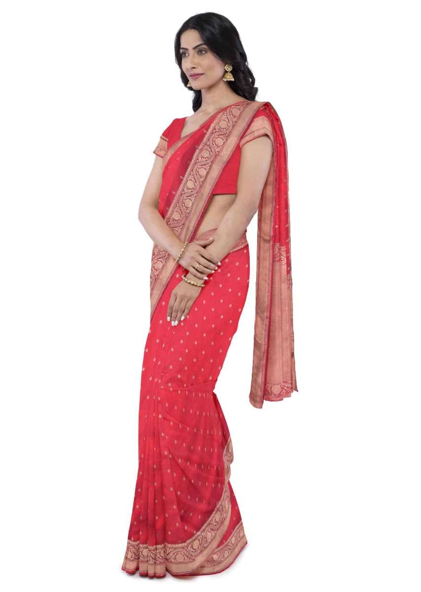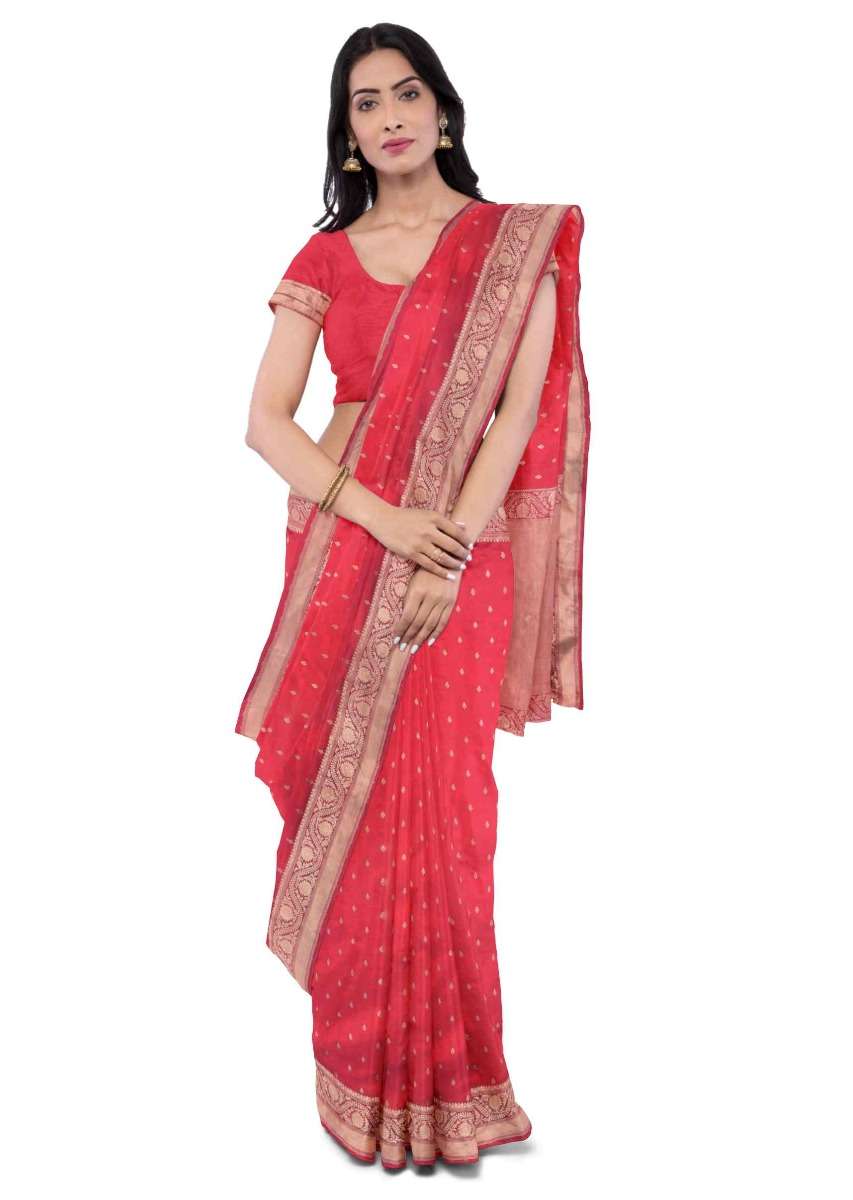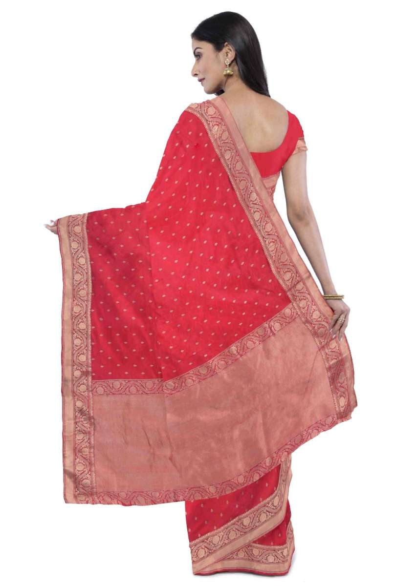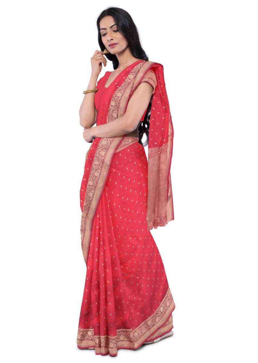 Cherry Red Banarasi Saree With Weaved Leaf Buttis Online - Kalki Fashion