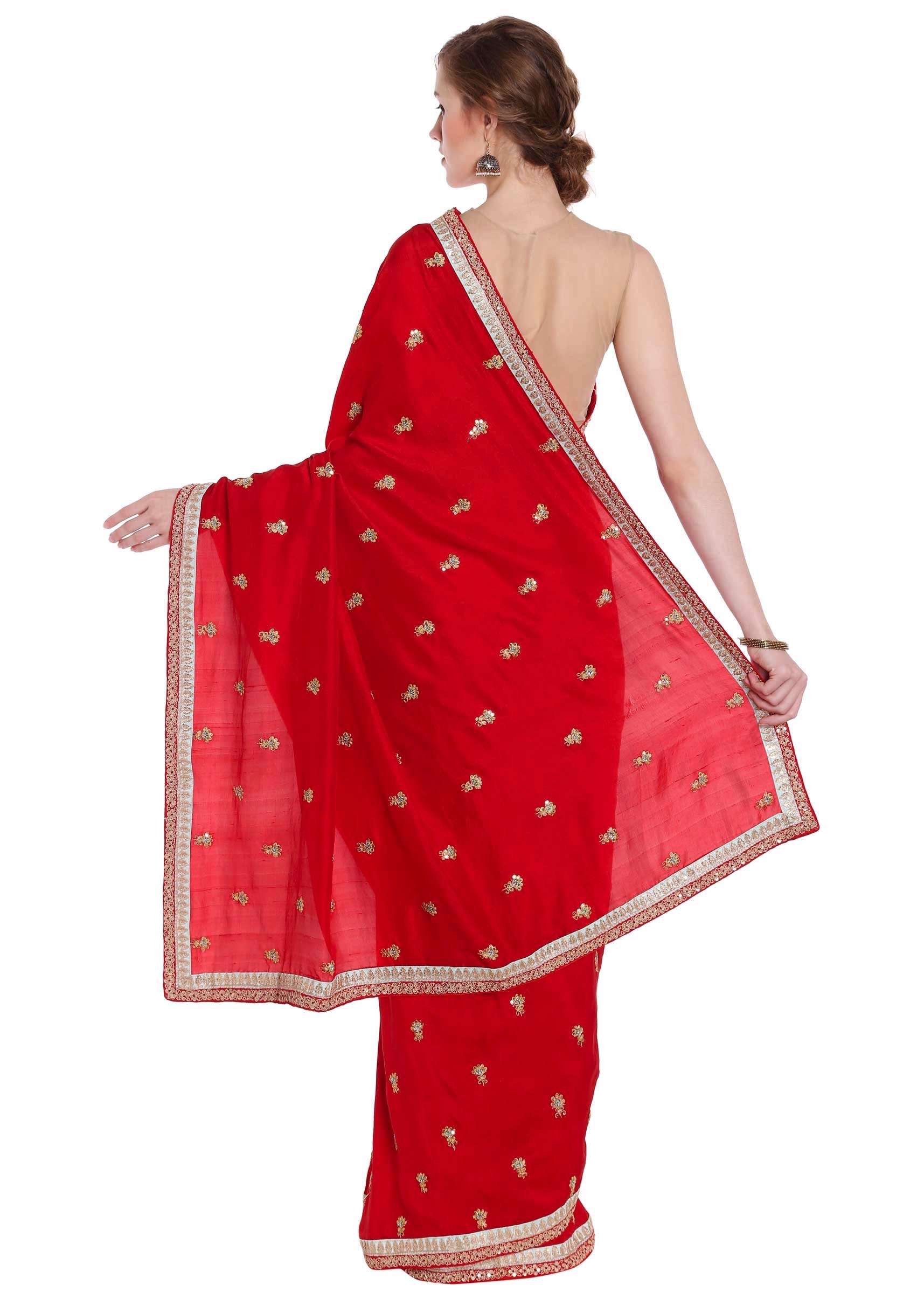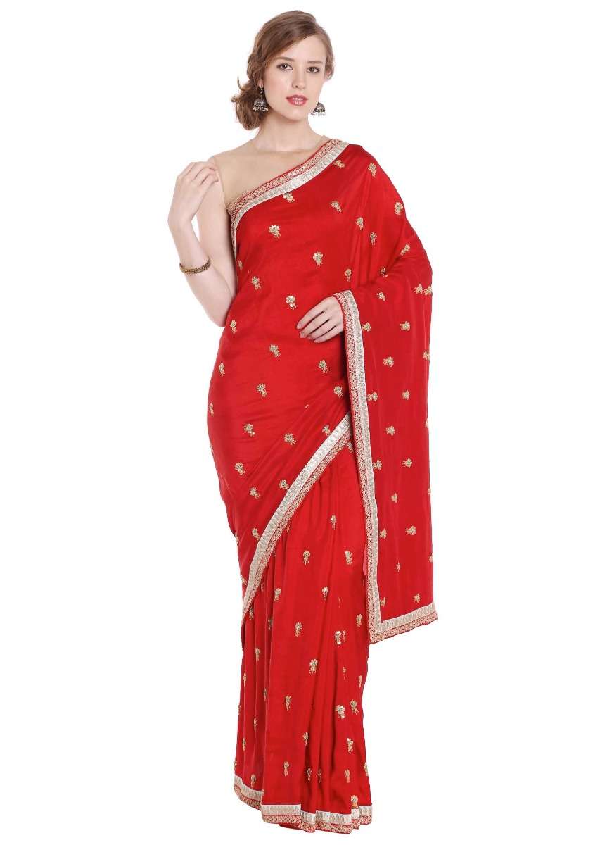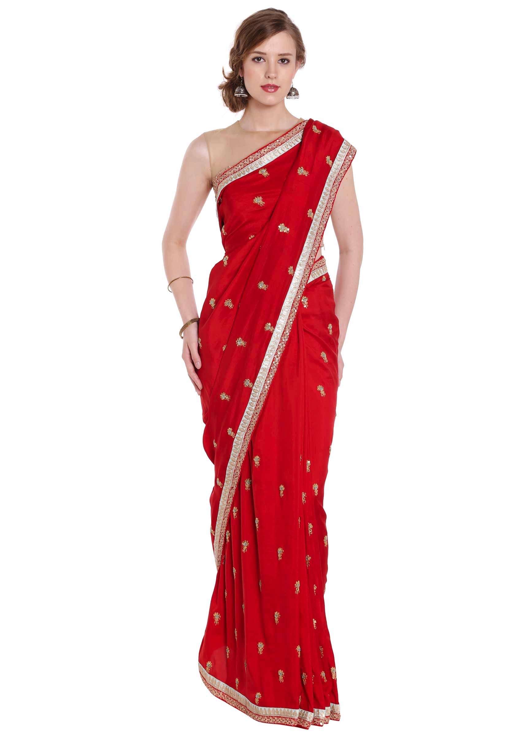 Cherry red silk saree adorn in zari butti and border only on Kalki