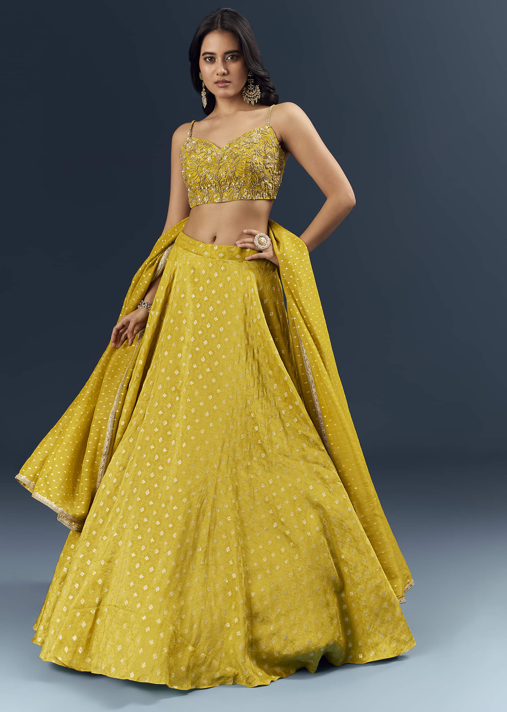 Made for close-up moments, this citrus green banarasi silk bridesmaid lehenga showcases meticulous detailing over classic brocade texture. Sequins, beads, and lace are applied by hand to highlight the pattern... More Product Details