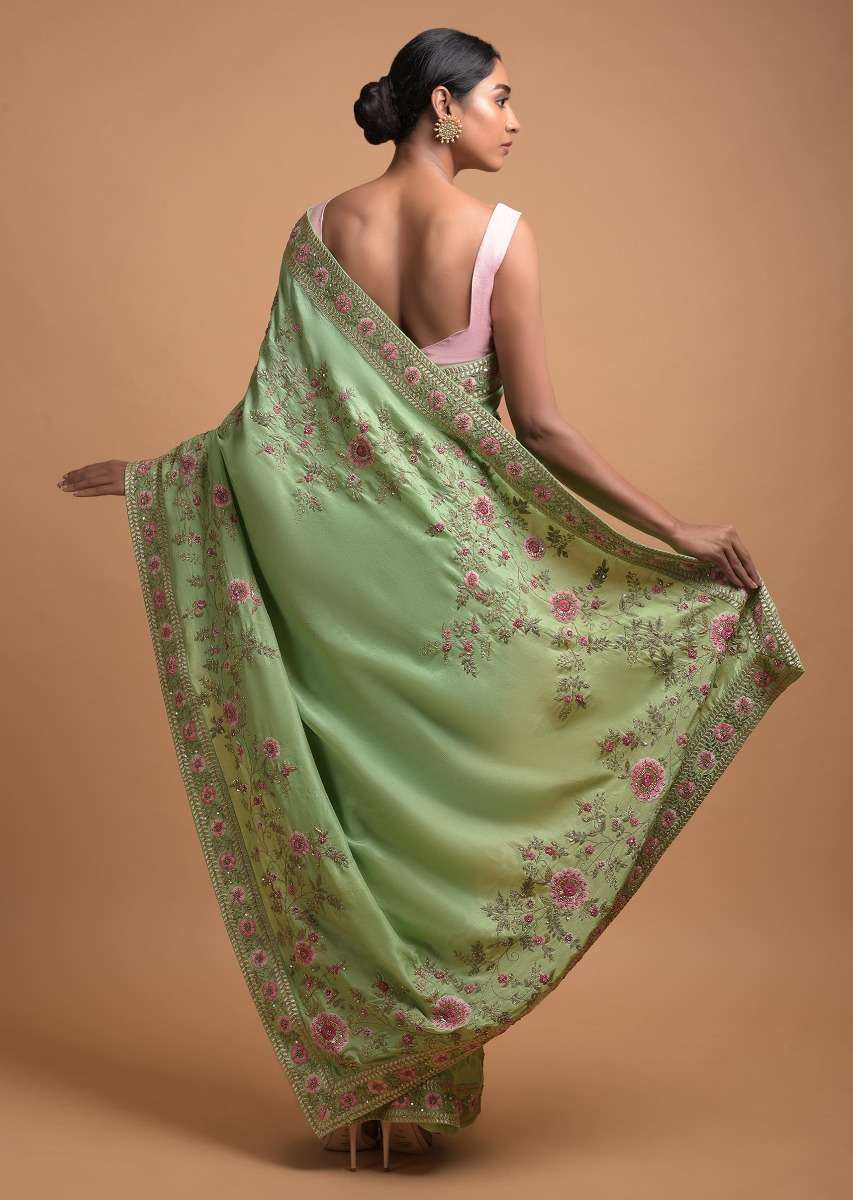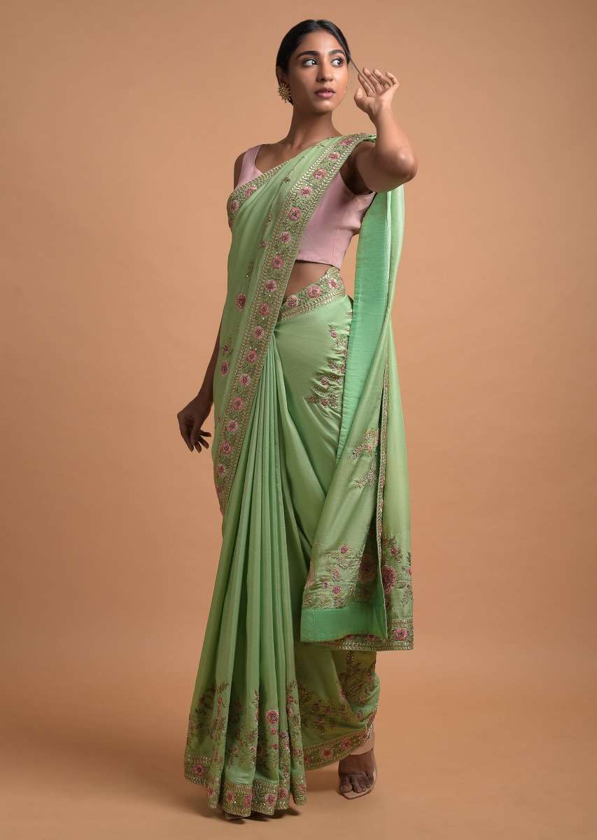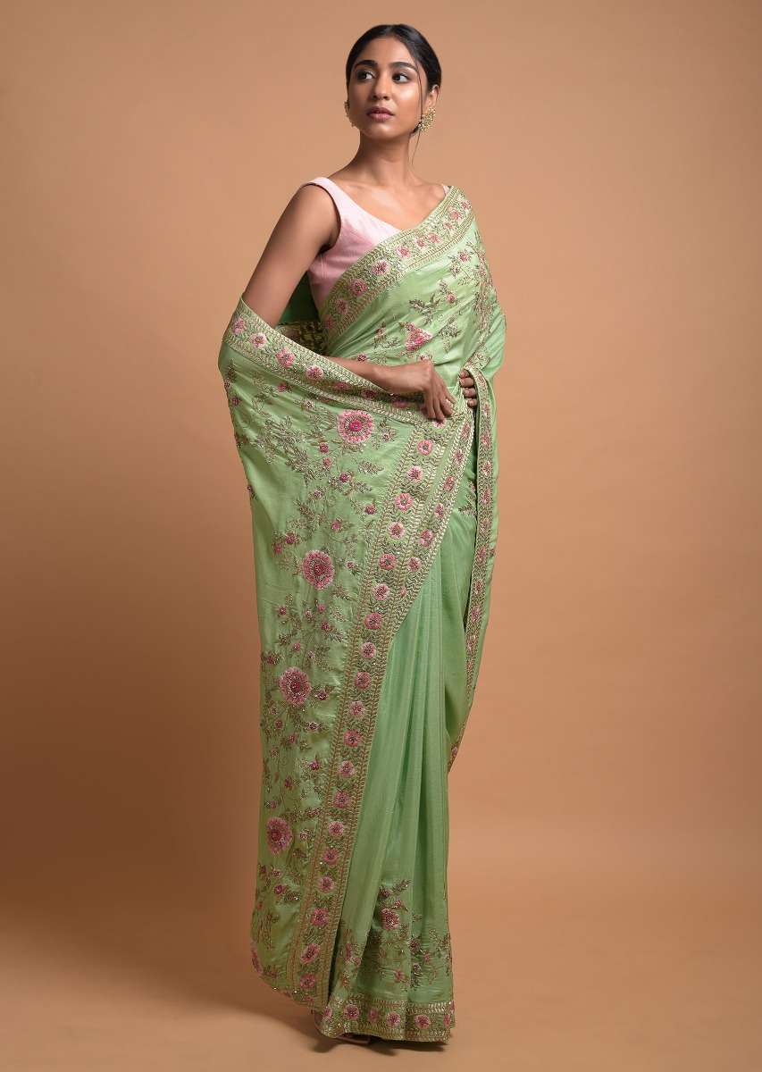 Citrus Green Saree In Silk With Resham Embroidered Floral Pattern Online - Kalki Fashion
