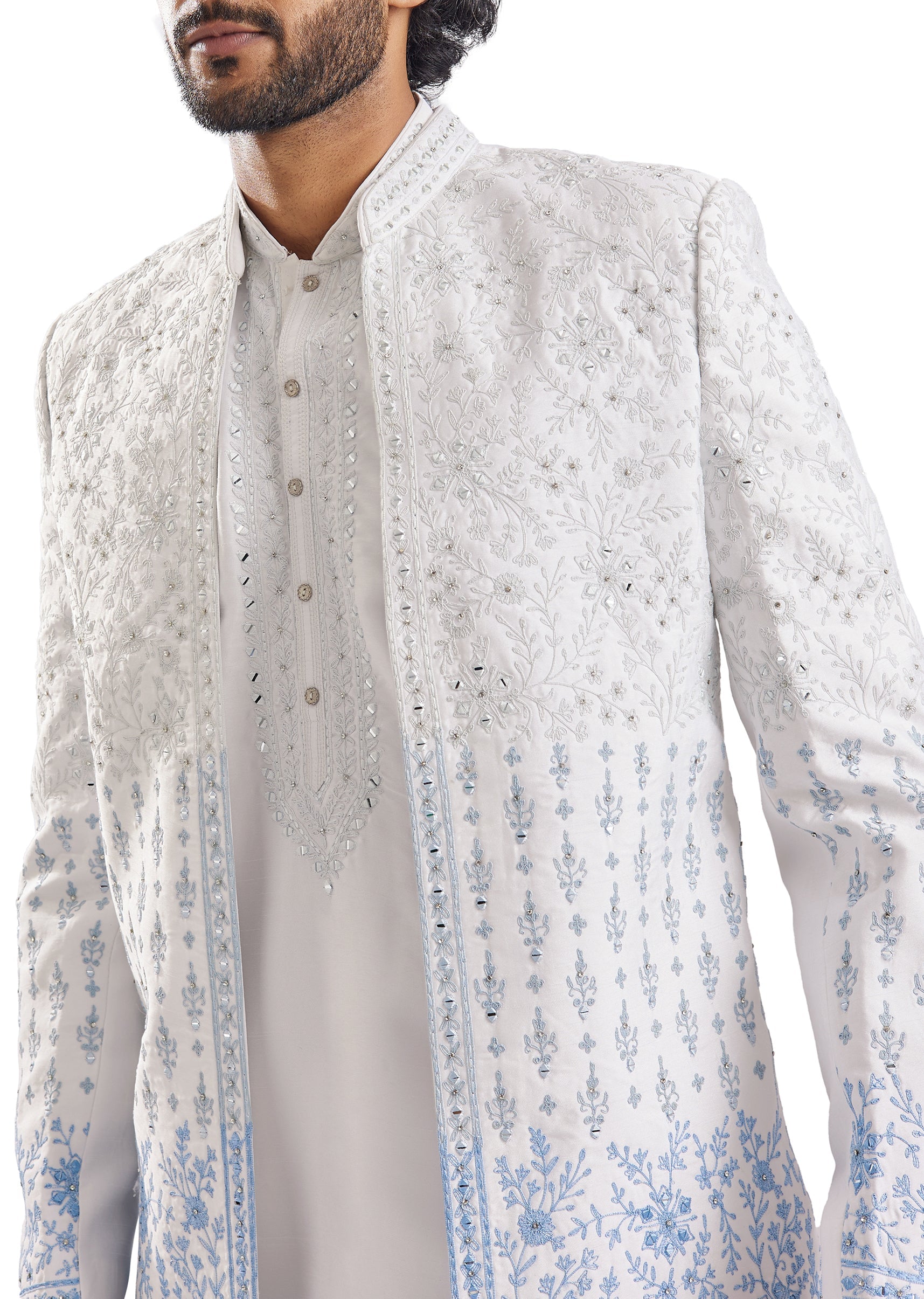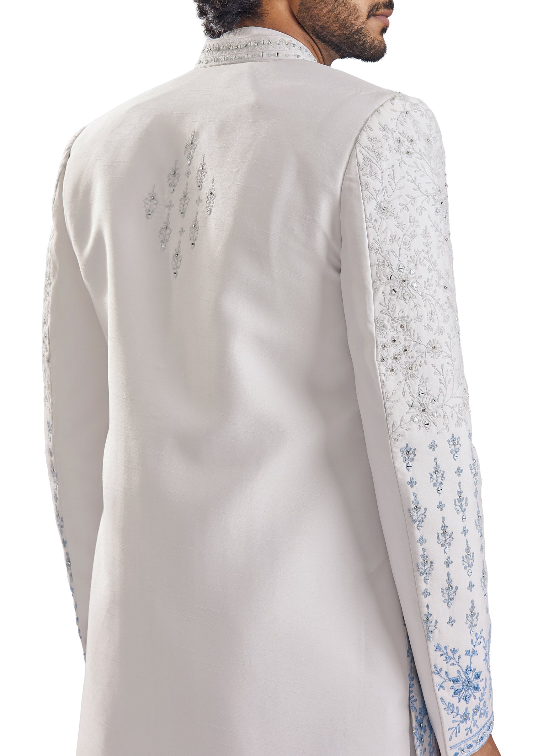 Fit Tips:This sherwani is stitched to a straight mid-waist fit — order your regular chest size and allow the trousers to be hemmed to your exact ankle length.