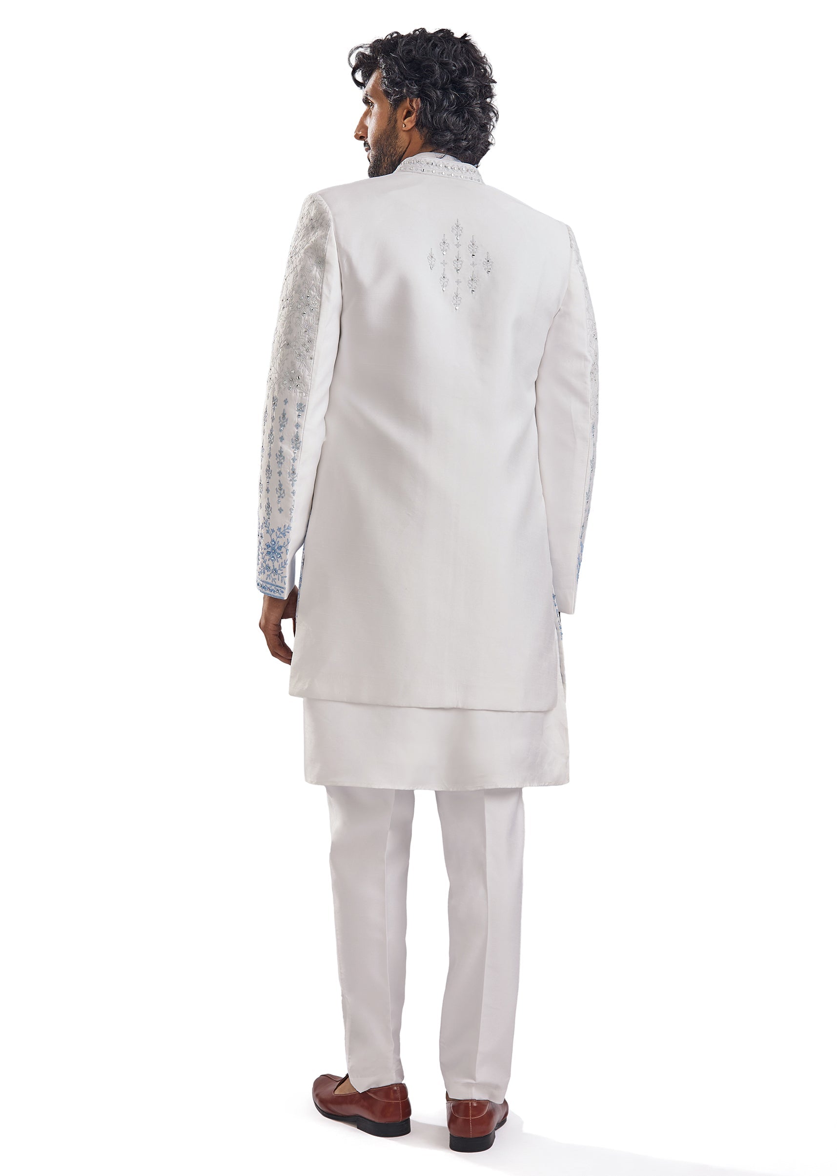 Sharp and statement-making, this blue silk groomsman sherwani is elevated with intricate thread, resham, and mirror work embroidery that catches the light beautifully at sangeet and engagement celebrations. The mandarin... More Product Details