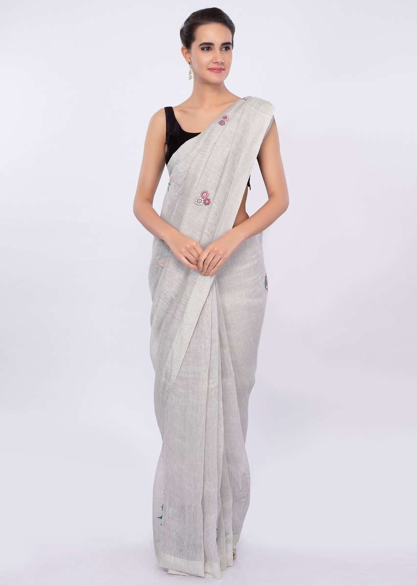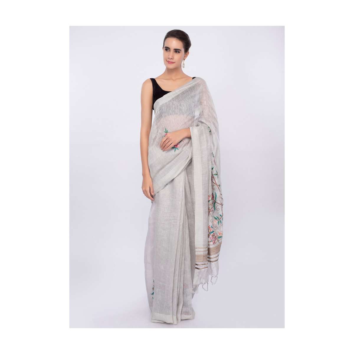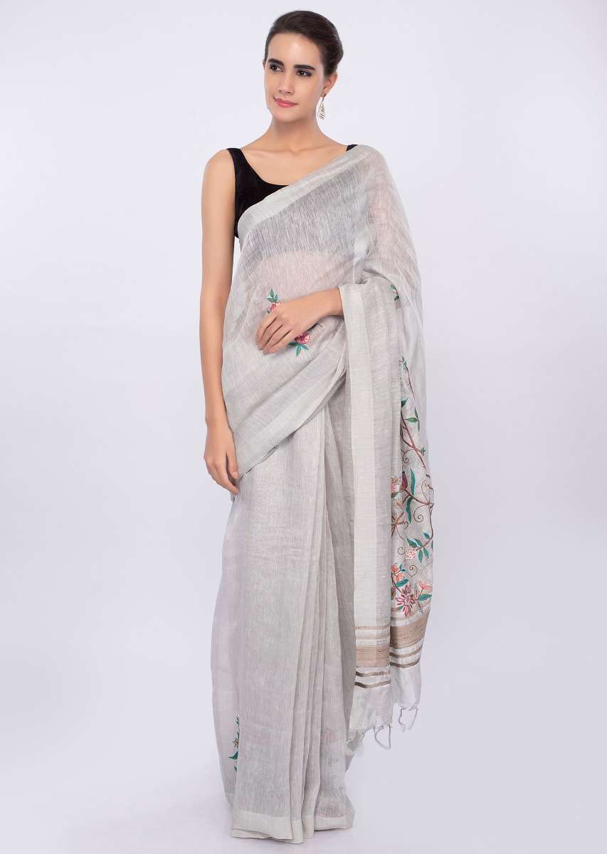 Cloud Grey Saree In Linen With Floral Embroidery And Butti Online - Kalki Fashion