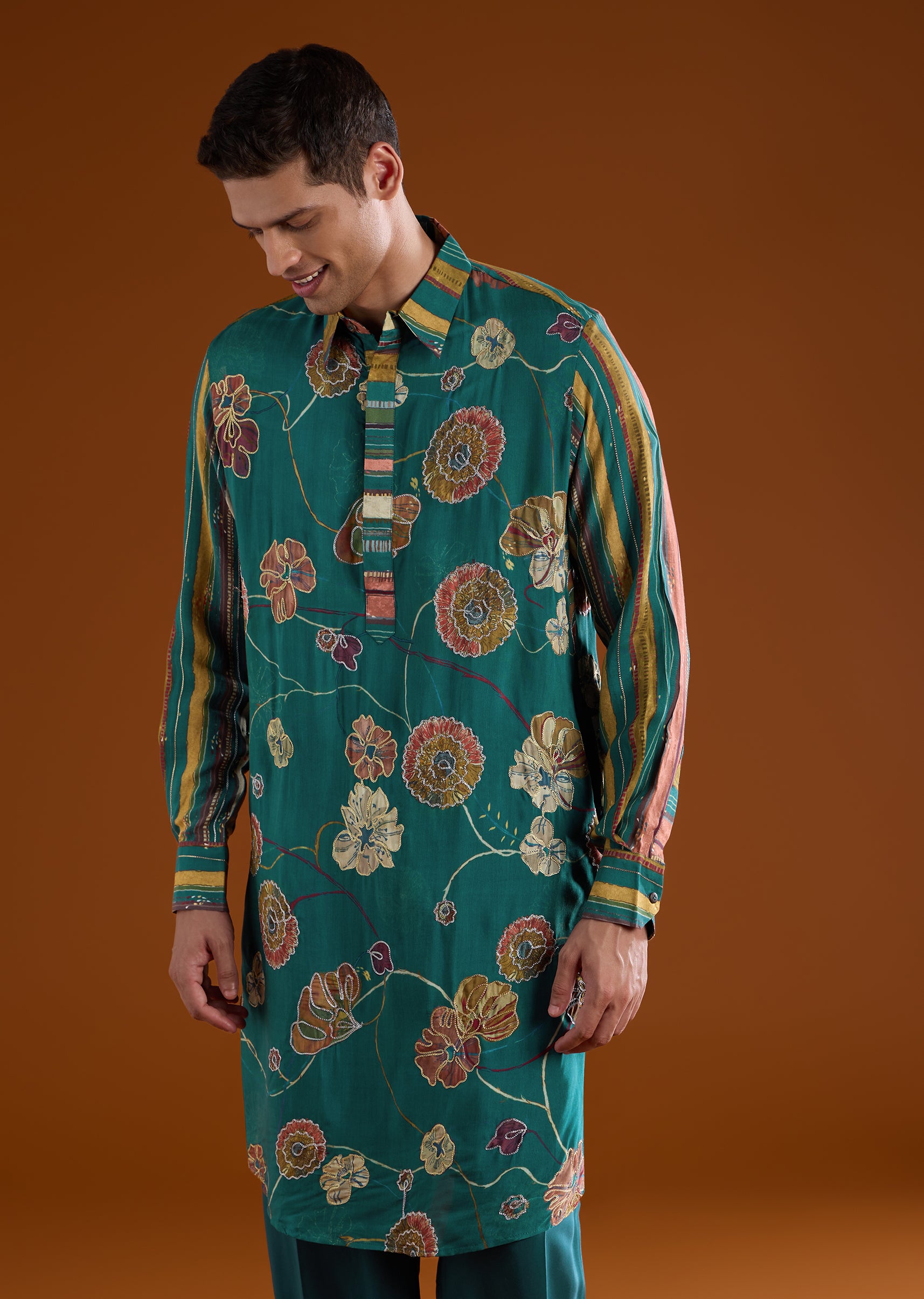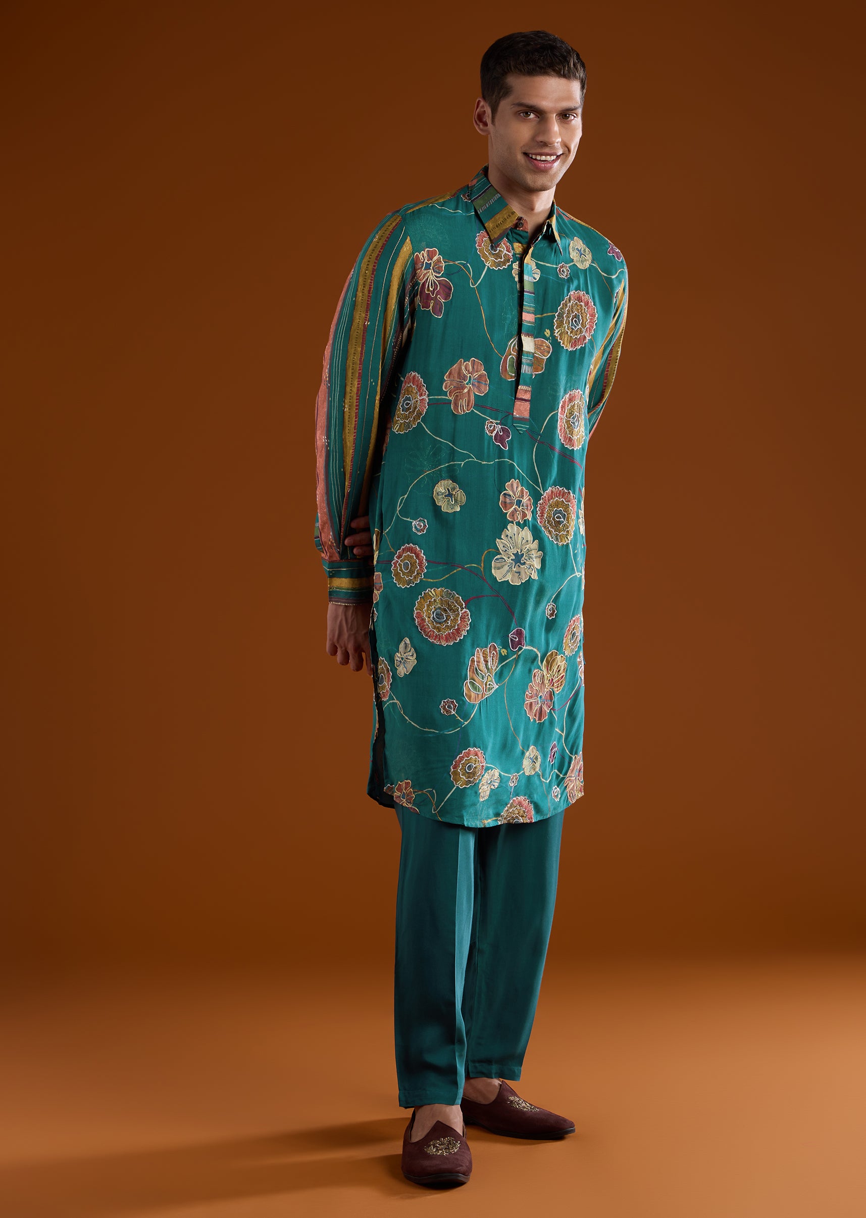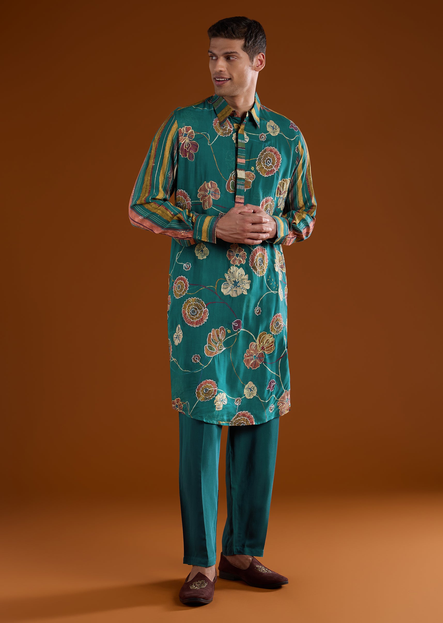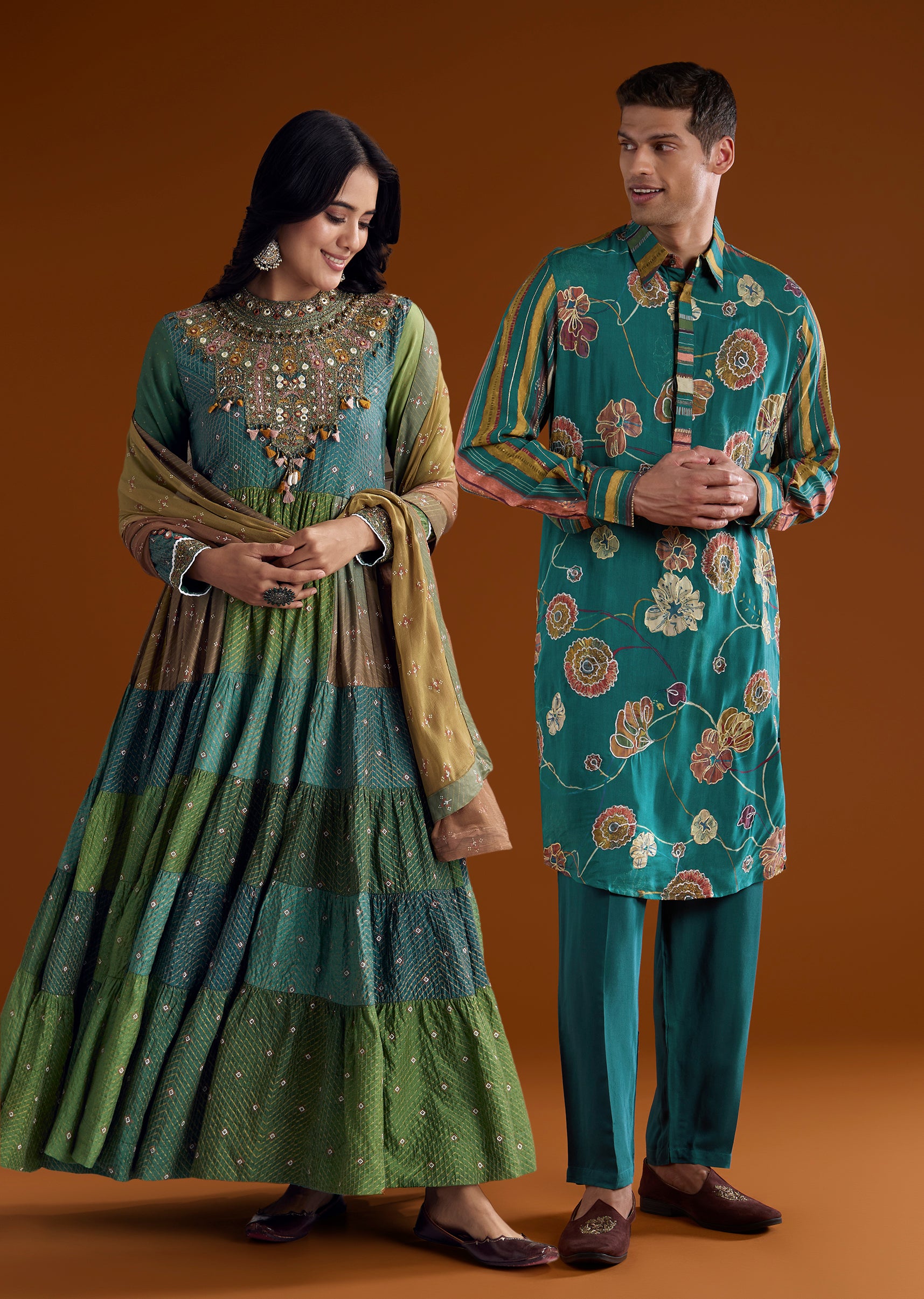 Colourful Artisan Festive Couple Set – Multi-Color Chanderi Anarkali For Her And Teal Kalamkari Kurta Set For Him