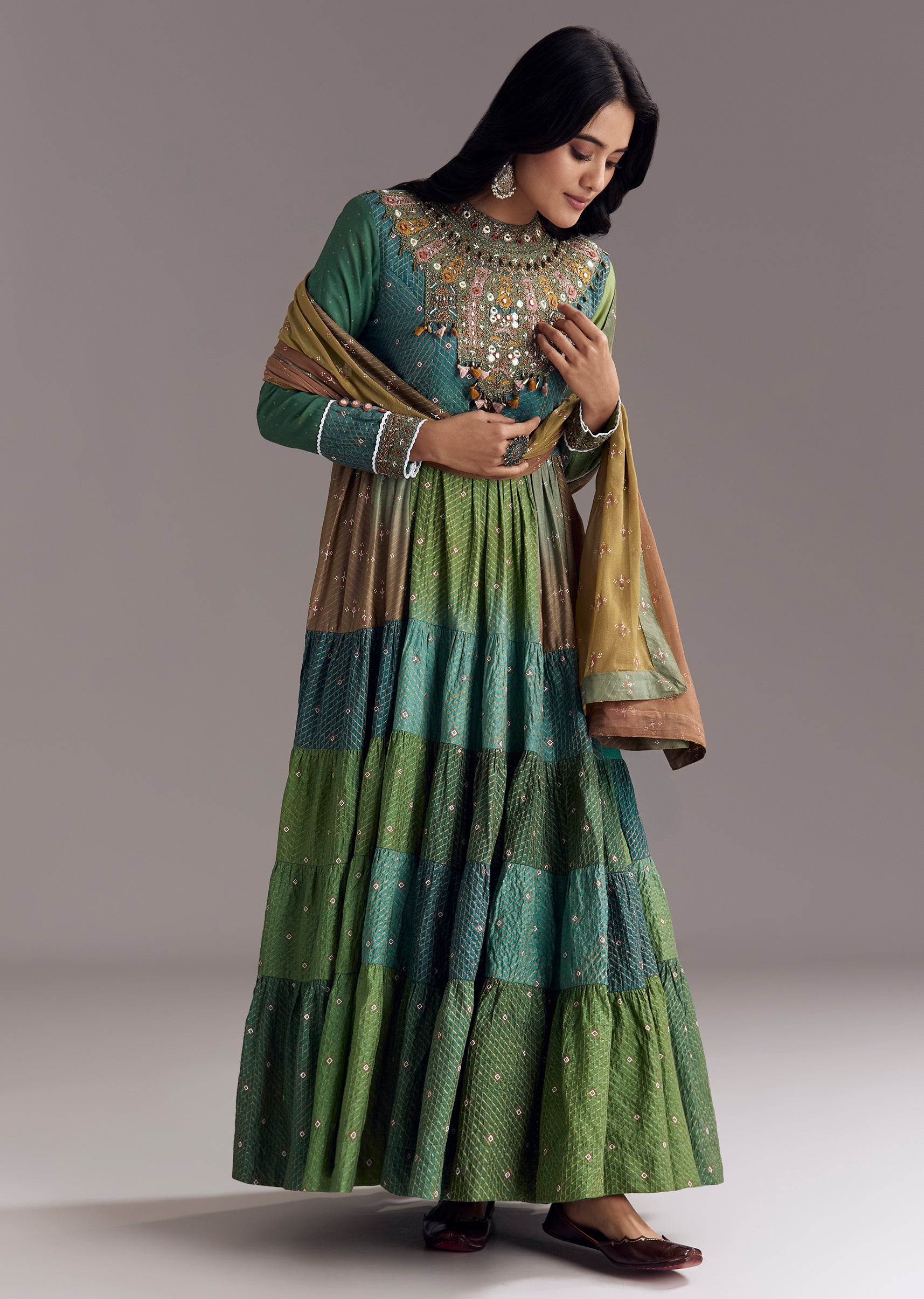 Vibrant and expressive, this multi-color printed chanderi anarkali brings playful festive energy.