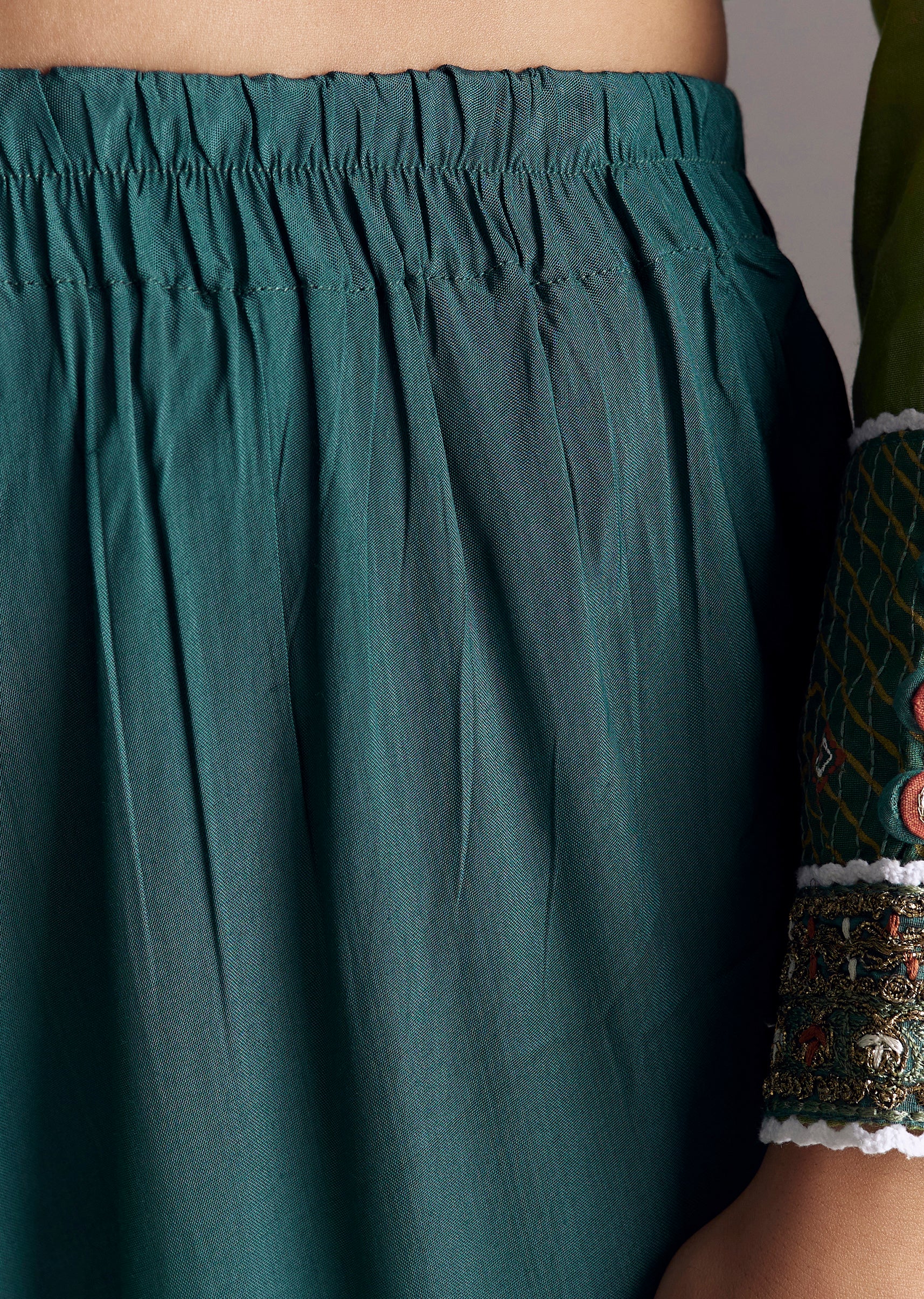 Artistic and elegant, this teal muslin kurta set with printed kalamkari adds cultural richness to coordinated styling.