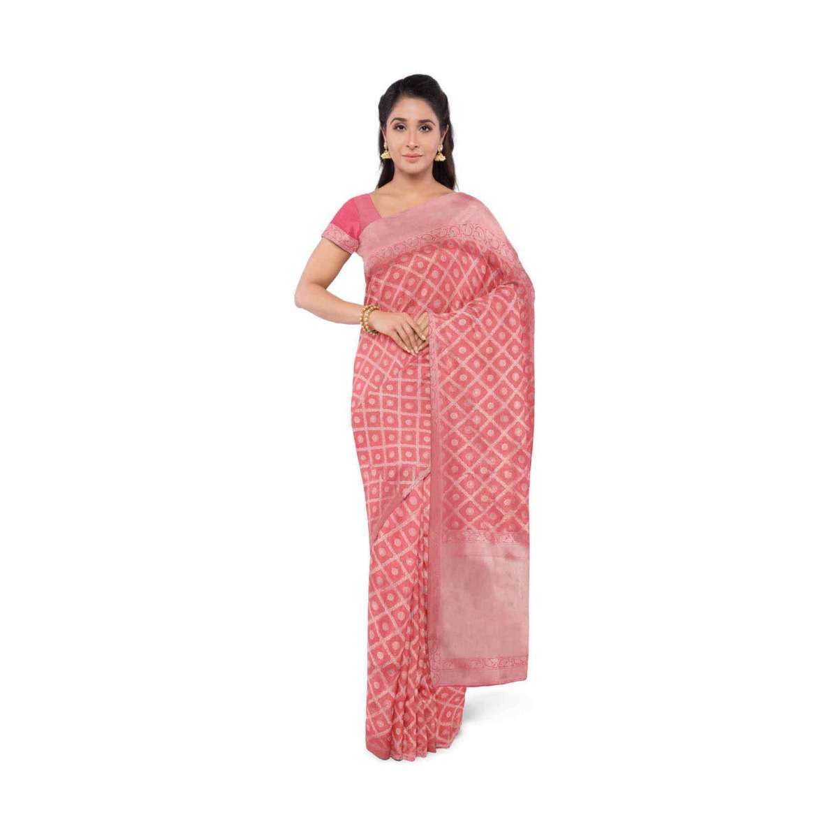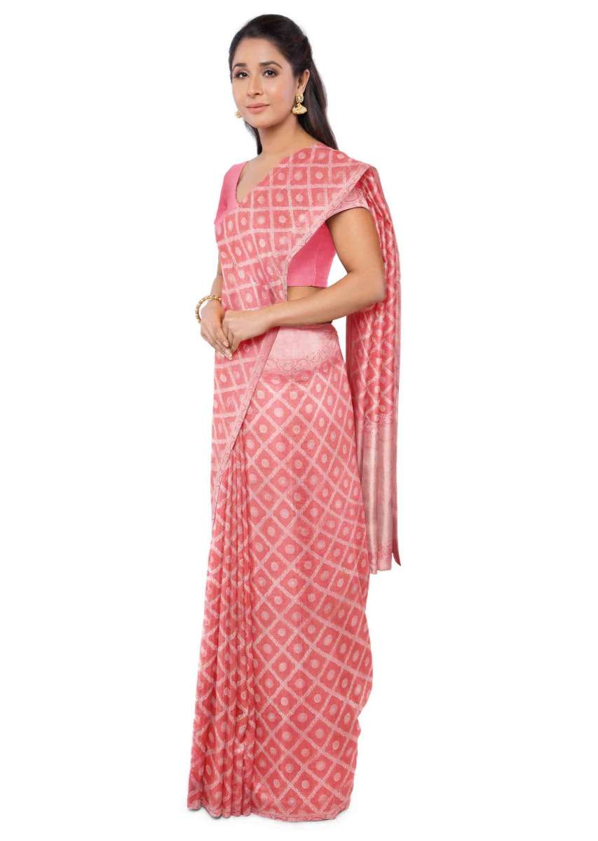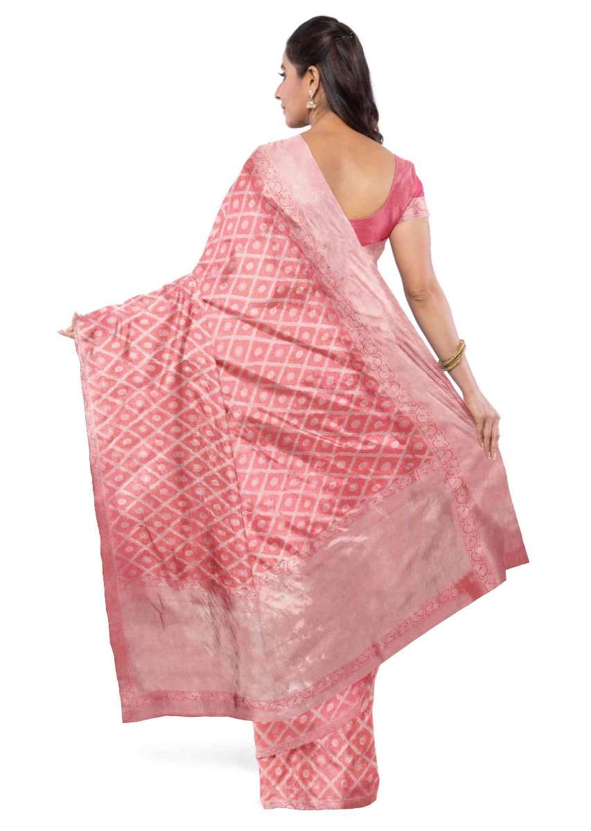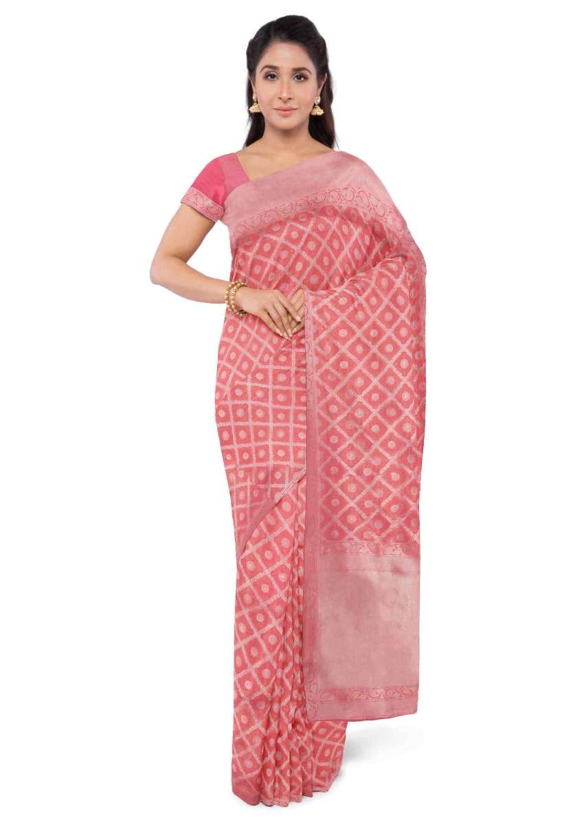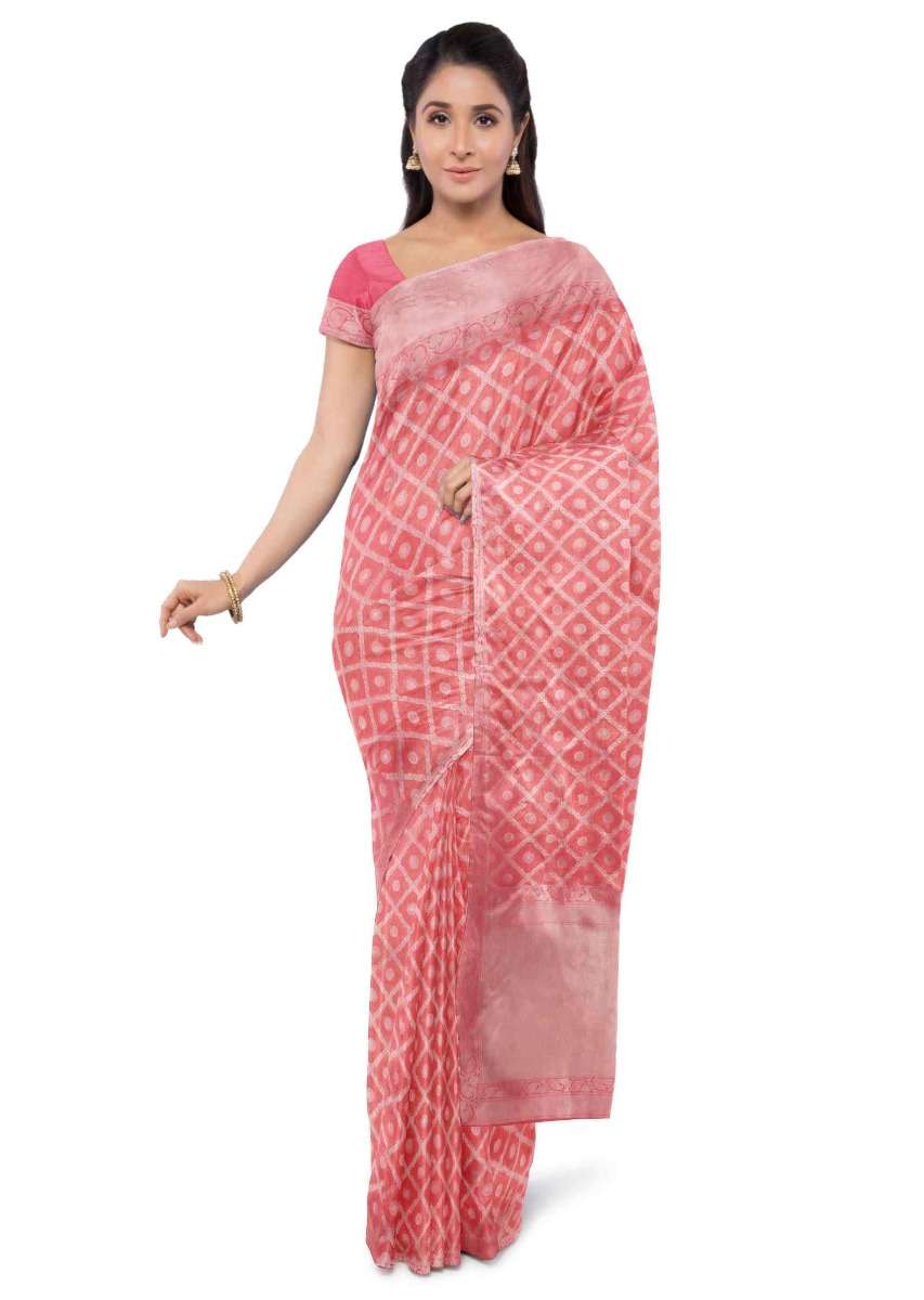 Coral Peach Banarasi Saree With Two Toned Matching Blouse Piece Online - Kalki Fashion