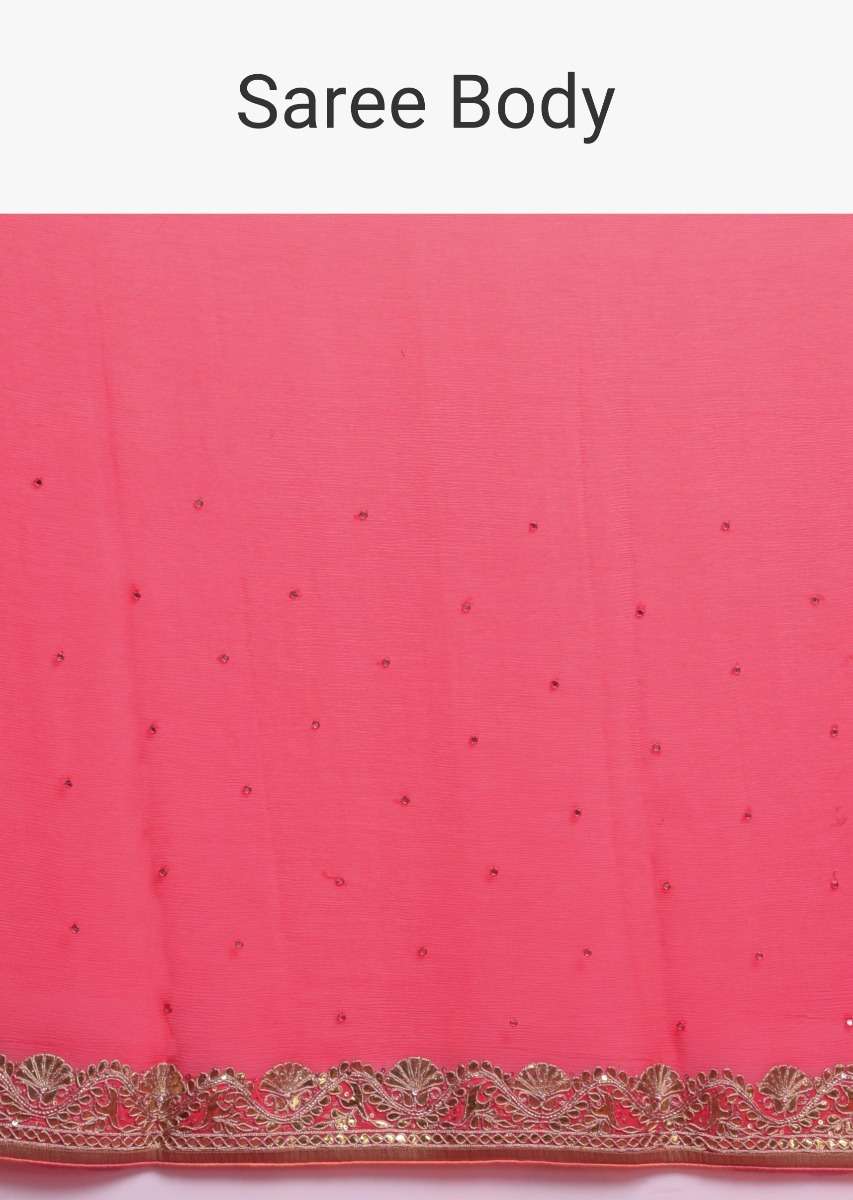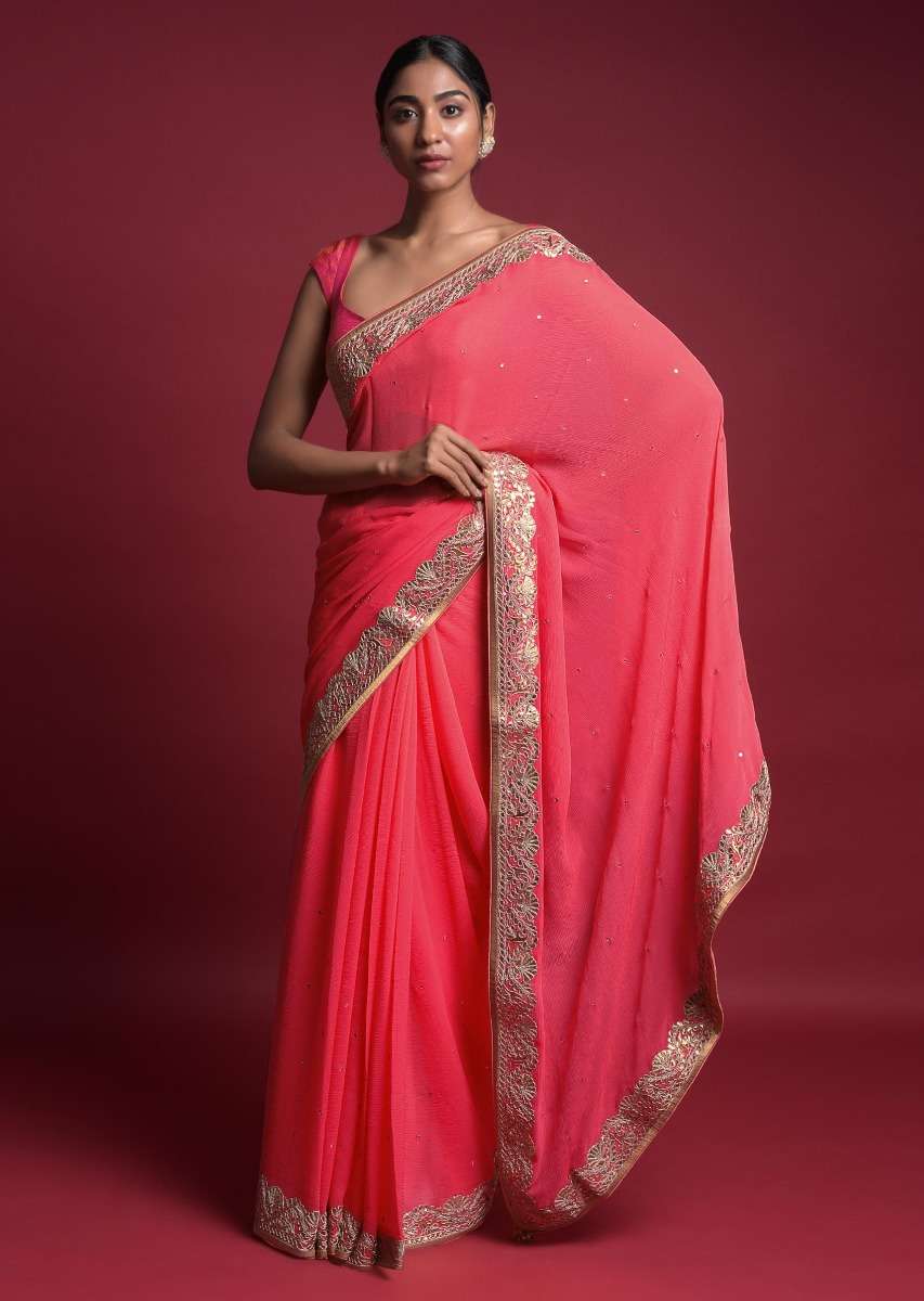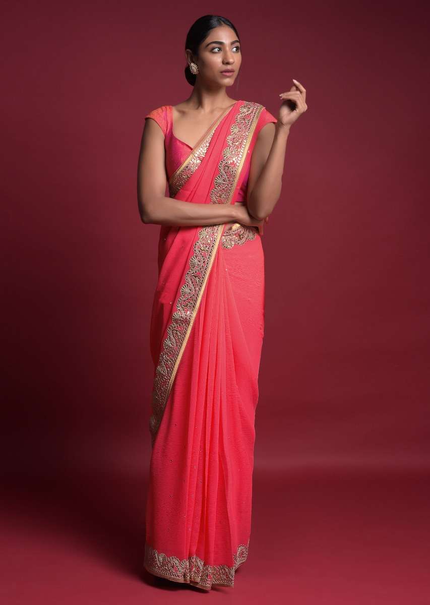 Coral Saree In Chiffon With Mirror Abla Buttis And Gotta Patch Embroidered Border Online - Kalki Fashion