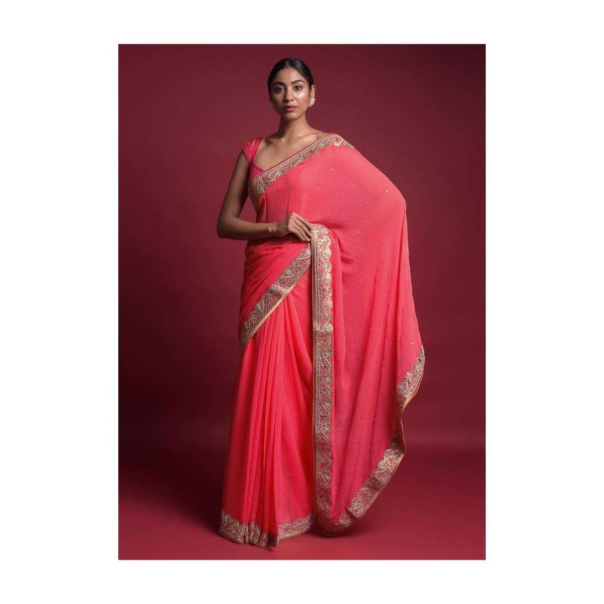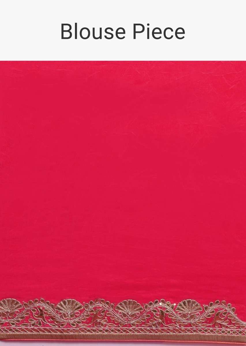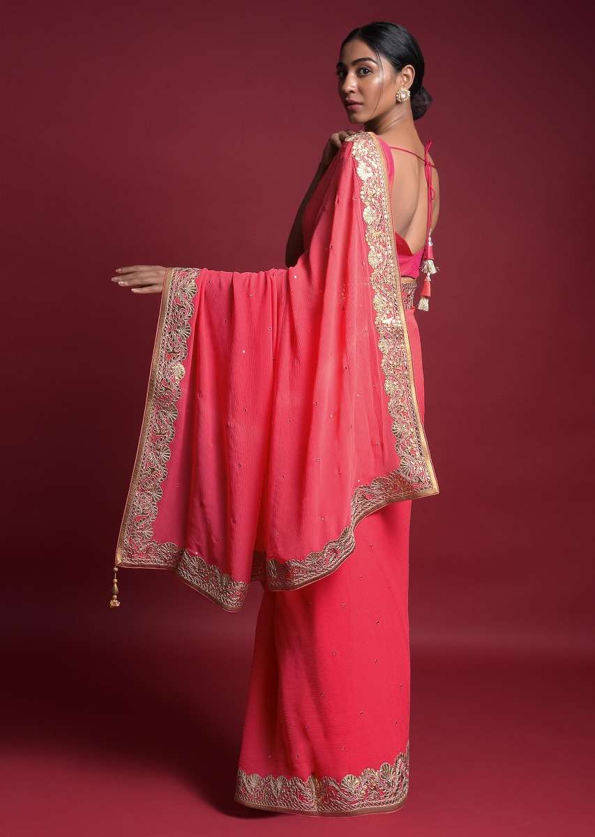 Coral Saree In Chiffon With Mirror Abla Buttis And Gotta Patch Embroidered Border Online - Kalki Fashion