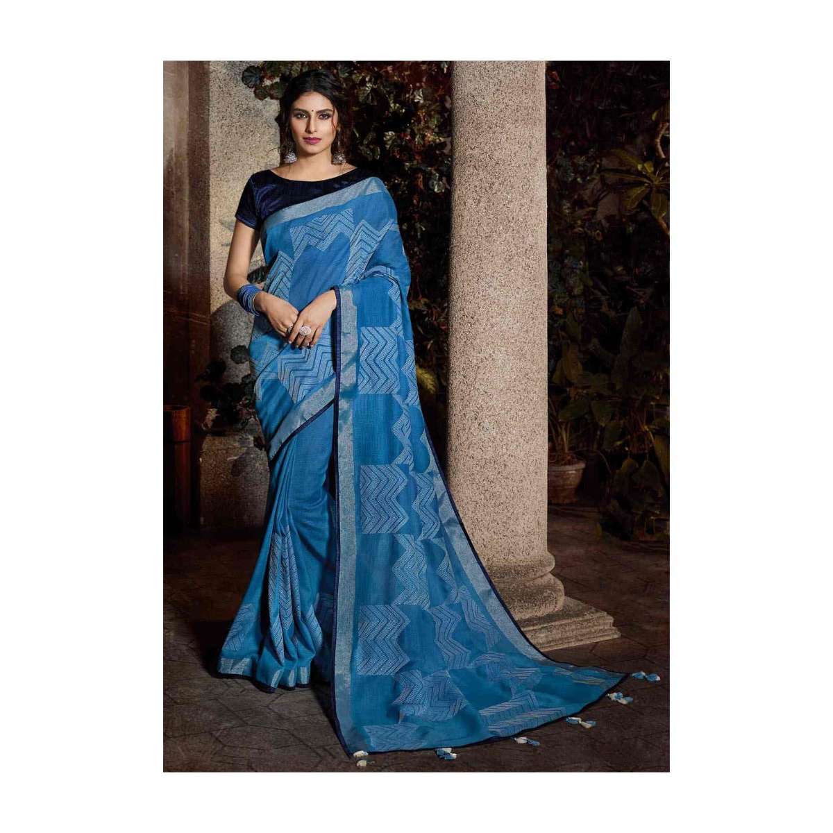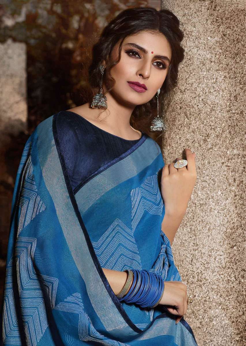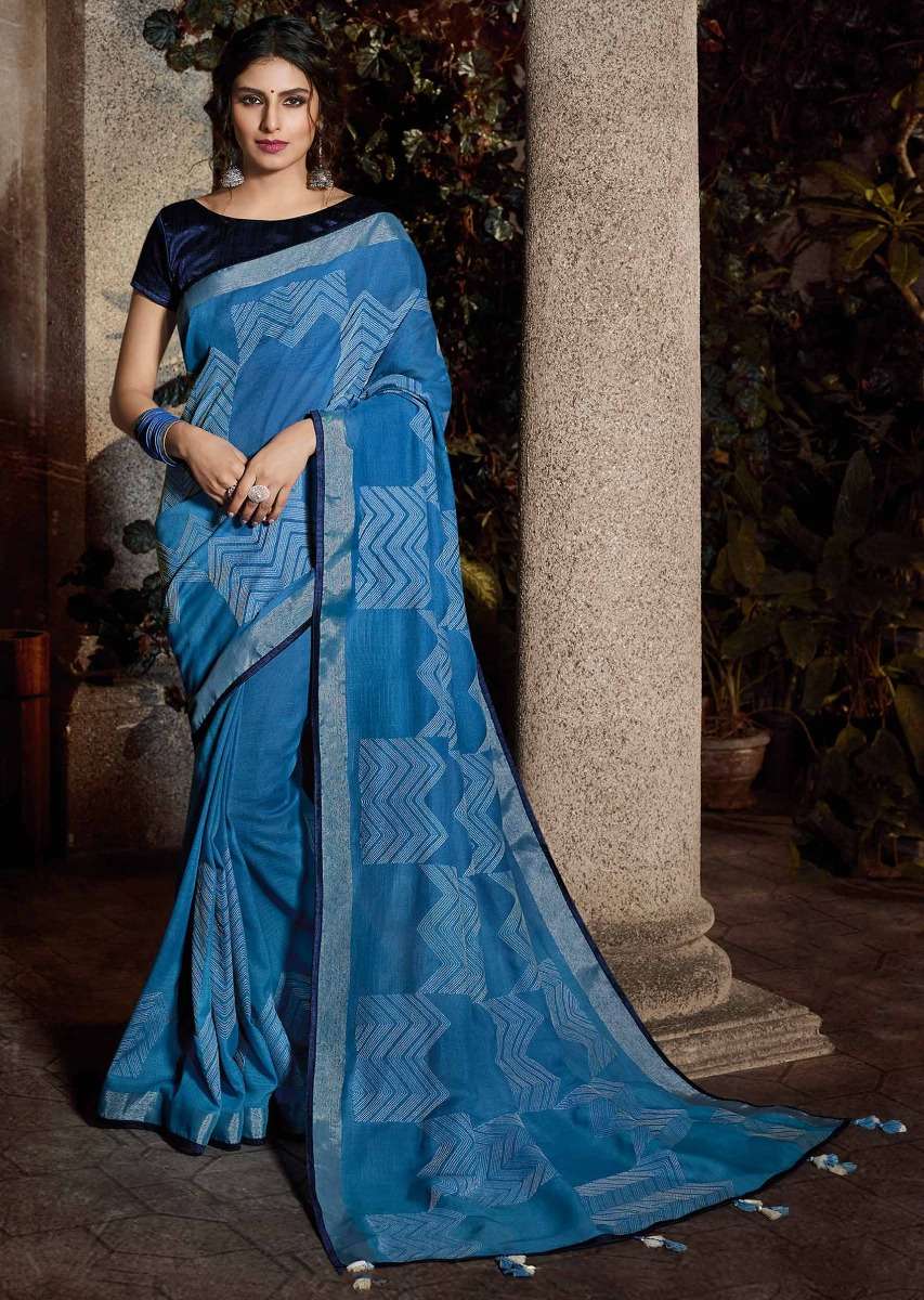 Cornflower Blue Saree In Cotton With Midnight Blue Silk Blouse Piece Online - Kalki Fashion