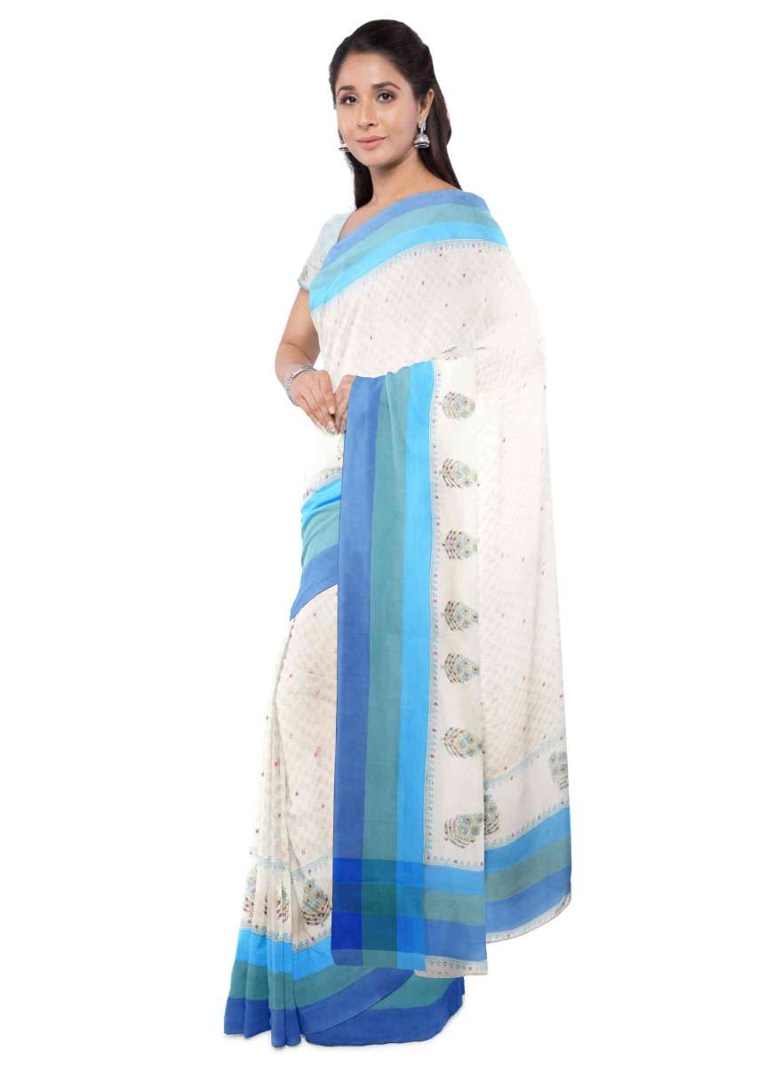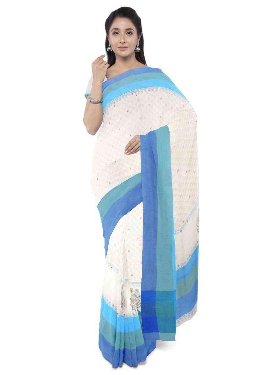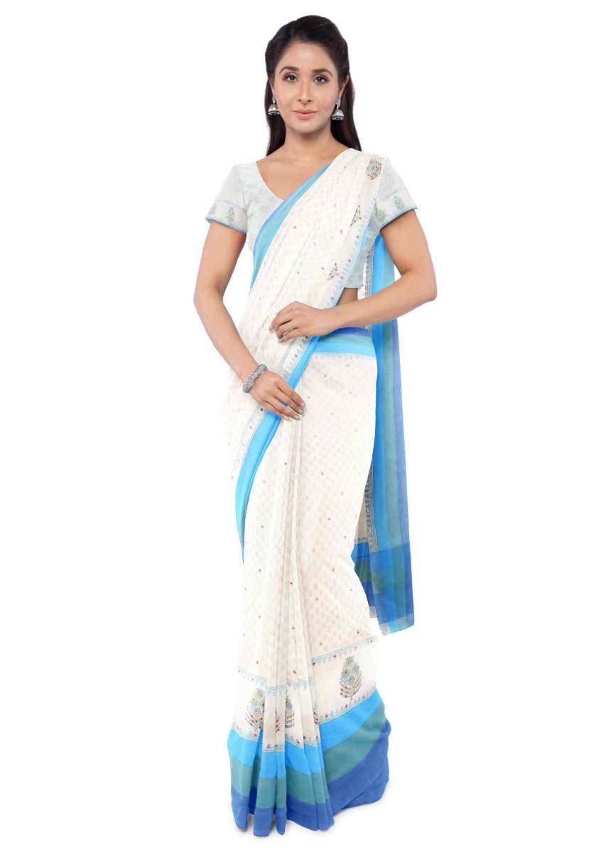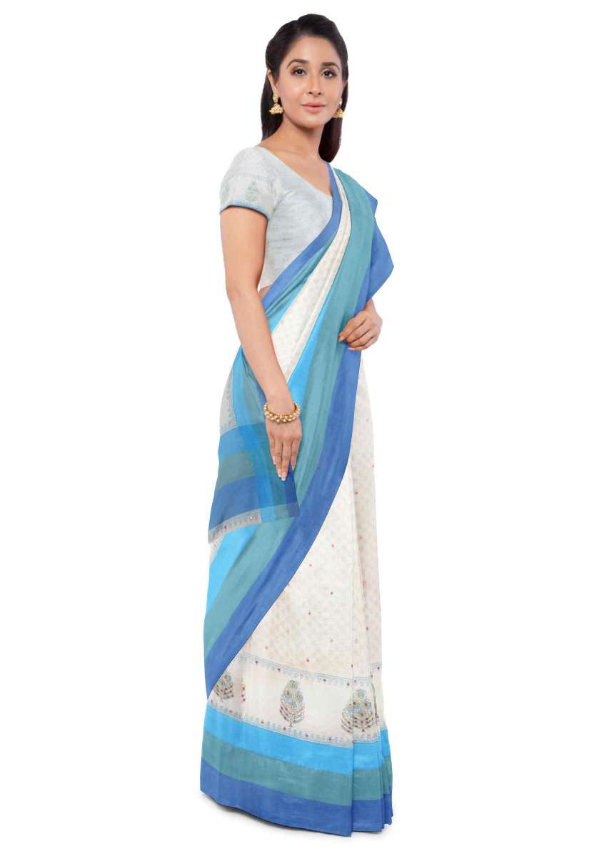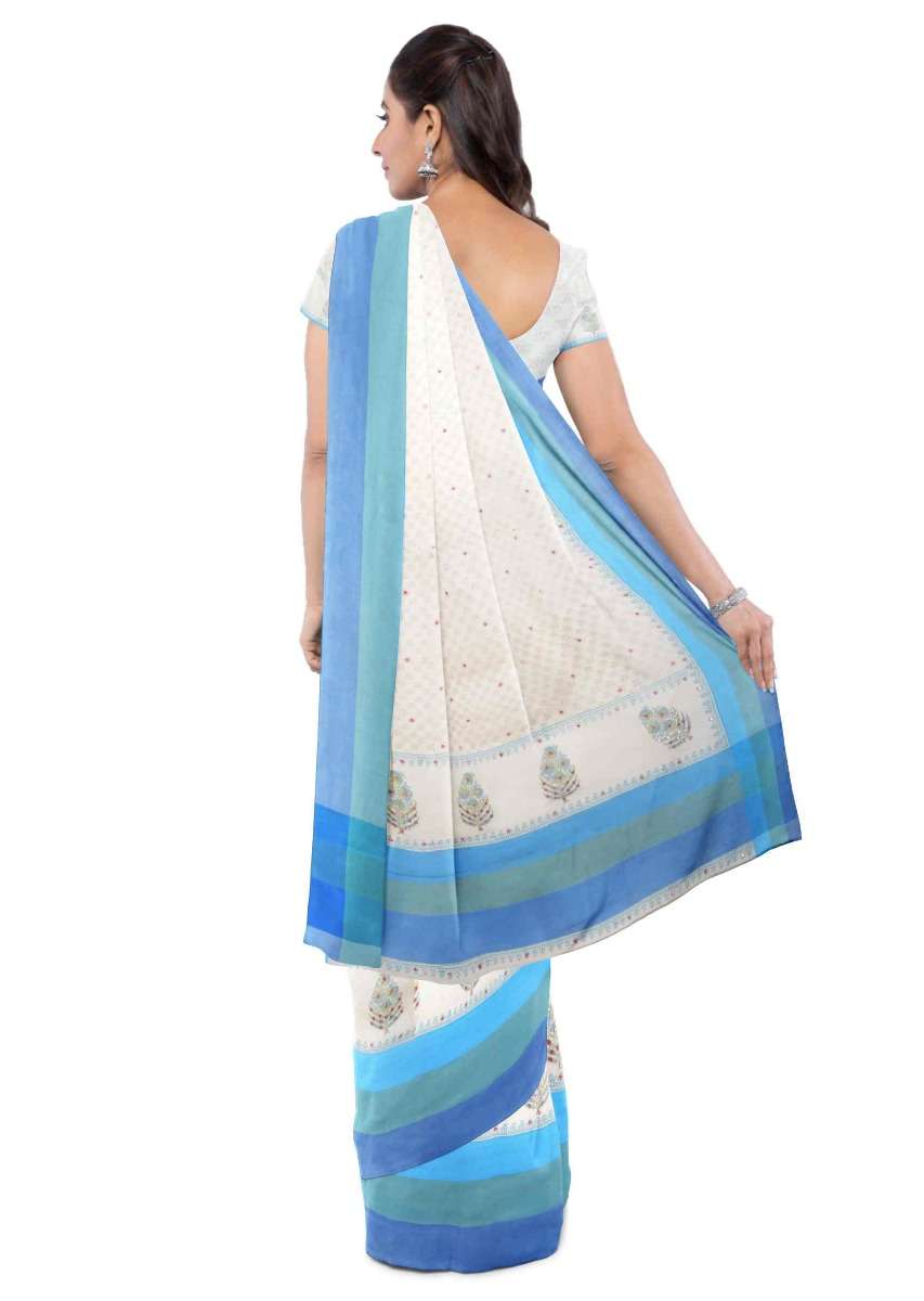 Cream Banarasi Saree With Blue With Abla Butti Work Online - Kalki Fashion