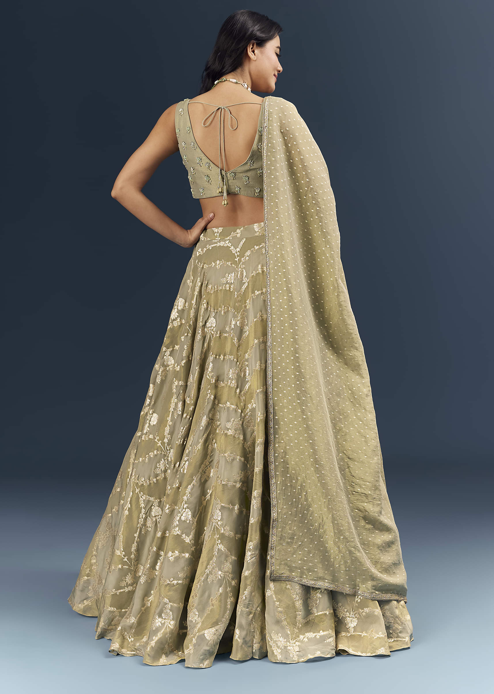 Clean and sophisticated, this cream banarasi silk bridesmaid lehenga lets texture lead while keeping the silhouette light. Zardosi joins sequins, beads, and lace in detailed hand work that reads couture... More Product Details