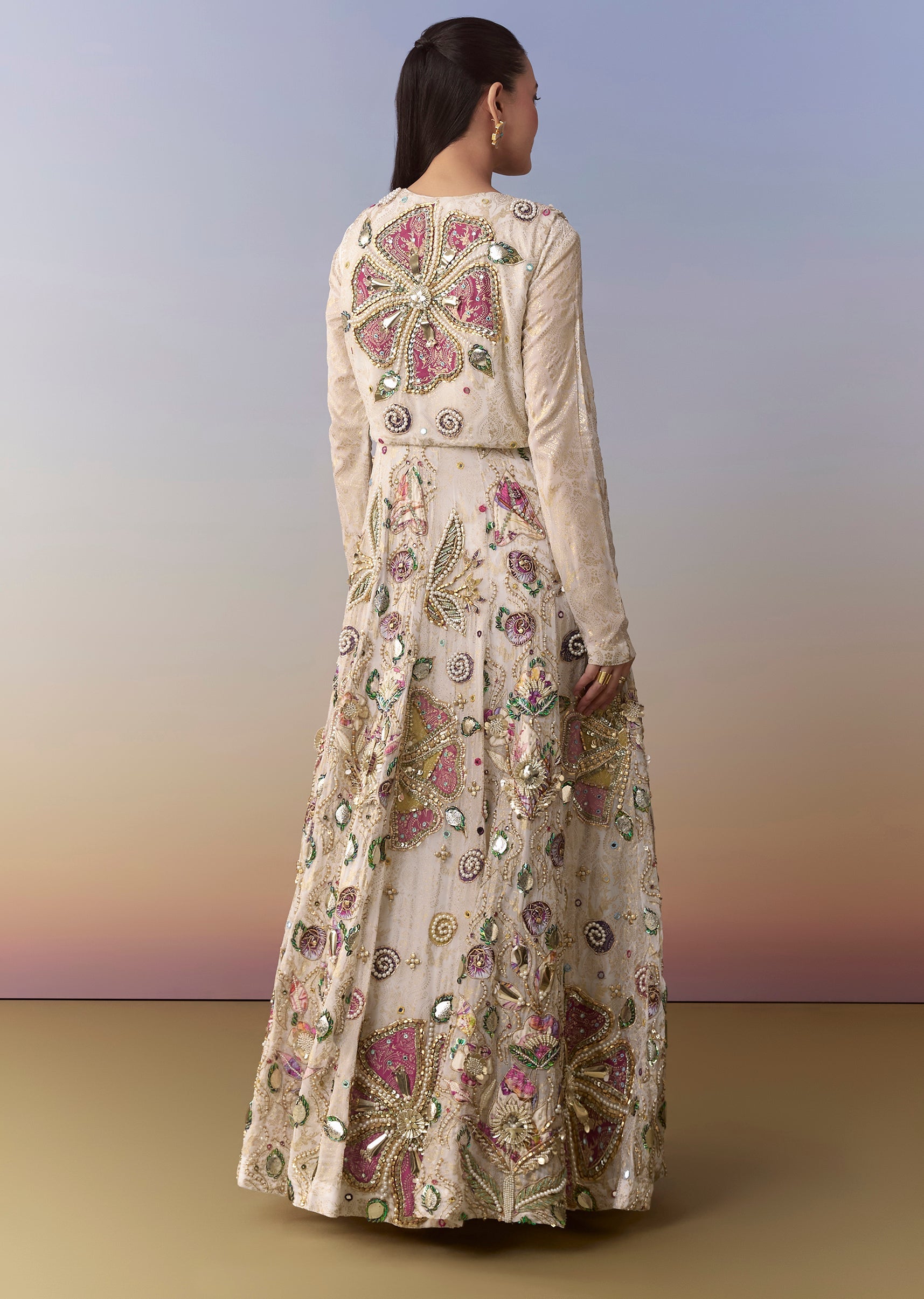 Embrace refined elegance with this cream gown set, paired with a beautifully crafted jacket featuring intricate patchwork enhanced with beads and gota detailing. The flowing gown offers a graceful, contemporary silhouette, while the embellished jacket adds festive richness and texture. Perfect for weddings, receptions, or special celebrations, this ensemble blends classic craftsmanship with modern sophistication. Awarded as the Most Trusted Brand, we're delivering styles you love, just as promised.