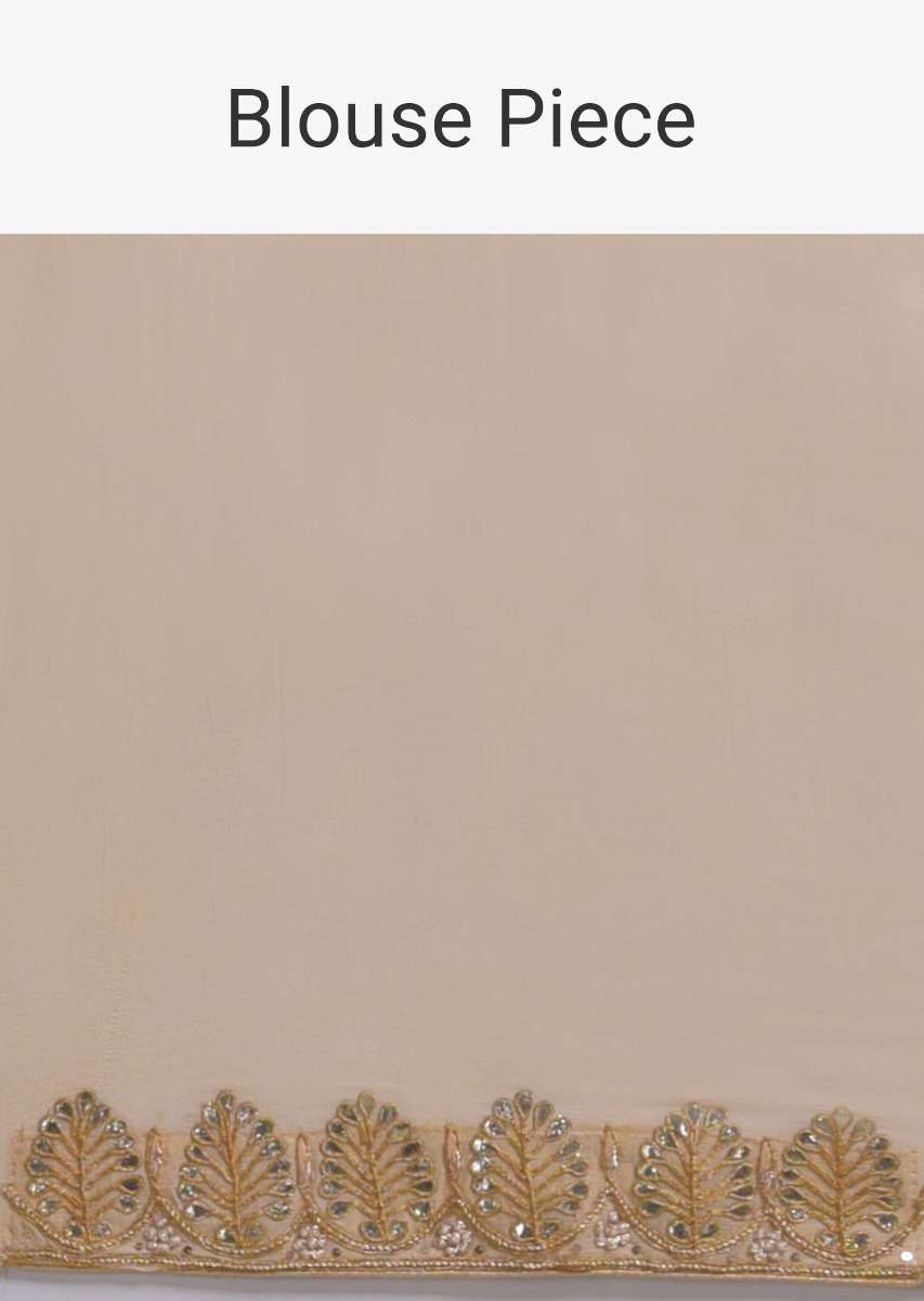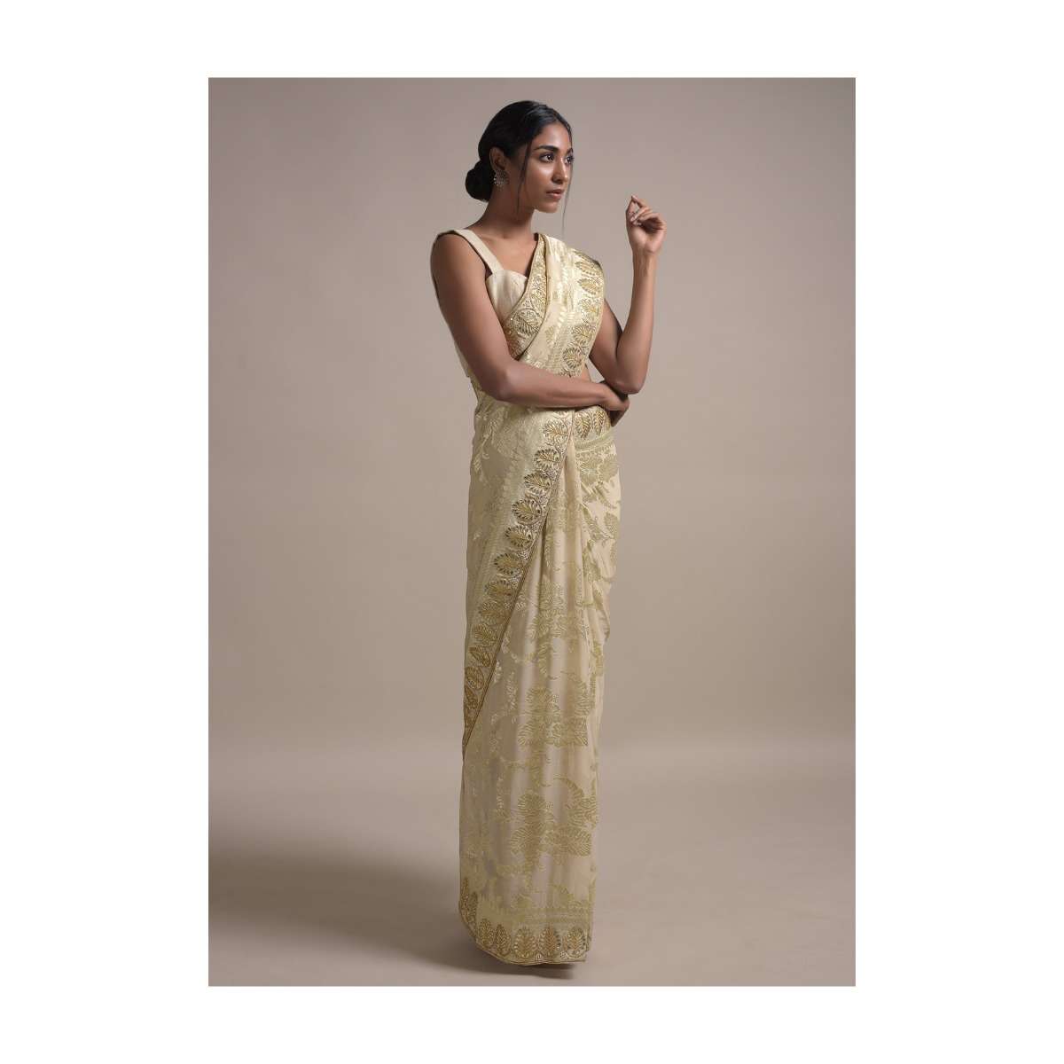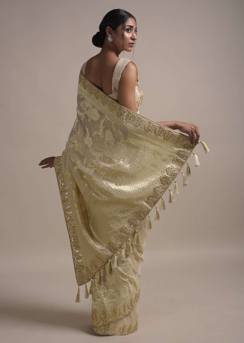Cream Beige Saree In Georgette With Weaved Floral Jaal And Gotta Embroidered Border Online - Kalki Fashion