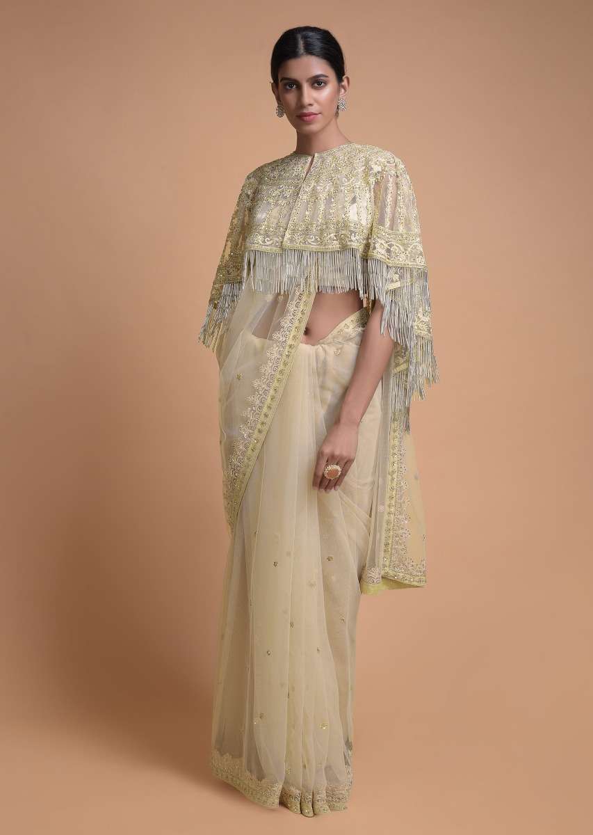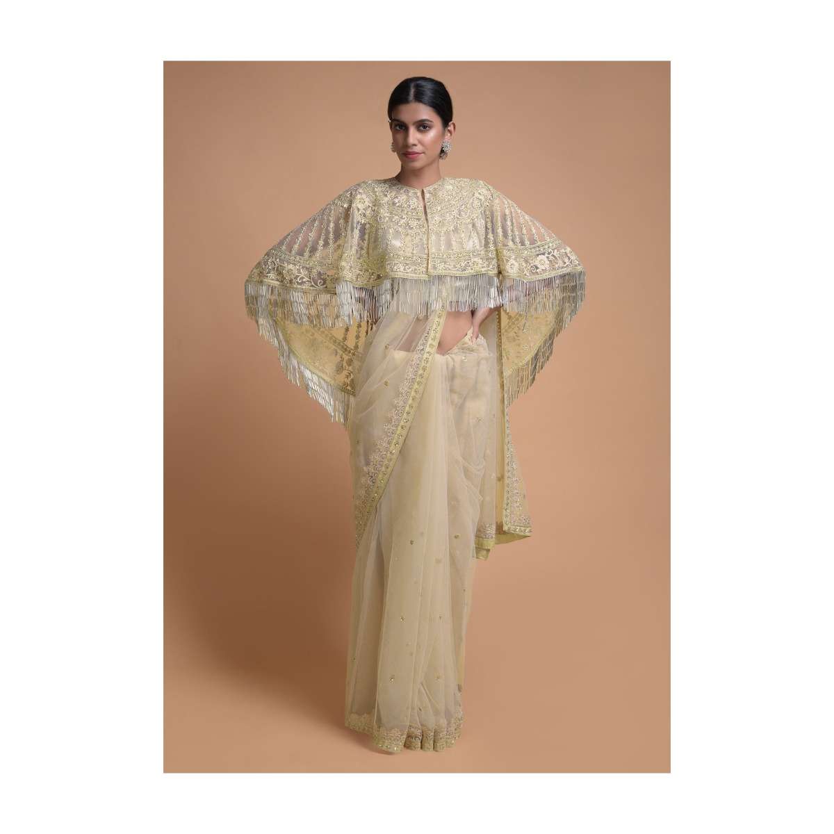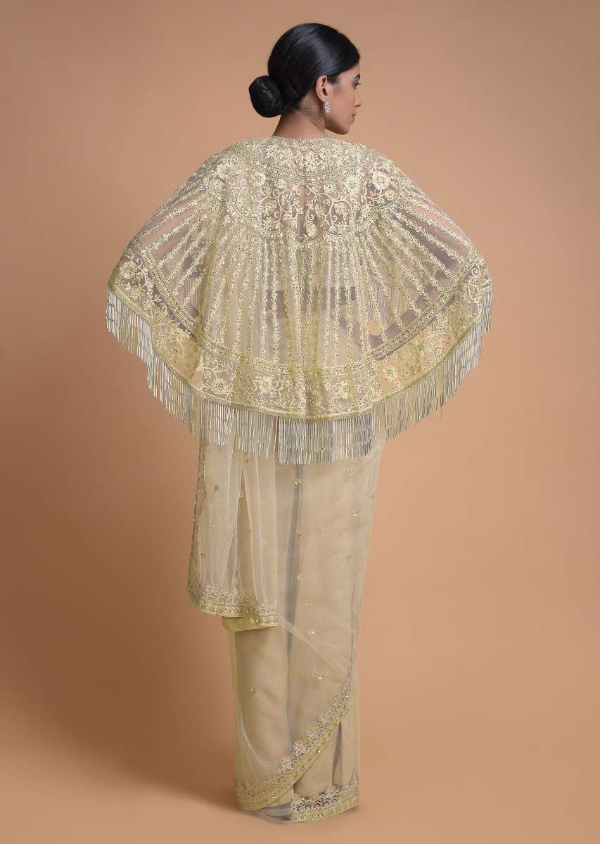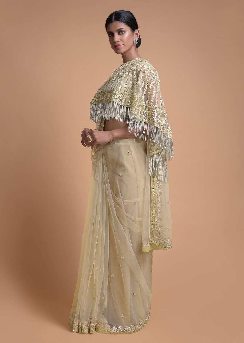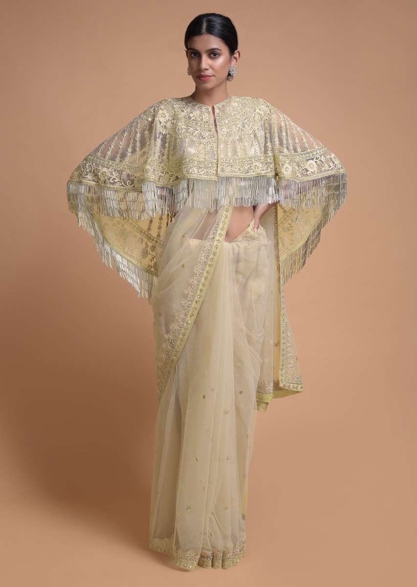 Cream Beige Saree In Net With Matching Cape Having Jaal Embroidery And Fringes Online - Kalki Fashion
