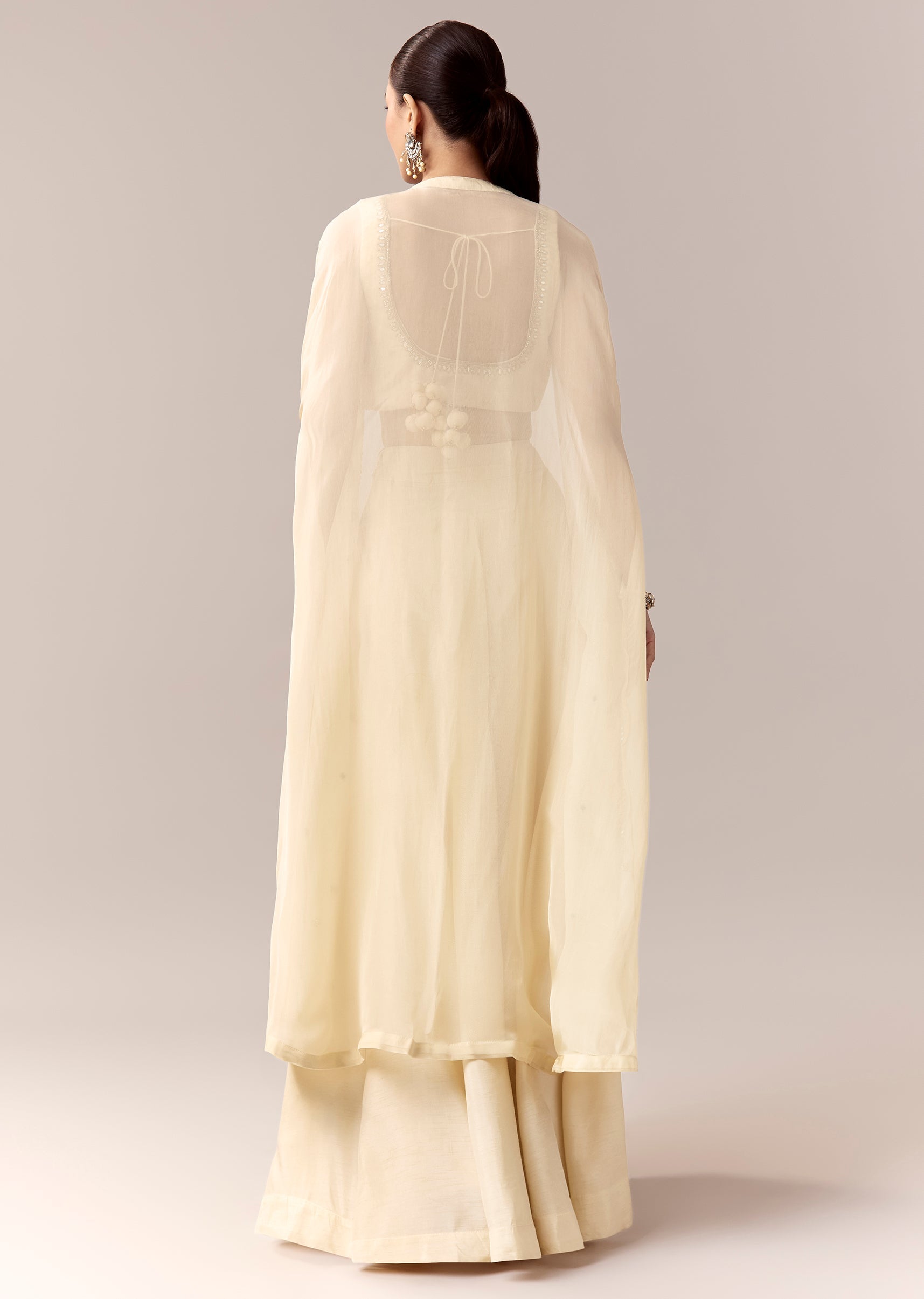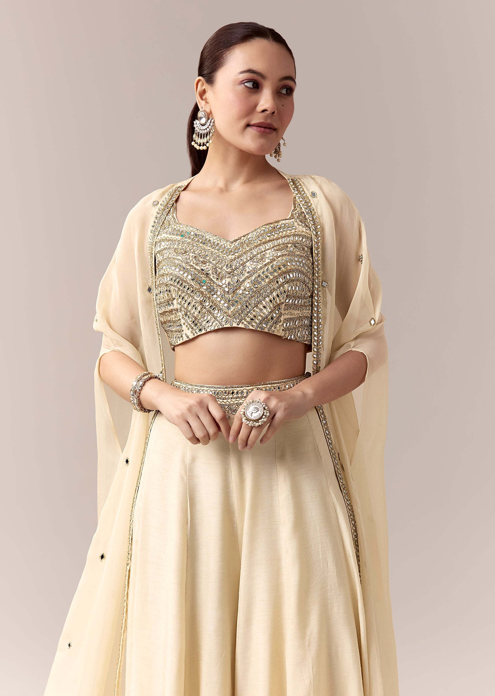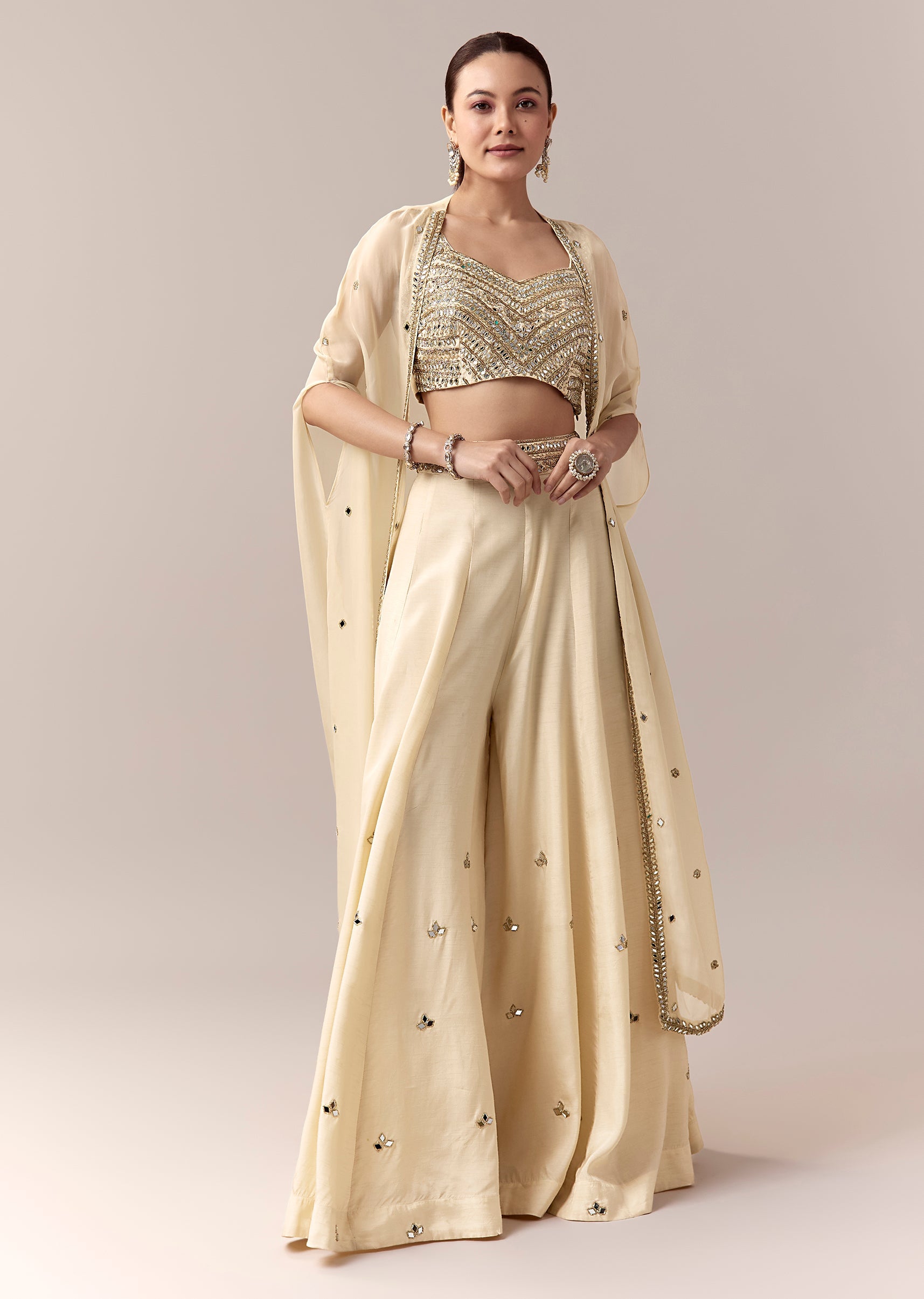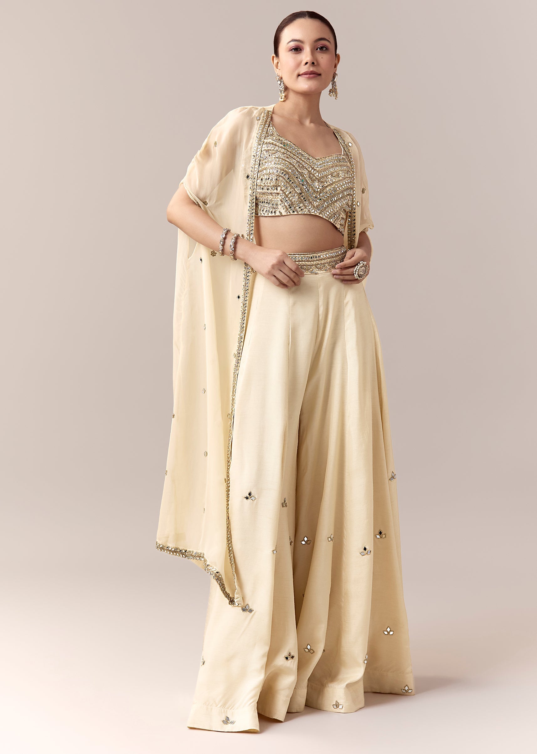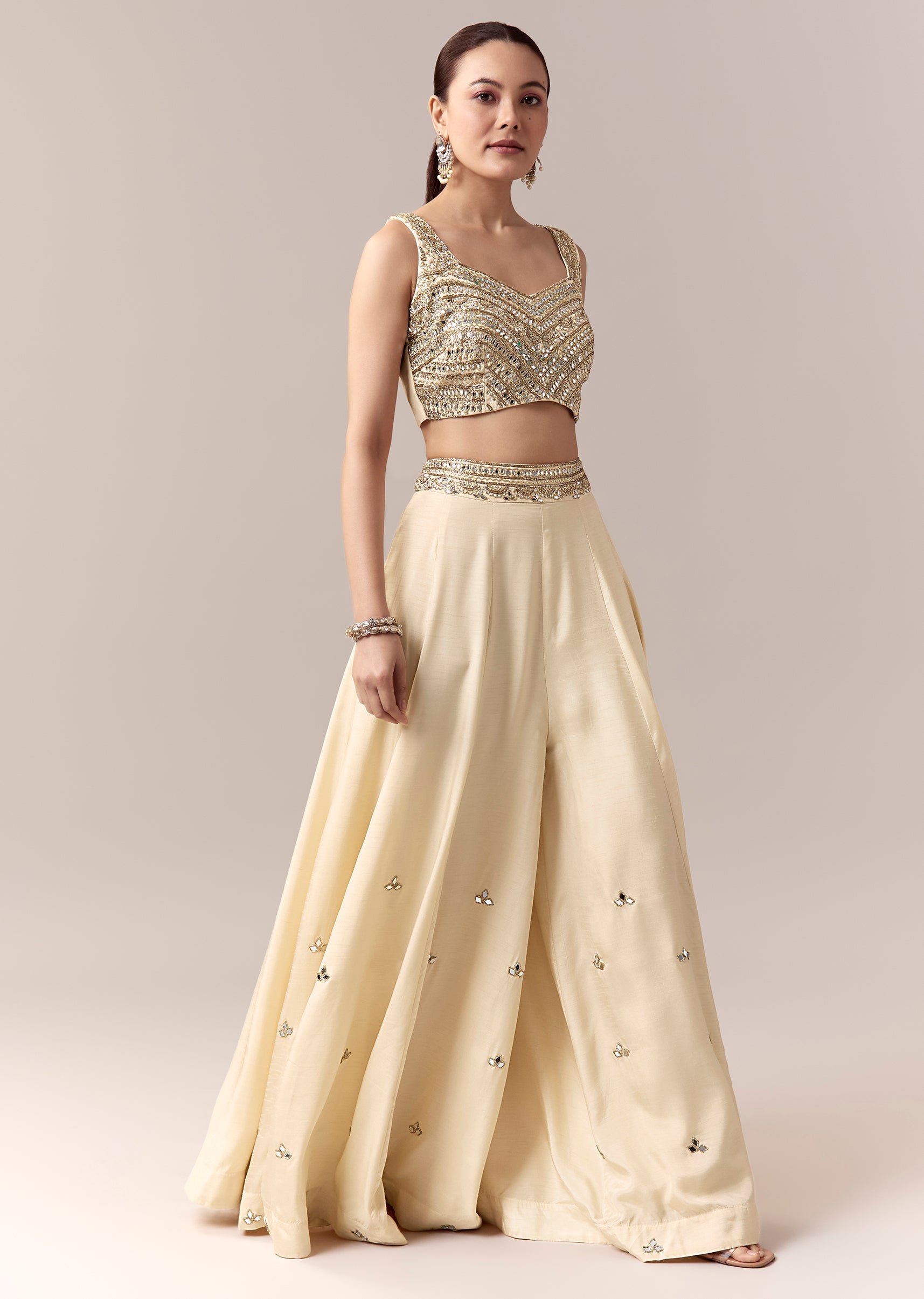 Cream Crop Top Pants Indo Western With Mirror Cut Dana Work