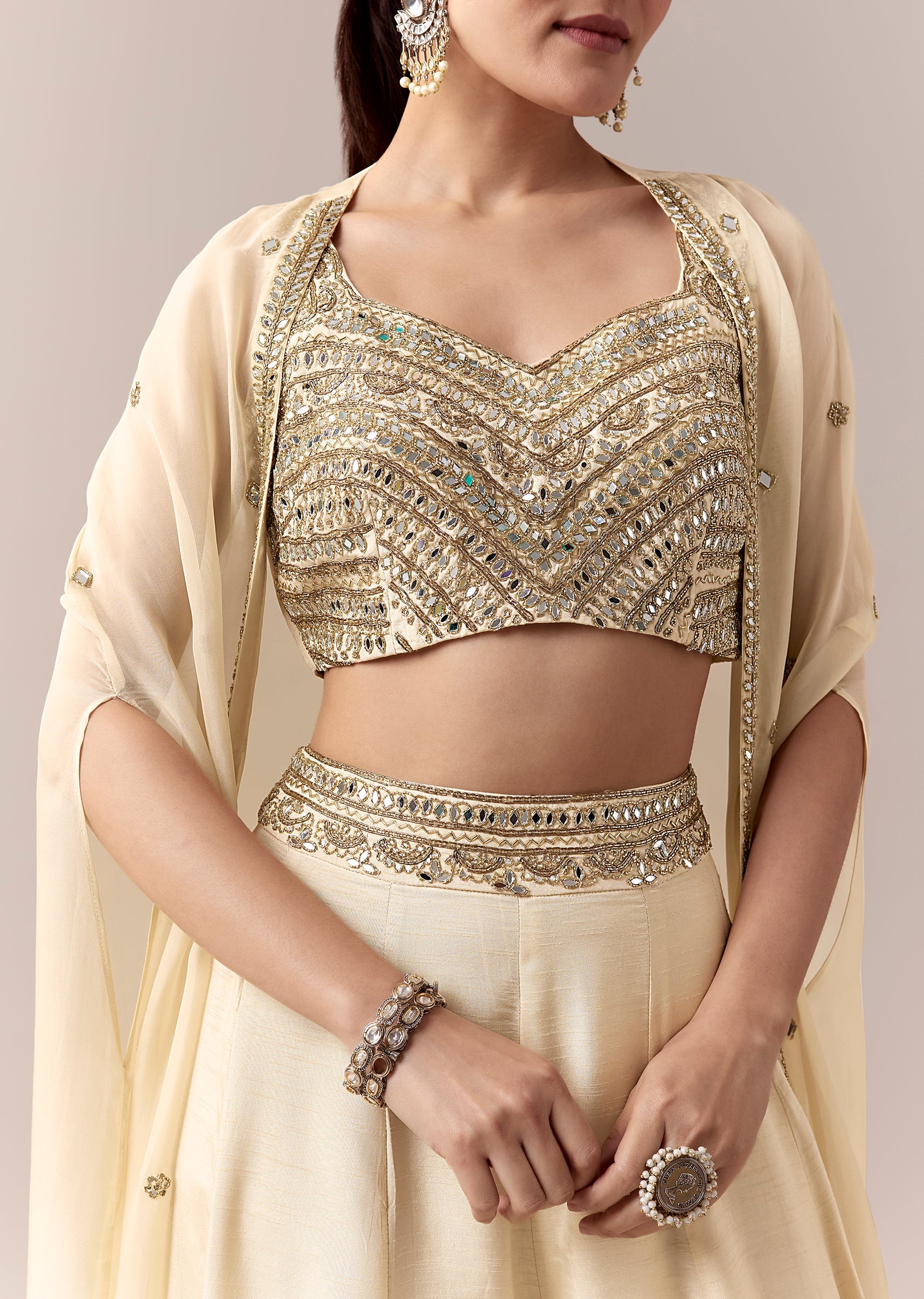Soft and serene in pastel tones, this cream crop top and pants set brings a refined charm perfect for mehendi and sangeet festivities. The sleeveless crop top features delicate mirror and cut dana work that adds a subtle shimmer, beautifully paired with a flowing cape enhanced with intricate mirror detailing for elevated elegance. Crafted in silk for a luxurious drape, the sweetheart neckline adds feminine grace, while the coordinated pants complete the contemporary silhouette ideal for a stylish wedding guest. Awarded as the Most Trusted Brand, we're delivering styles you love, just as promised.