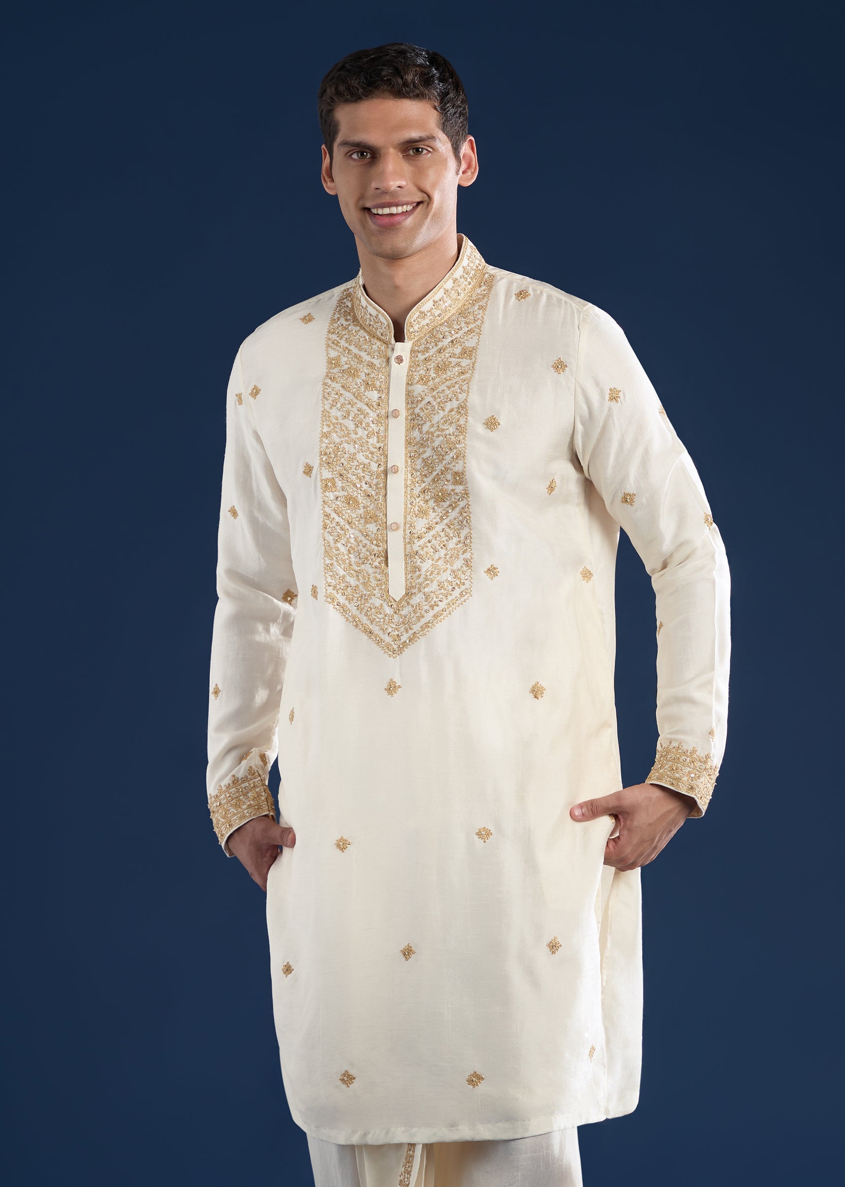 Elegant and ceremonial, this cream kurta set is designed for wedding occasions. Crafted in rich silk, it features intricate dori work, resham thread, and zari detailing for a regal finish. Paired with a coordinated dhoti and dupatta, this ensemble is ideal for groomsmen seeking a distinguished traditional look. Awarded as the Most Trusted Brand, we're delivering styles you love, just as promised.