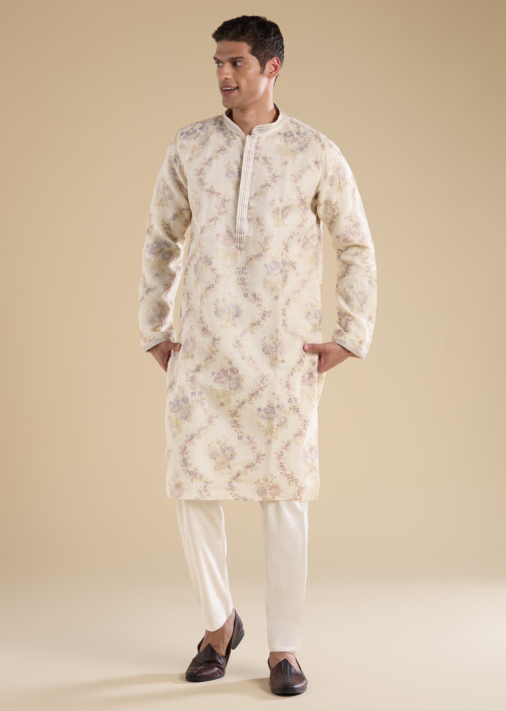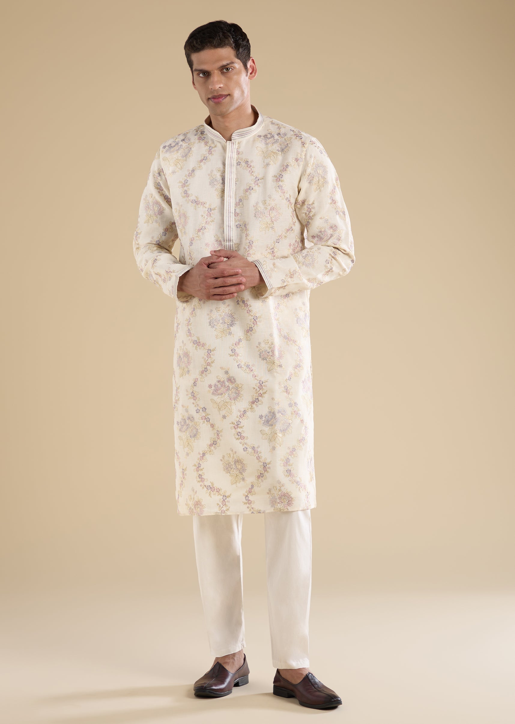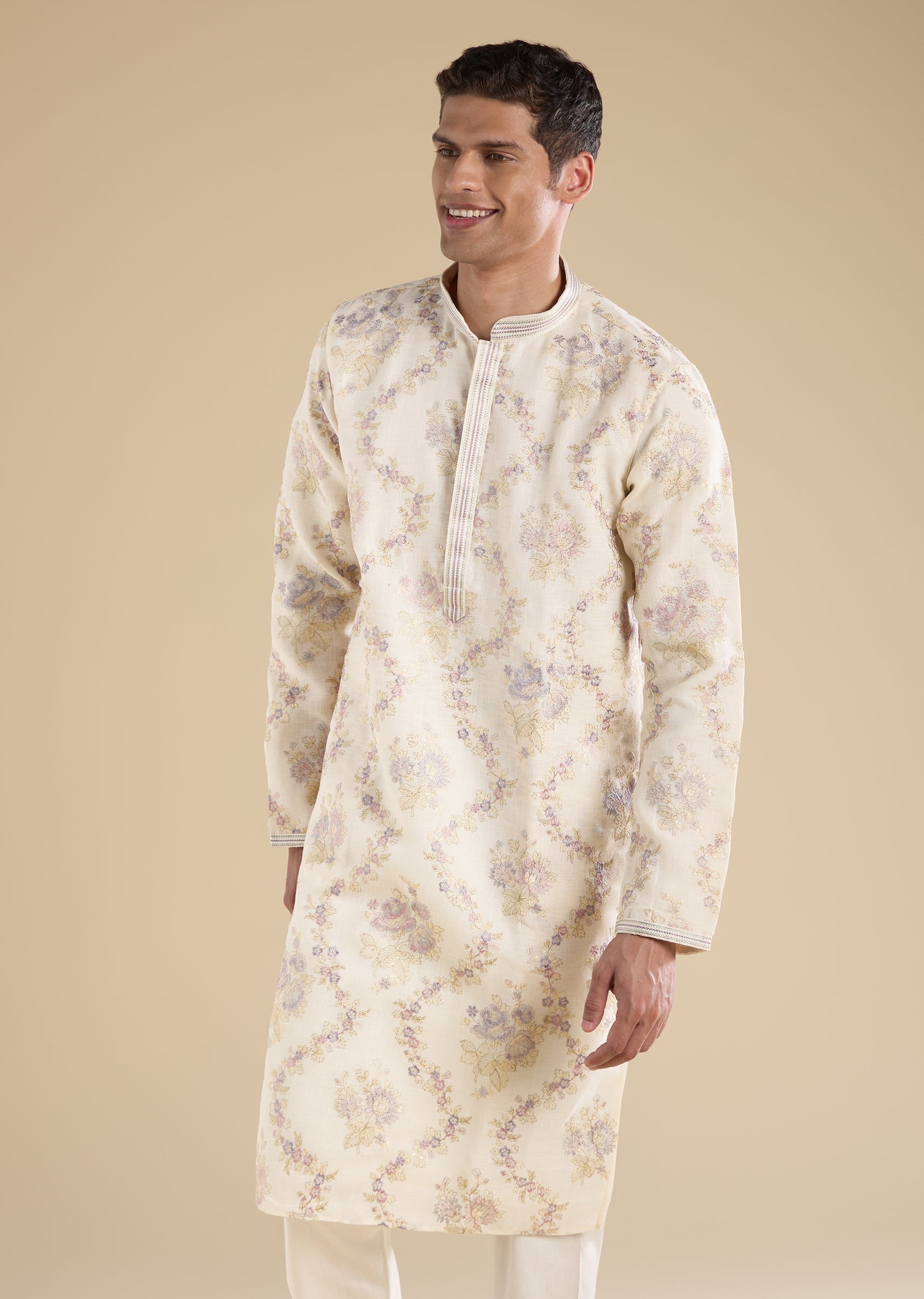 Graceful and timeless, this cream kurta set is designed for pooja and festive occasions. Crafted in a soft silk base, it features a mandarin collar, full sleeves, and subtle resham... More Product Details
