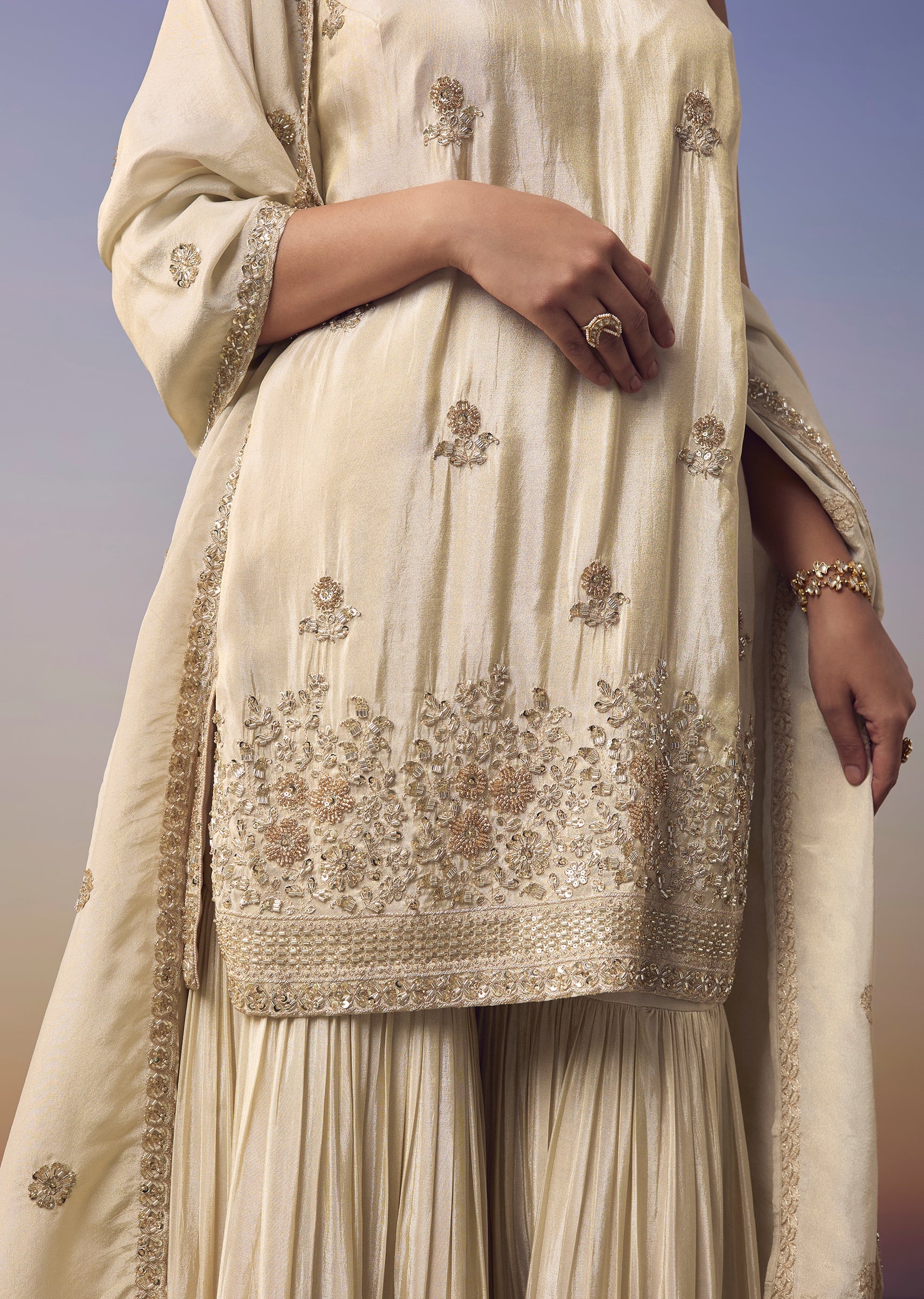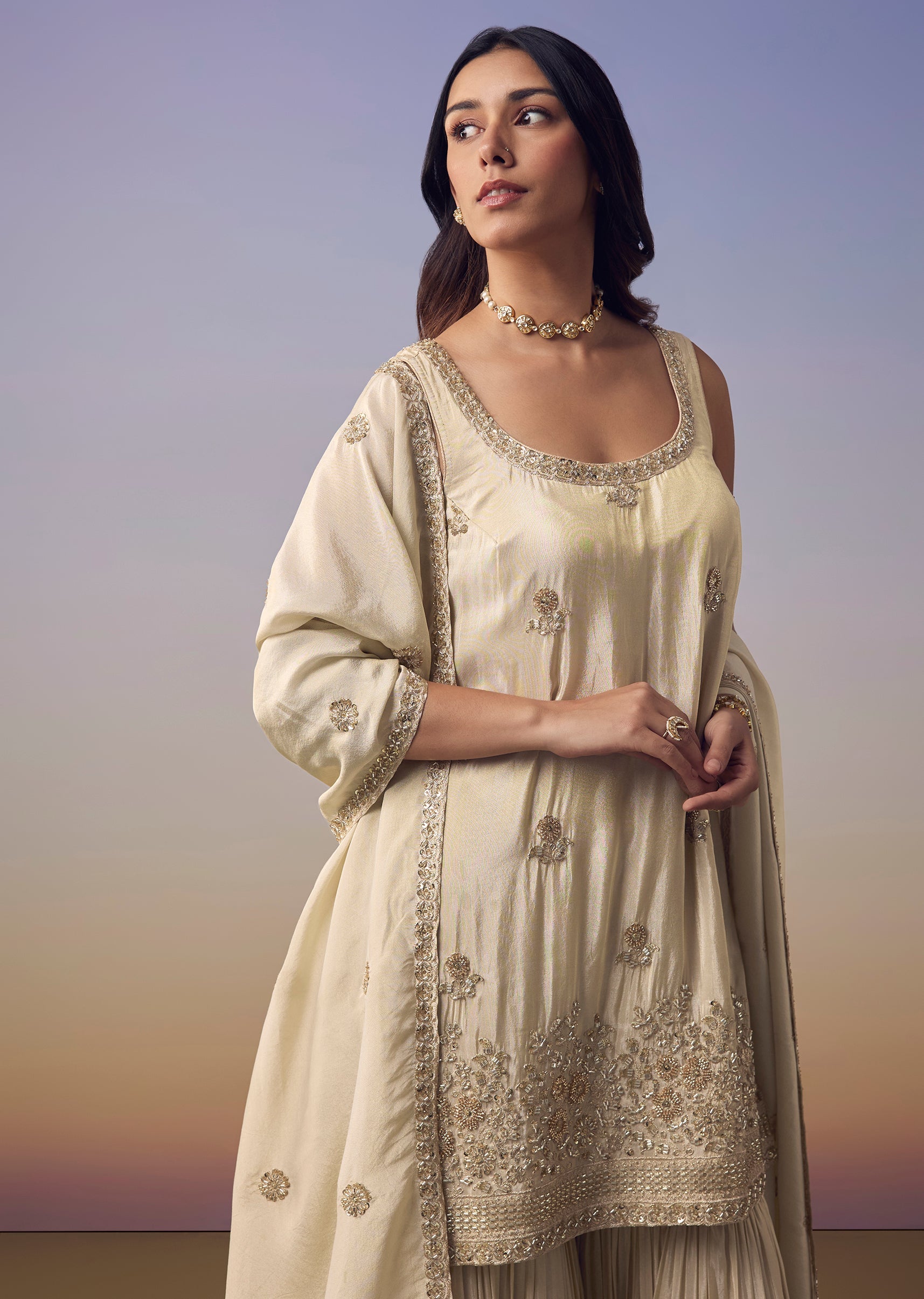 Cream Embroidered Kurta Sharara Set
