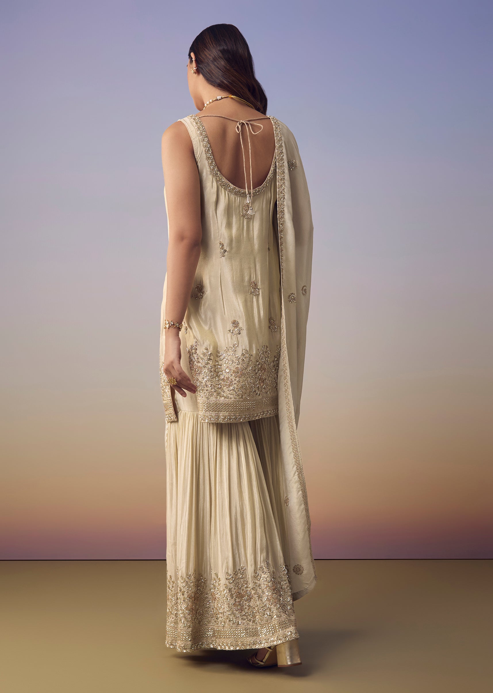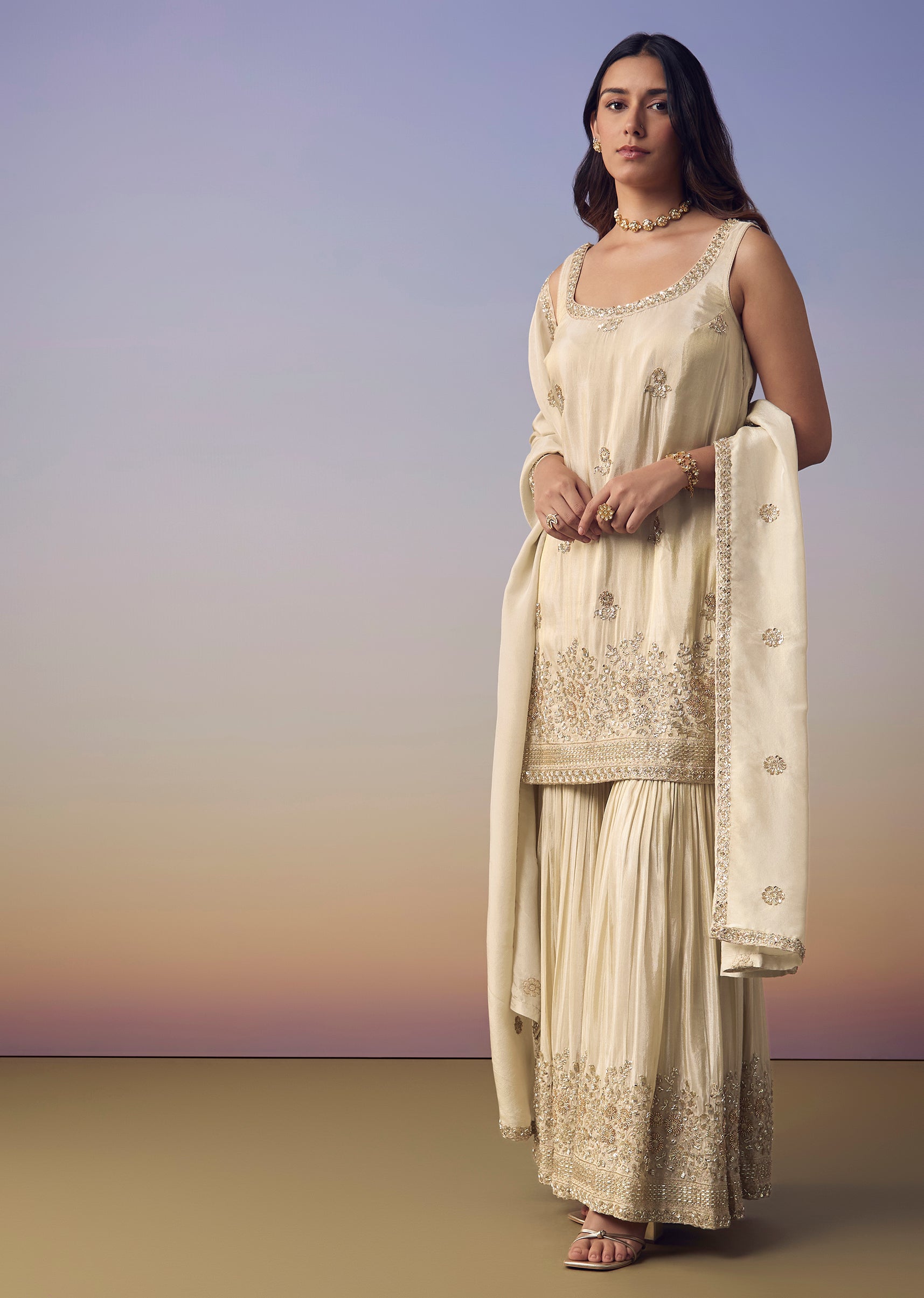 Celebrate in effortless elegance with this tissue kurta and sharara set embellished with delicate bead work, shimmering sequins, and fine embroidery that add a refined festive glow. The sleeveless round... More Product Details