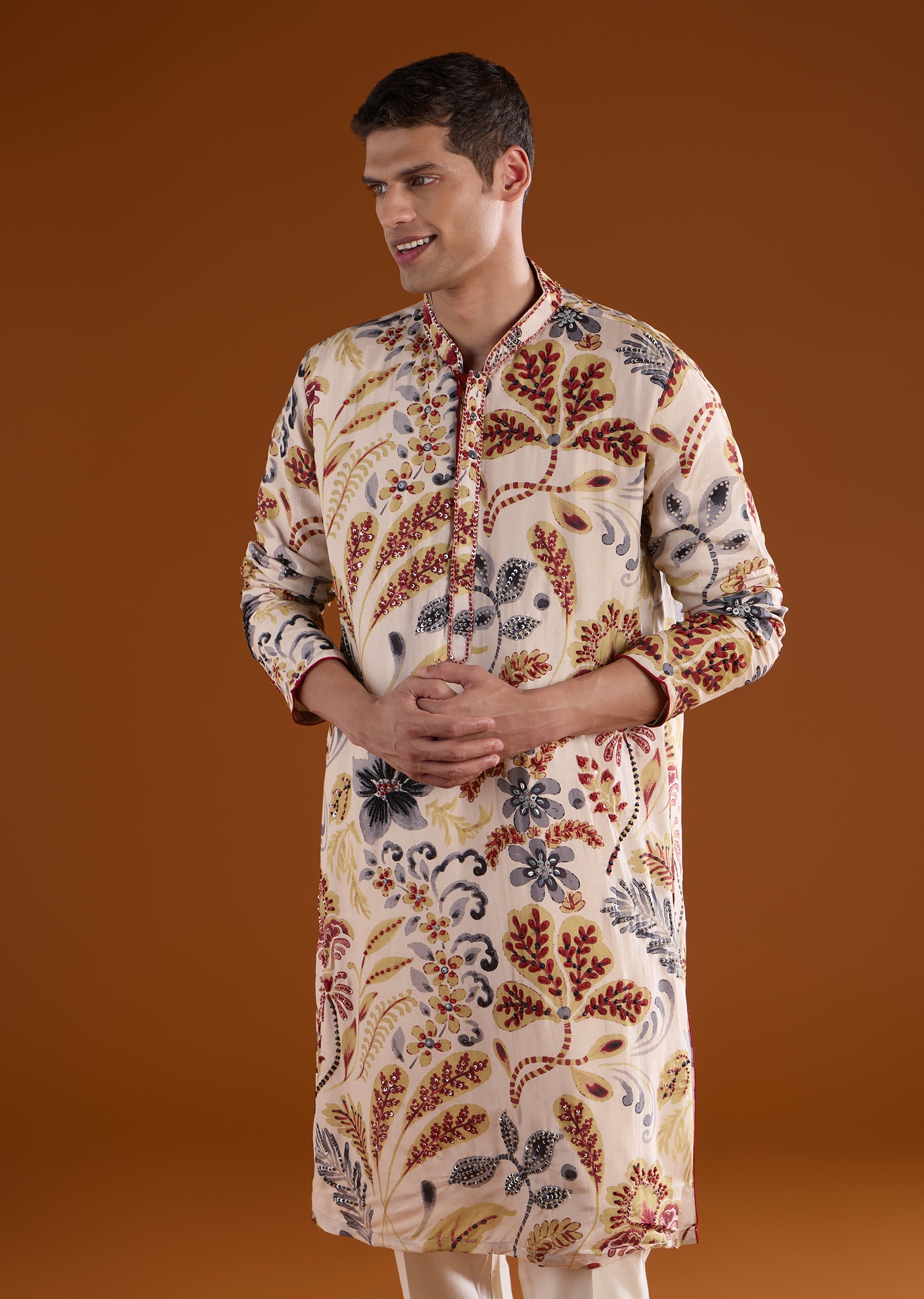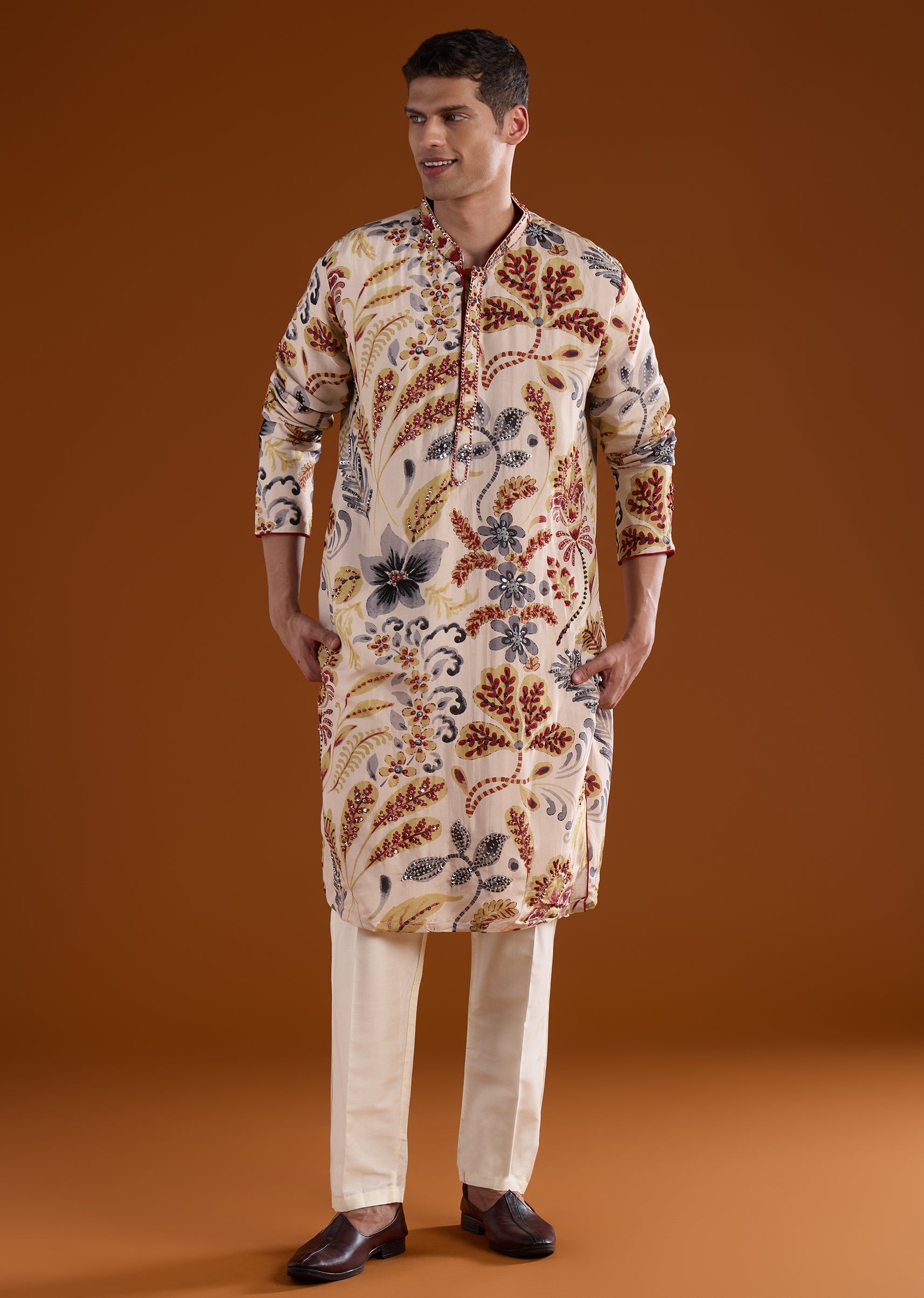 Gracefully festive with delicate detailing, this cream kurta set is crafted in rich rawsilk for an elevated traditional look. The kurta features a mandarin collar, full sleeves, and side slits,... More Product Details